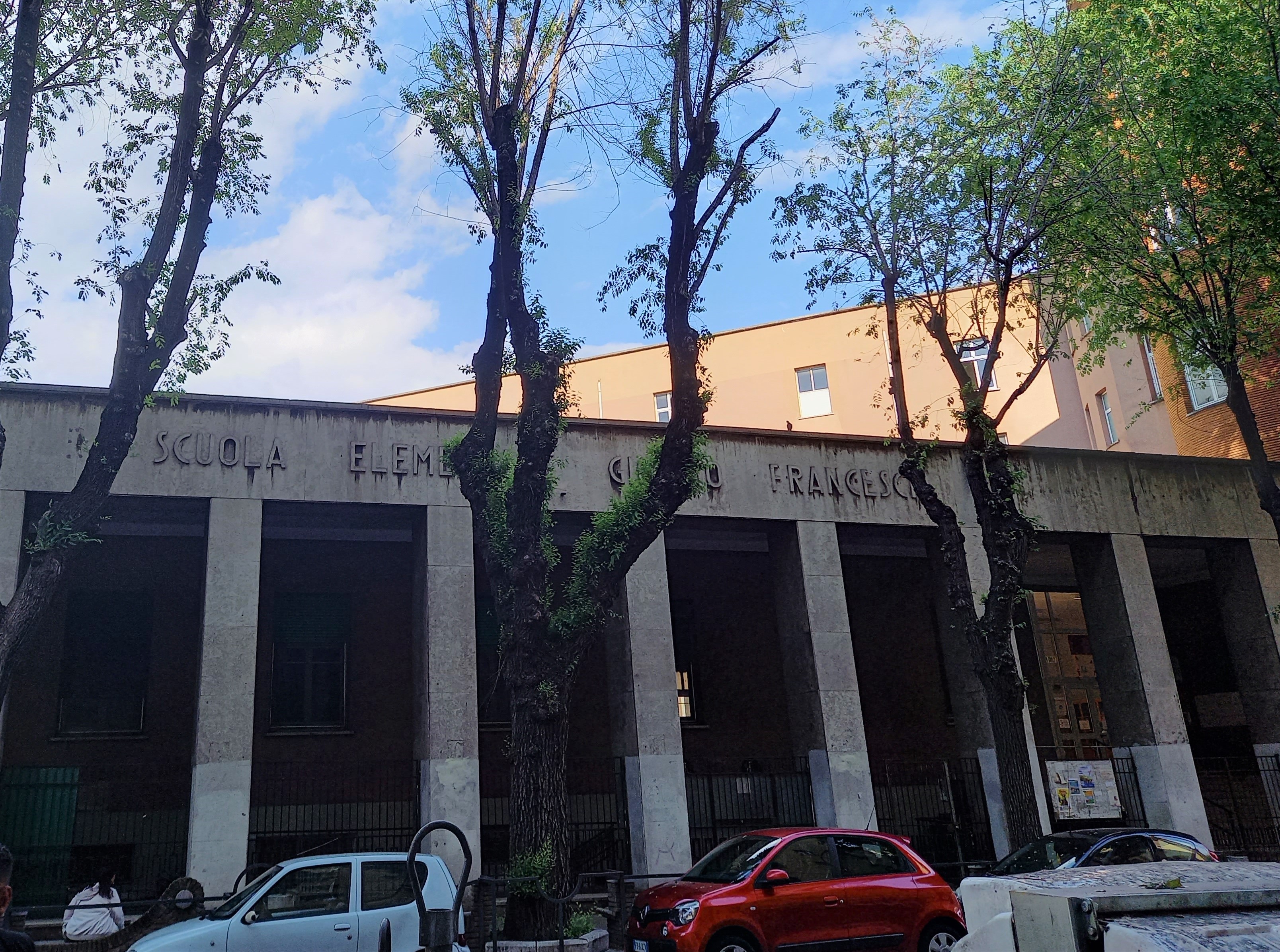 Tornando verso Monteverde nuovo, si può vedere ancora la scuola elementare Franceschi, proprio quella dove abitavano il Riccetto e Marcello, che muore dopo una lunga agonia in ospedale per le lesioni subite durante il crollo del 1951. All’epoca i Grattacieli si trovavano al fondo di una valle tra Monteverde Vecchio e Monteverde Nuovo e la strada da Ponte Bianco era una specie di sentiero, mentre via Donna Olimpia scendeva verso i grattacieli e si fermava poco oltre, proprio qui presso la scuola Franceschi, costruita nel 1939 di fronte ai grattacieli, e allora piena di sfollati della guerra. La scuola è piuttosto imponente, con ampio portico a pilastri. Anche Silvio “Er Pecetto” ha vissuto provvisoriamente qui con la sua famiglia per via delle lesioni alla vecchia casa dovute ai bombardamenti di San Lorenzo.