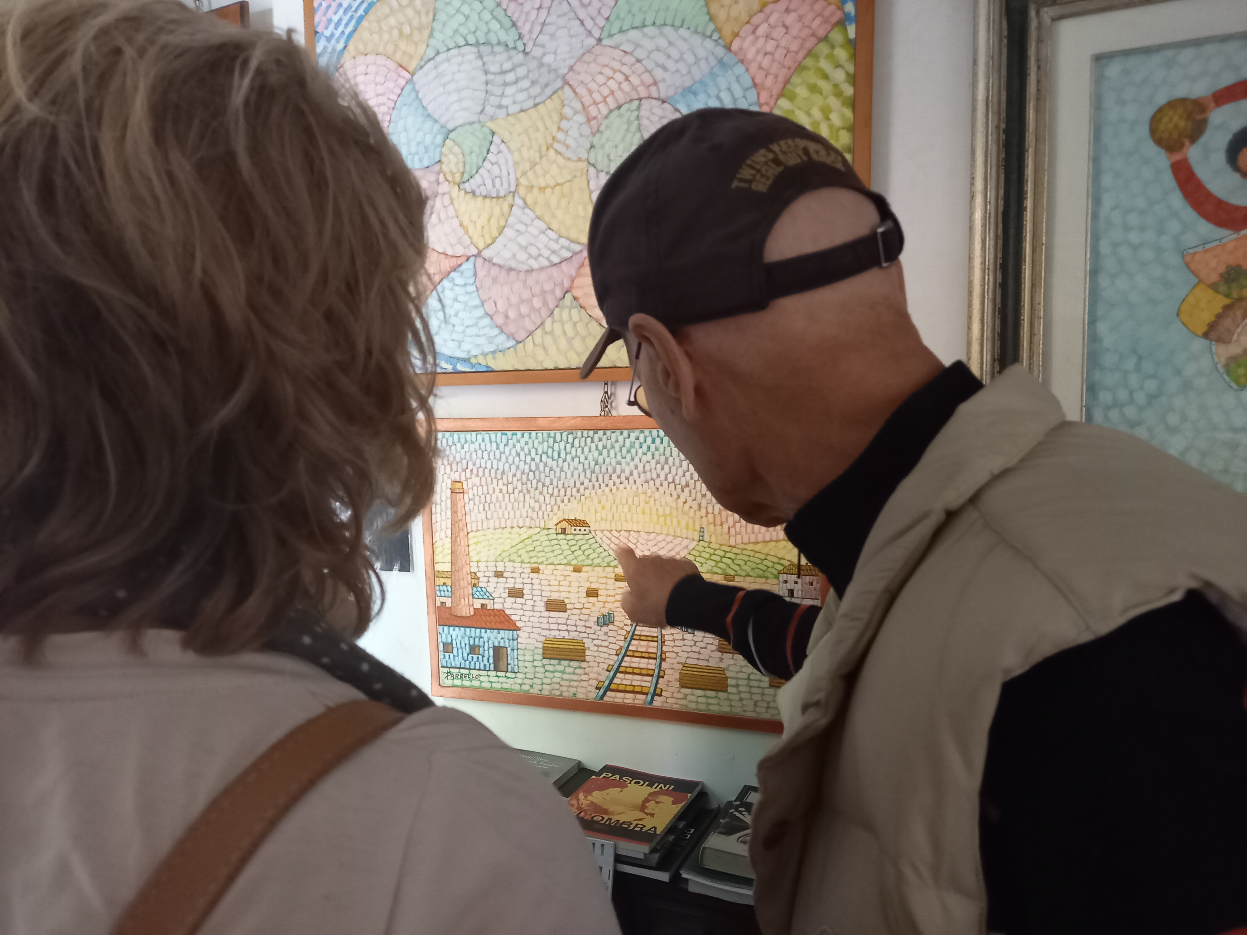 Abbiamo concluso l’incontro con lui nel suo piccolo studio di via Ozanam, dove le immagini e i memorabilia pasoliniani convivono con i suoi quadri. Come pittore ha uno stile che ricorda un po’ Chagall (e lui non nega che qualcosa di chagalliano ci sia, come ispirazione), ma con una tecnica a mosaico che è effettivamente tutta sua. E anche come poeta non è niente male. Sentitelo declamare questa sua poesia dedicata all’aquilone.