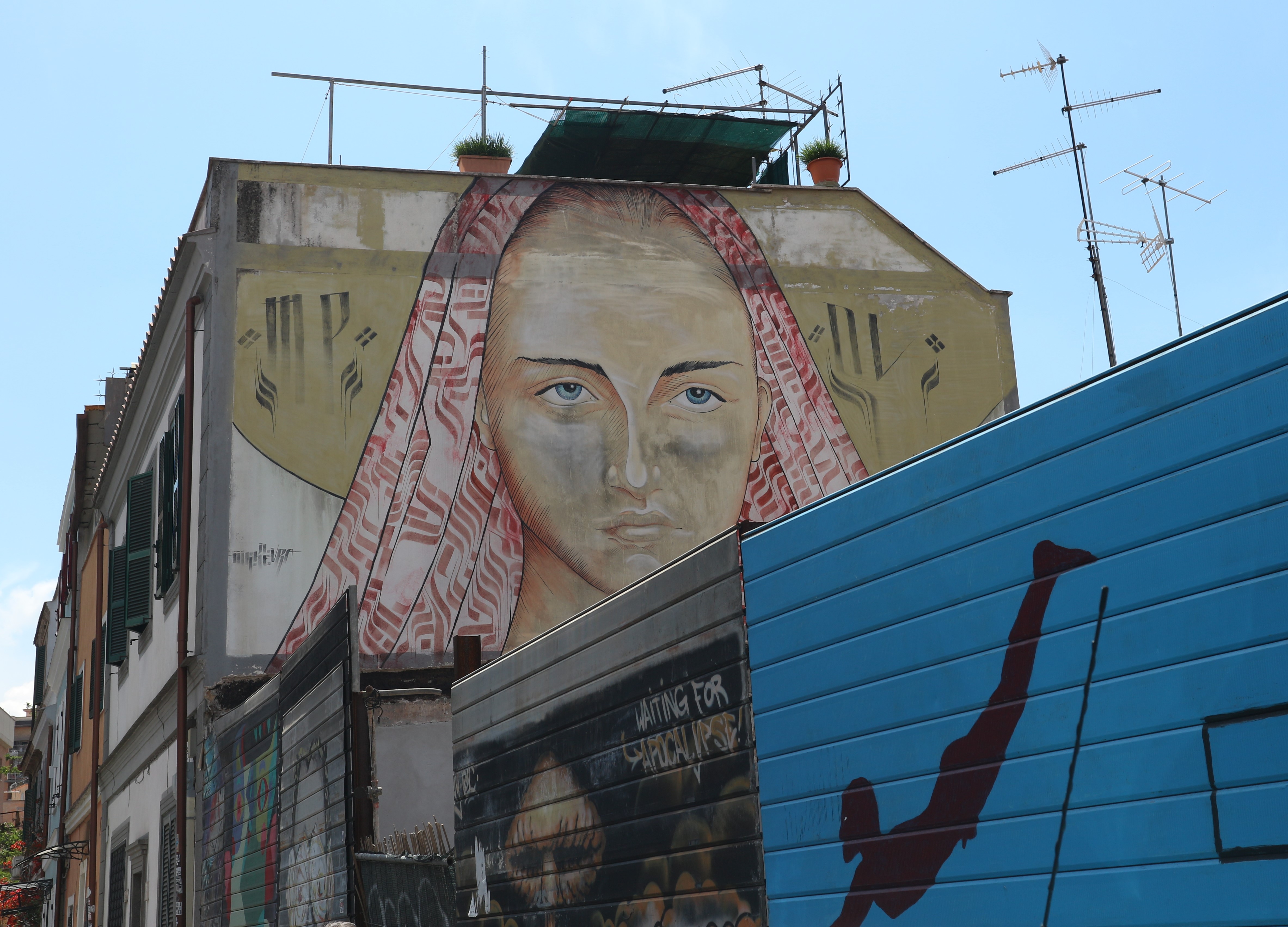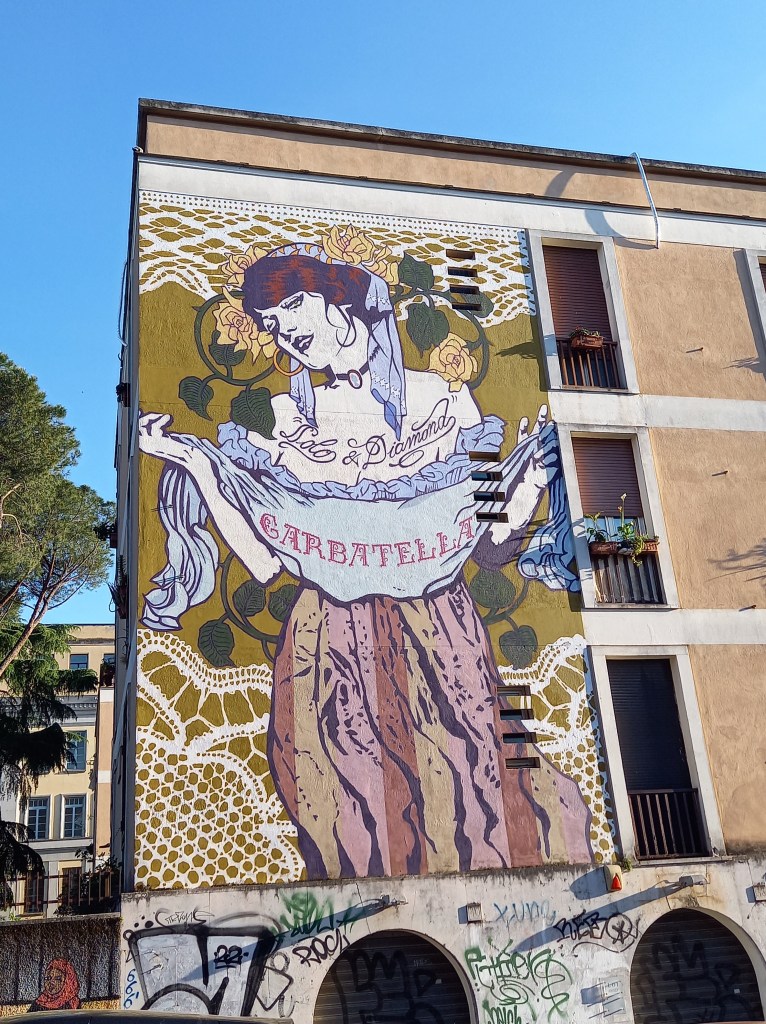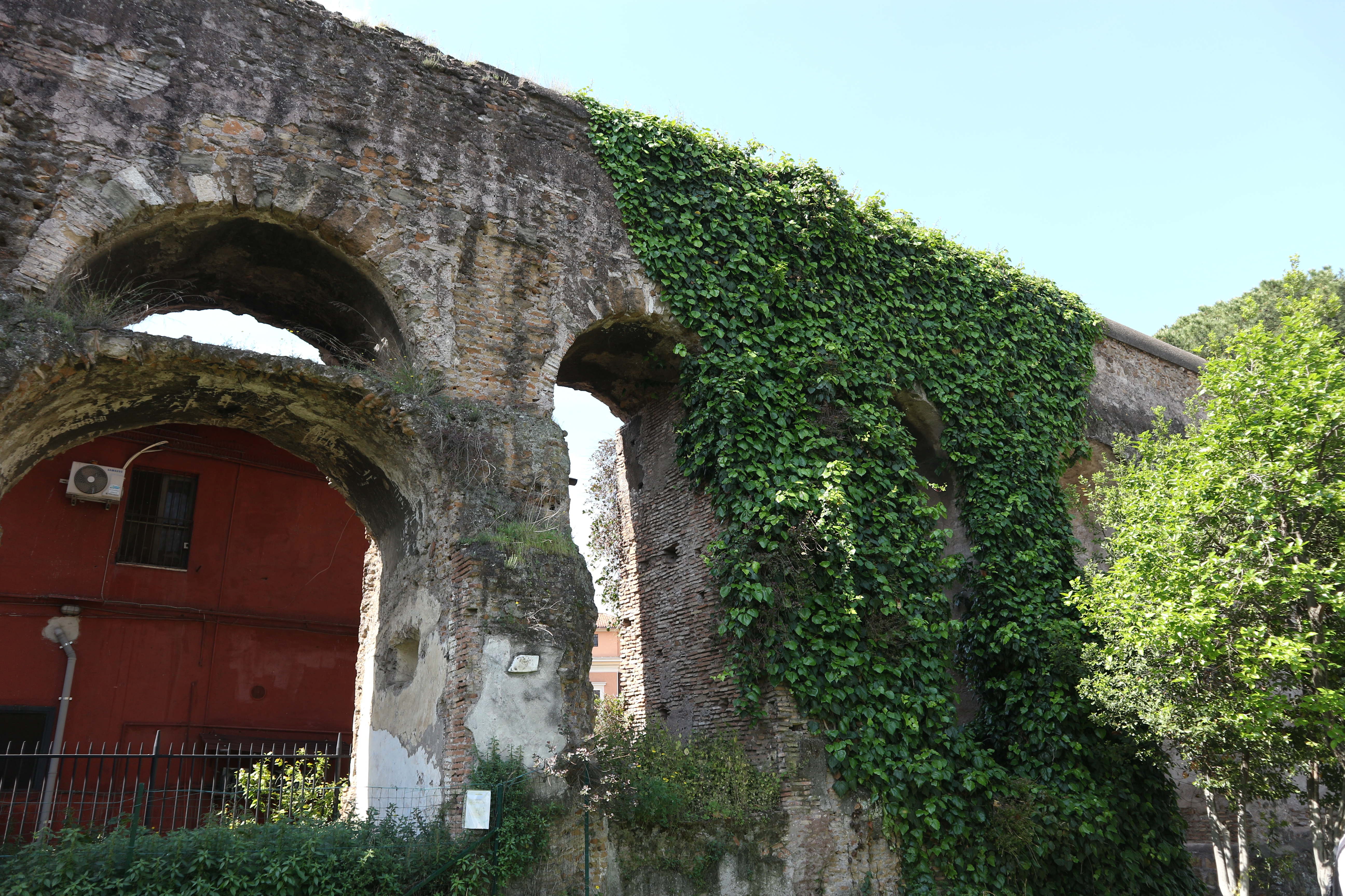 Dopo questa pausa, che ci voleva perché il sole picchia e comincia a far caldo, salutiamo Marta che ha altri impegni e proseguiamo lungo il Mandrione, dove sotto gli archi dell’acquedotto sono visibili le tracce delle baracche costruite nel dopoguerra e abitate per diversi anni. In uno di questi vani è stata realizzata nel 2015 un’opera di sticker art (fatta cioè con adesivi) dello street artist francese Zilda. Raffigura una scena di Salò o le 120 giornate di Sodoma, l’ultimo film di Pasolini, e fa parte di un progetto artistico più ampio che prevedeva la creazione di queste figure tratte dagli ultimi film pasoliniani in diversi luoghi iconici di Roma. Questa è l’unica sopravvissuta perché protetta dalle sbarre, mentre le altre sono state tutte strappate, che è un po’ il destino della sticker art.