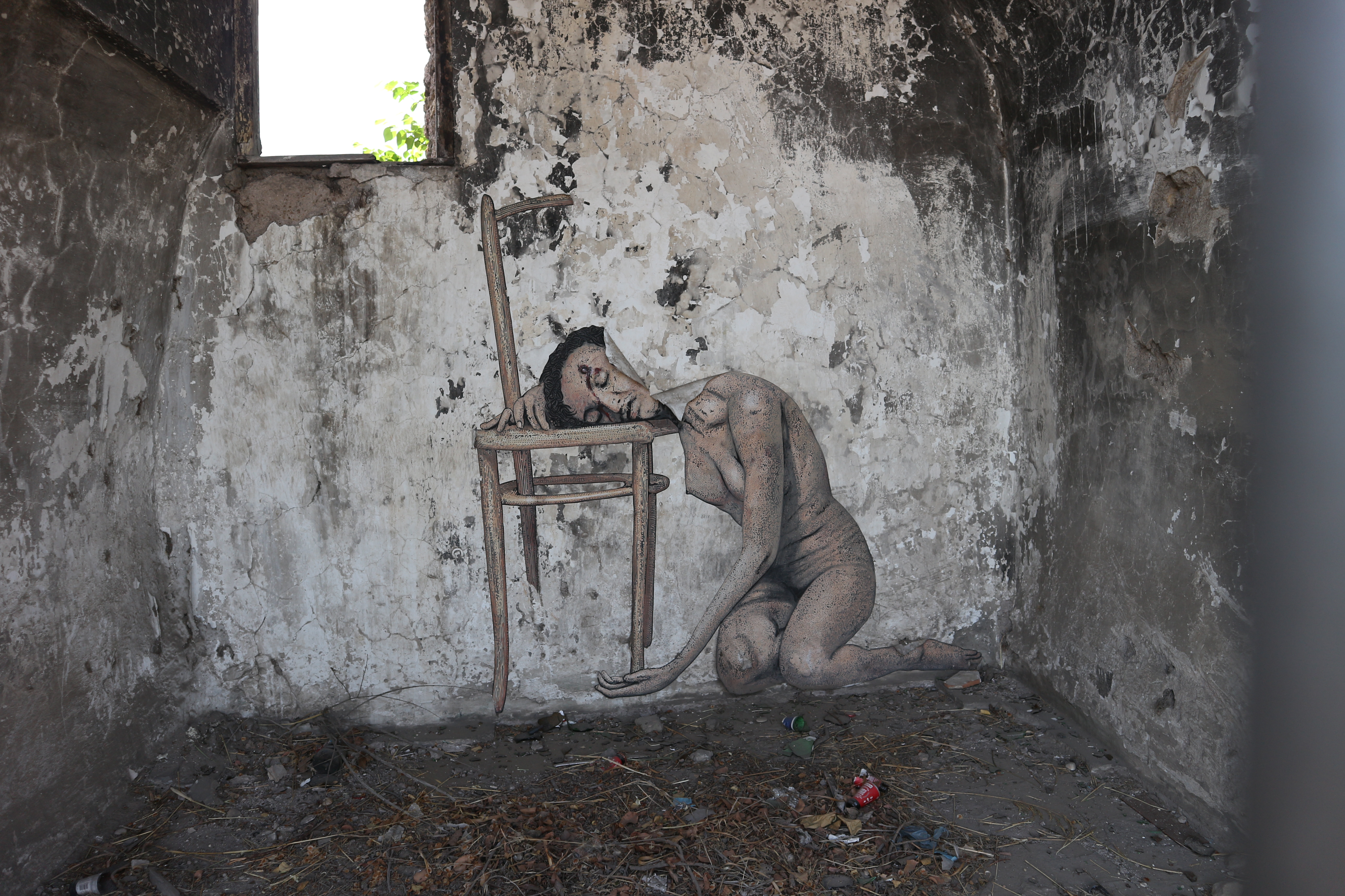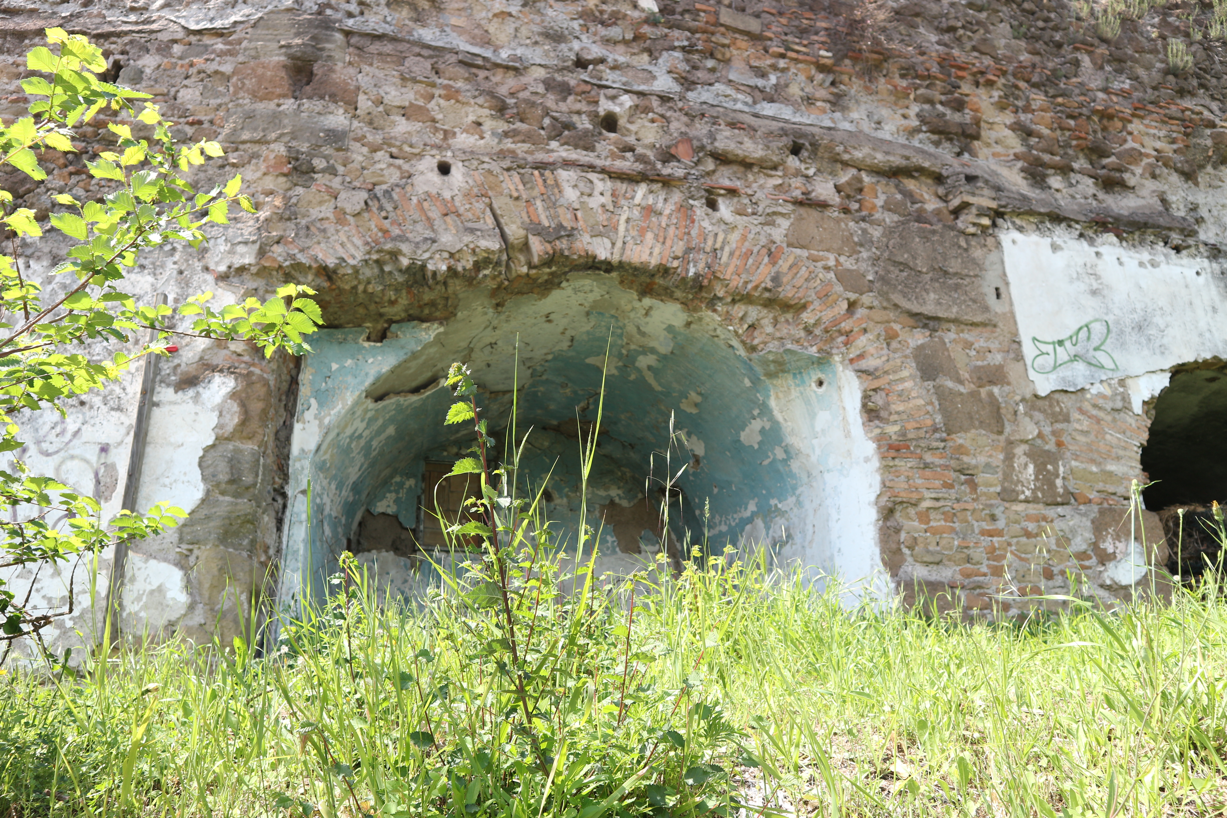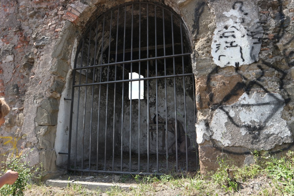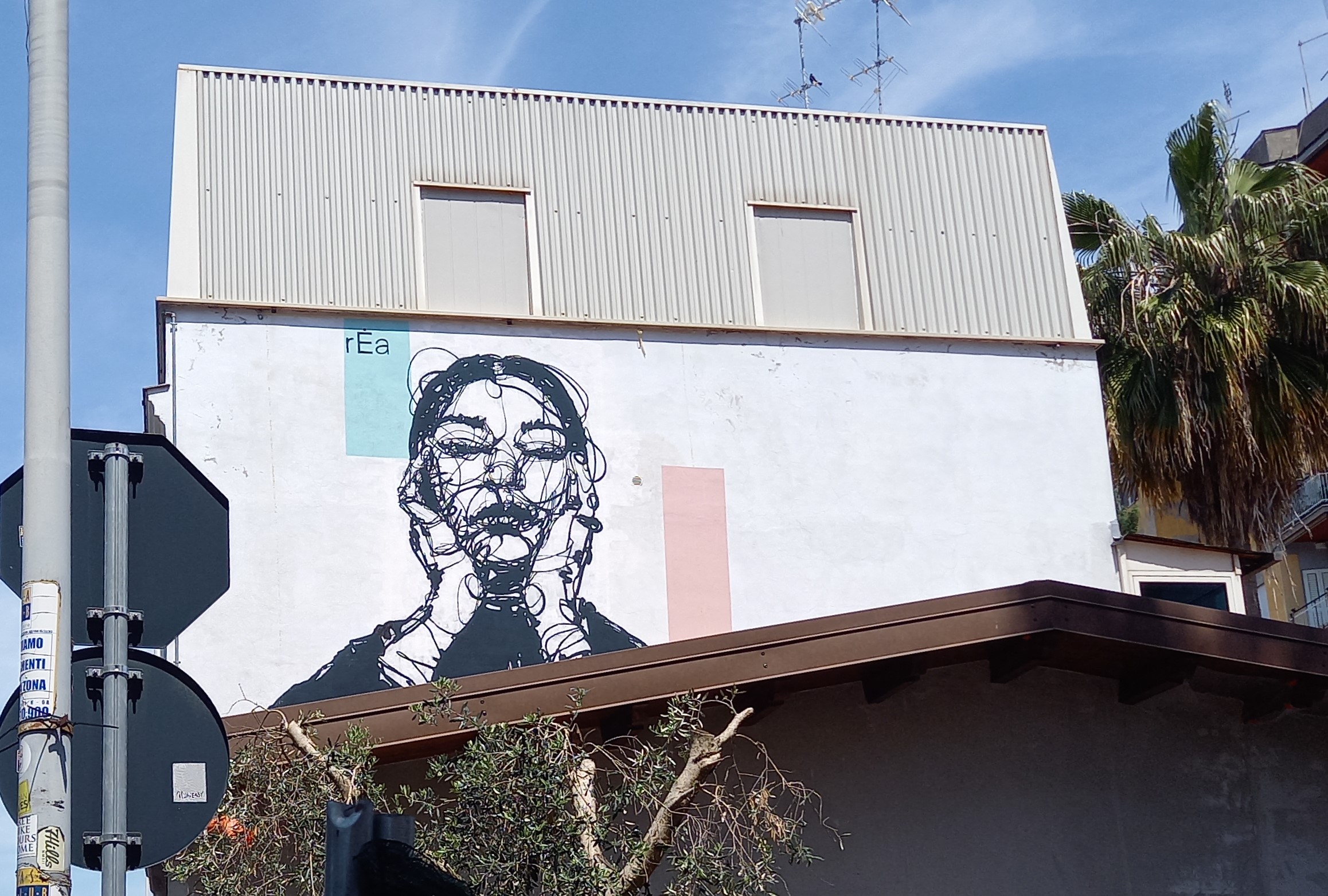 Dopo questa pausa, che ci voleva perché il sole picchia e comincia a far caldo, salutiamo Marta che ha altri impegni e proseguiamo lungo il Mandrione, dove sotto gli archi dell’acquedotto sono visibili le tracce delle baracche costruite nel dopoguerra e abitate per diversi anni. In uno di questi vani è stata realizzata nel 2015 un’opera di sticker art (fatta cioè con adesivi) dello street artist francese Zilda. Raffigura una scena di Salò o le 120 giornate di Sodoma, l’ultimo film di Pasolini, e fa parte di un progetto artistico più ampio che prevedeva la creazione di queste figure tratte dagli ultimi film pasoliniani in diversi luoghi iconici di Roma. Questa è l’unica sopravvissuta perché protetta dalle sbarre, mentre le altre sono state tutte strappate, che è un po’ il destino della sticker art.