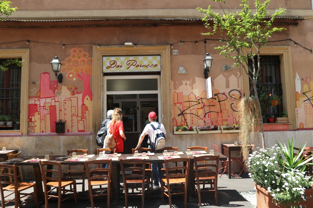 Noi, così, abbiamo chiuso il nostro percorso pasoliniano e perciò salutiamo la bravissima Gabriella che ci ha guidato come meglio non si poteva. Pranzeremo sempre qui al Pigneto in un posto che si chiama Dar Parucca ed è un’osteria romana, casereccia e biologica. Il nome deriva dal soprannome affibbiato a Luca, che con Alessandro è uno dei due proprietari, provenienti entrambi dal mondo dei fumetti.