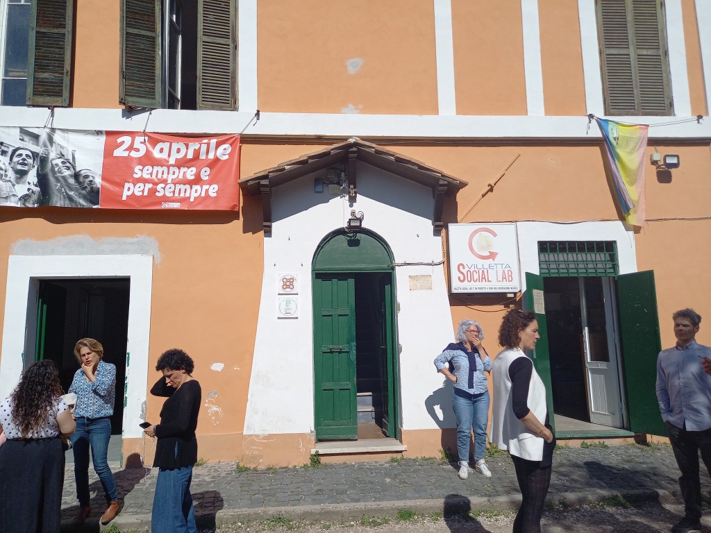 Ci troviamo a “La Villetta social lab”, una realtà che nasce nel 2015 all’interno della Villetta, costruita come Casa del Fascio e, per contrappasso, dal 1944 sede storica di quartiere dei partiti della Sinistra (fino agli anni ’80 era la sezione del PCI, poi PDS, DS ecc.). Fu presa dai partigiani il giorno prima dell’arrivo degli americani a Roma, nel giugno 1944. Villetta Social Lab nasce come un incubatore di progetti di mutualismo, partecipazione e condivisione rivolti agli abitanti del quartiere e non solo. Opera per l’animazione sociale e culturale, per diventare un laboratorio di idee e di pratiche tese ad organizzare progetti volti al miglioramento delle condizioni di vita nel territorio. Attraverso corsi formativi a costi popolari, sportelli di supporto su tematiche sociali e culturali e attività culturali gratuite, promuove cultura, buona socialità, qualità delle relazioni umane e degli stili di vita, pratica dei diritti e partecipazione.