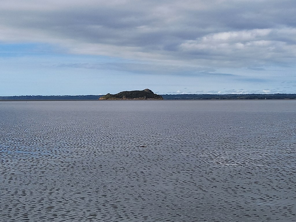 Noi però, anche per fuggire per quanto possibile dalla pazza folla, abbiamo in programma di visitare l’abbazia soltanto questa sera, dopo l’arrivo dell’alta marea: il livello massimo è previsto alle 21.18. Ora, nel pomeriggio, la marea è bassa e noi ne approfitteremo per camminare in quello che poi ritornerà dominio del mare fino all’isola di Tombelaine, che è più grande dello stesso Mont Saint-Michel dal quale dista circa 3,5 km. Percorreremo quindi dai 7 agli 8 km a piedi nudi nelle sabbie melmose della baia, cosa che non è consigliabile fare da soli per cui anche noi abbiamo la nostra guida: siamo inseriti in un nutrito gruppo con il bel Kevin, che nell’attesa degli ultimi ritardatari regala battute con aria da piacione. Kevin parla solo francese ma noi qualcosa capiamo e, per quello che non capiamo, c’è Viola pronta a tradurre. La quale Viola ci ha anche avvertito di mettere costume da bagno e/o pantaloni corti, massimo bermuda (per fortuna il tempo lo consente) e di portare un asciugamano e una borraccia.