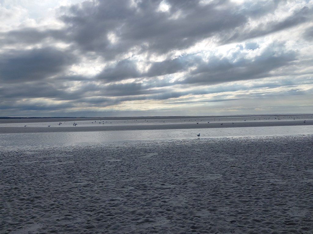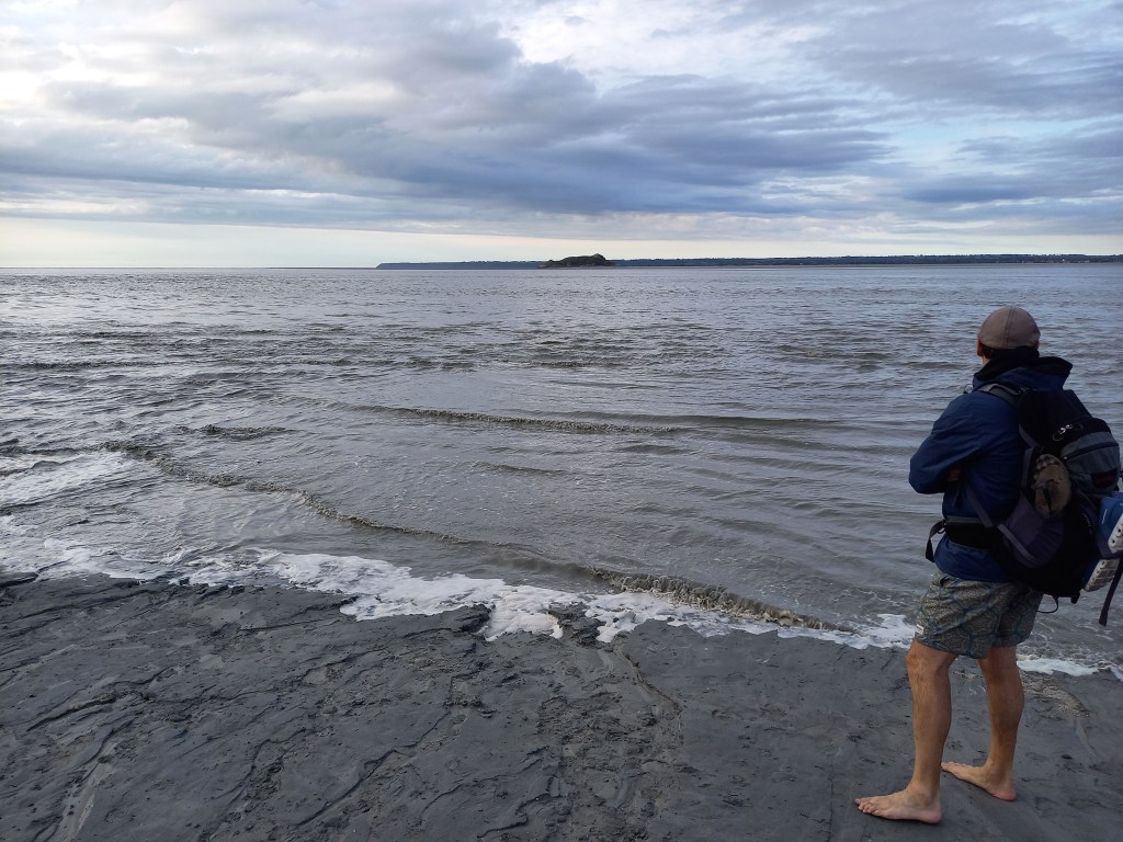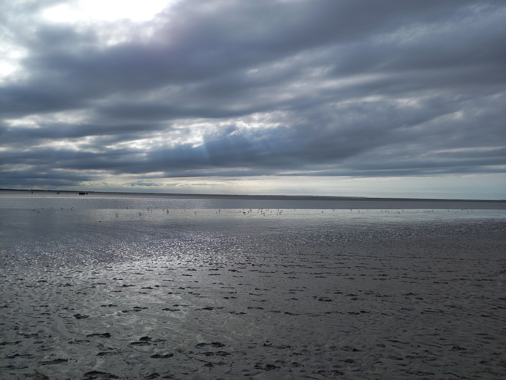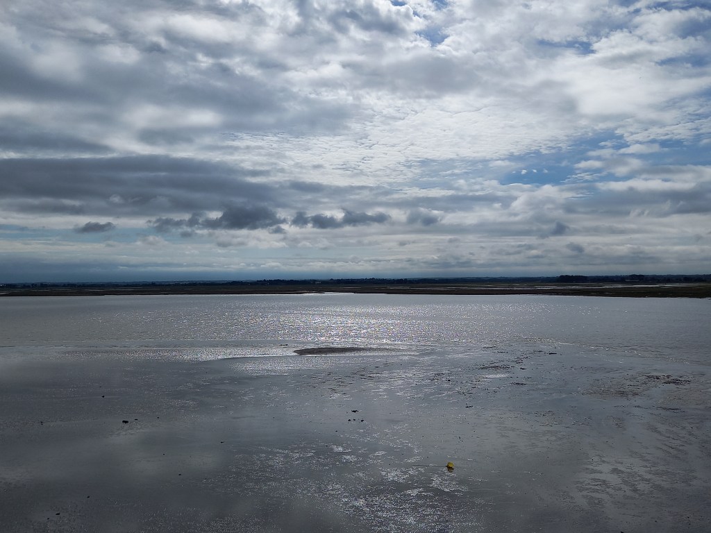 Il gruppo è finalmente completo e si parte. Nella baia sfociano tre fiumi (Sée, Sélune e Couesnon), i detriti dei quali formano i sedimenti inferiori; i sedimenti in superficie, su cui stiamo camminando, si trovano tra terra e mare: questa zona è ricca di strati di torba alternati a sabbia calcarea (gusci di conchiglie tritati). Di conchiglie se ne trovano tante, e abbiamo infatti scoperto che l’associazione simbolica tra il pellegrinaggio e la conchiglia è nata proprio qui, si dice prima ancora che a Santiago de Compostela, perché tra i pellegrini che arrivavano (Mont Saint-Michel è da sempre una delle principali mete di pellegrinaggio della cristianità) si diffuse l’abitudine di prendere una conchiglia da tenere per ricordo.