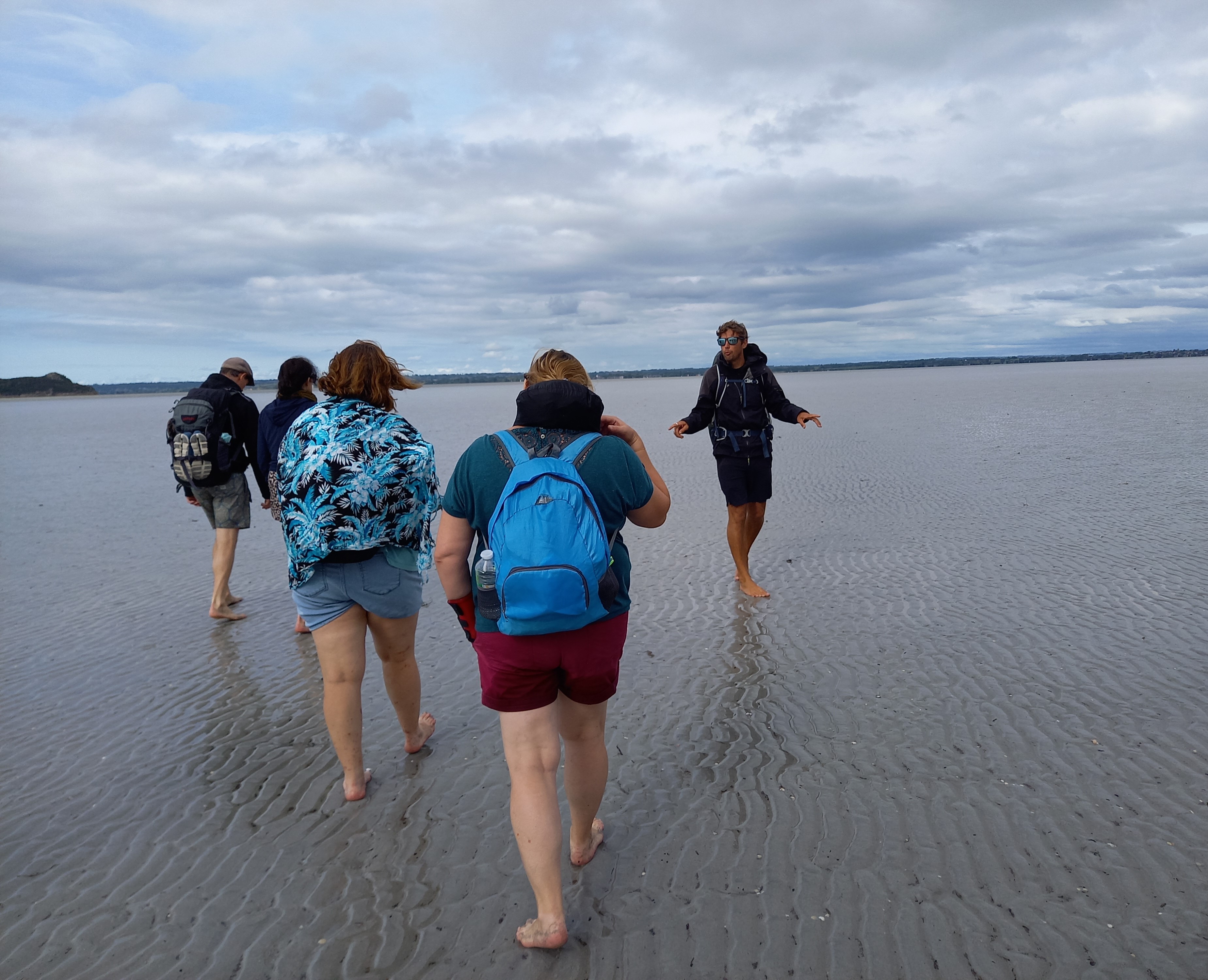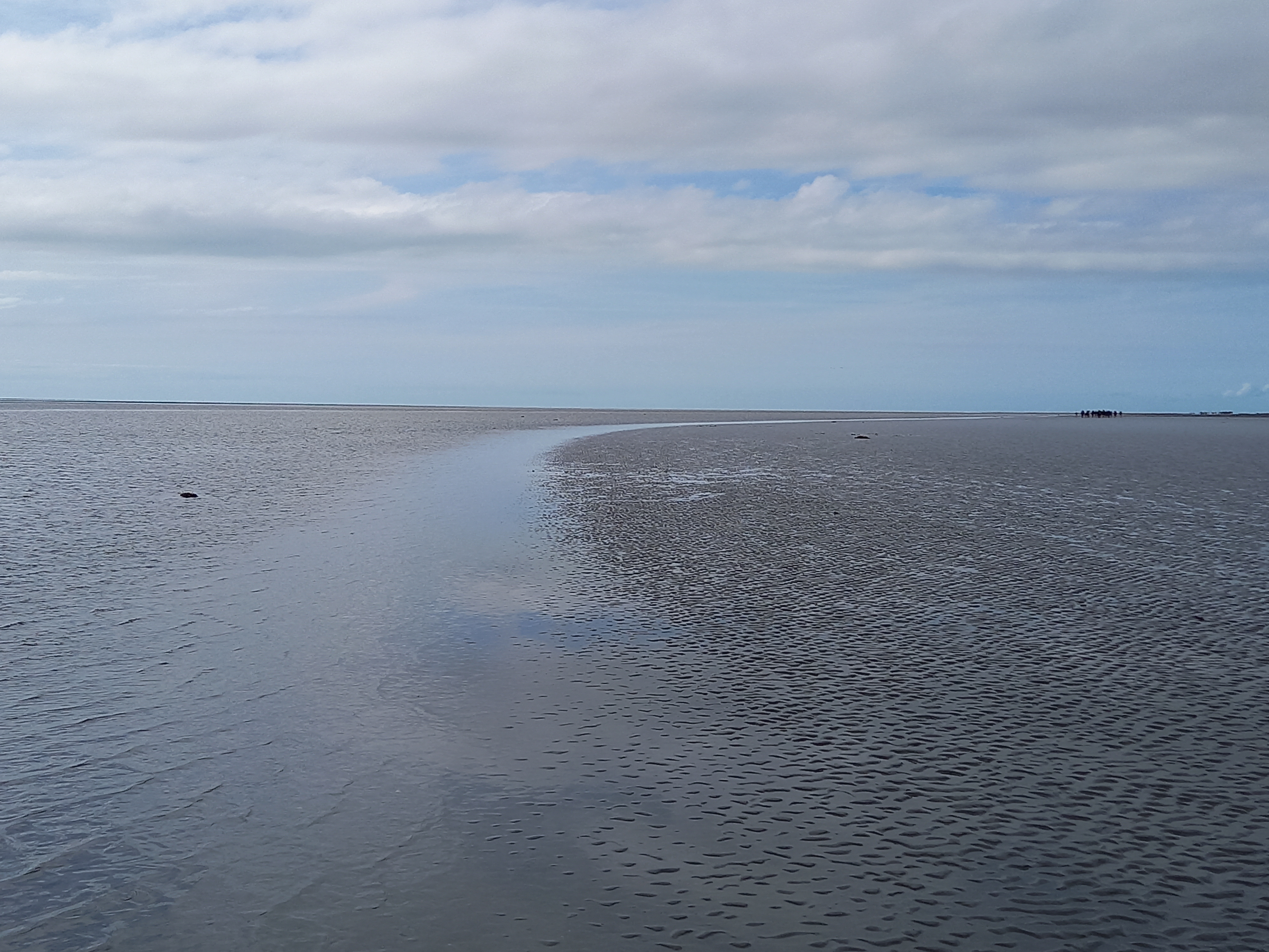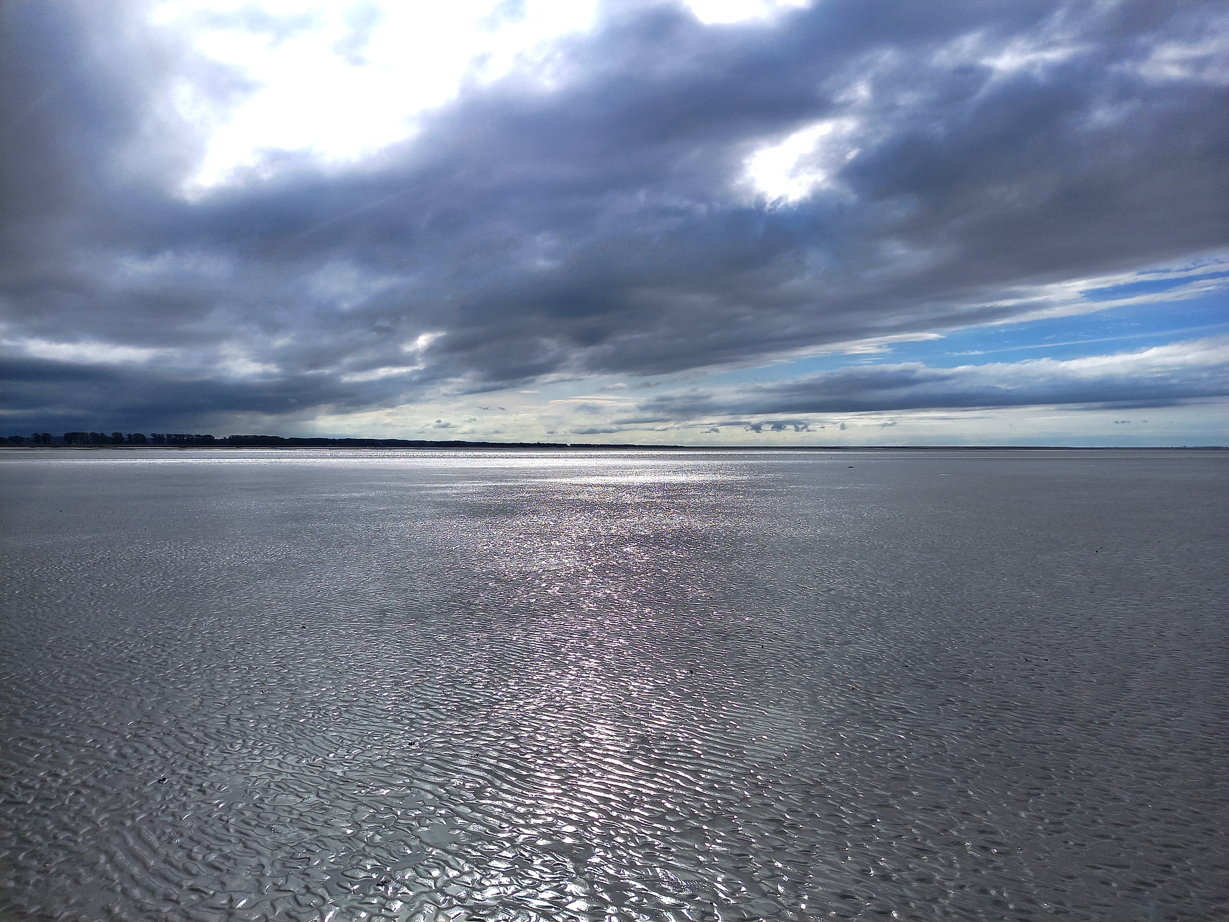 Il gruppo è finalmente completo e si parte. Nella baia sfociano tre fiumi (Sée, Sélune e Couesnon), i detriti dei quali formano i sedimenti inferiori; i sedimenti in superficie, su cui stiamo camminando, si trovano tra terra e mare: questa zona è ricca di strati di torba alternati a sabbia calcarea (gusci di conchiglie tritati). Di conchiglie se ne trovano tante, e abbiamo infatti scoperto che l’associazione simbolica tra il pellegrinaggio e la conchiglia è nata proprio qui, si dice prima ancora che a Santiago de Compostela, perché tra i pellegrini che arrivavano (Mont Saint-Michel è da sempre una delle principali mete di pellegrinaggio della cristianità) si diffuse l’abitudine di prendere una conchiglia da tenere per ricordo.