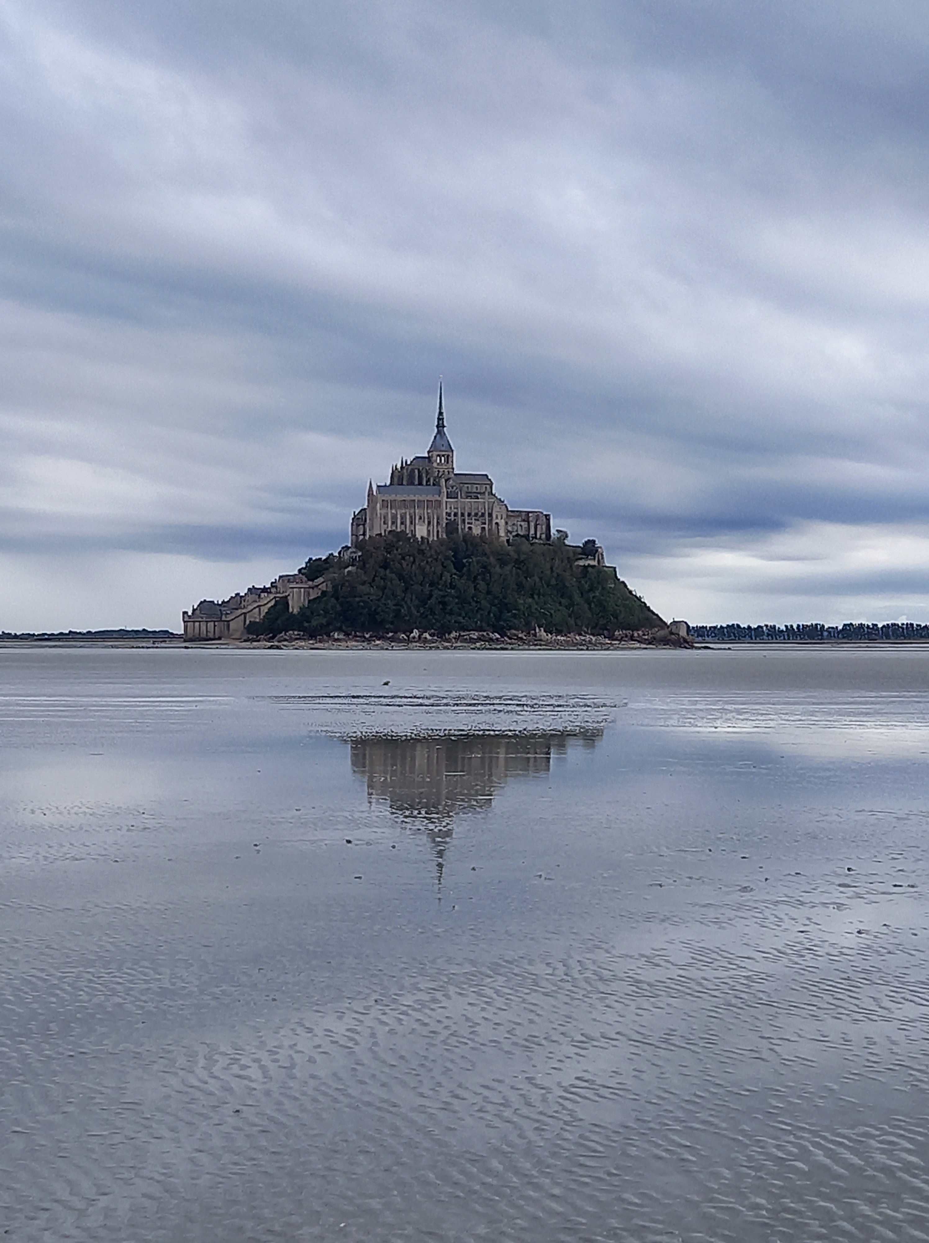 Ora siamo alla fermata del bus-navetta che porta alla vera Mont Saint-Michel, quella che è un’isola tidale, ossia un’isola che viene unita da una lingua di sabbia, che emerge e scompare a seconda delle maree, alla terraferma. È proprio per le sue maree che Mont Saint-Michel è famosa in tutto il mondo, e qui ne abbiamo la prova. Tra le persone in attesa, si sente parlare un melting pot di varie lingue: ci sono ovviamente francesi, ma anche spagnoli, inglesi, parecchi americani, gli immancabili giapponesi, e per la prima volta risentiamo parlare anche italiano. Oggi, 1° settembre, è un giorno cruciale per le maree, e infatti la nostra Viola non l’ha scelto a caso: il coefficiente della marea del pomeriggio di oggi è 112, il più alto dell’anno. Sarebbe complicato spiegare cosa significa e come si calcola questo coefficiente, perciò non mi ci avventurerò: in concreto, significa che oggi la differenza tra l’alta e la bassa marea sarà di ben 14 metri! Eh sì, dovete sapere che è possibile prevedere con un buon grado di accuratezza quale sarà l’andamento della marea, anche se questa può ovviamente essere influenzata dai fenomeni atmosferici: c’è una fantastica tabellina colorata dove si possono trovare gli orari e i coefficienti delle maree di tutti i giorni dell’anno. Ogni giorno ci sono due alte maree, una al mattino e una alla sera. I coefficienti così alti però si hanno solo da marzo a ottobre, e solo per un paio di giorni al mese, non di più. E questo è veramente il più alto di tutti, per quest’anno.