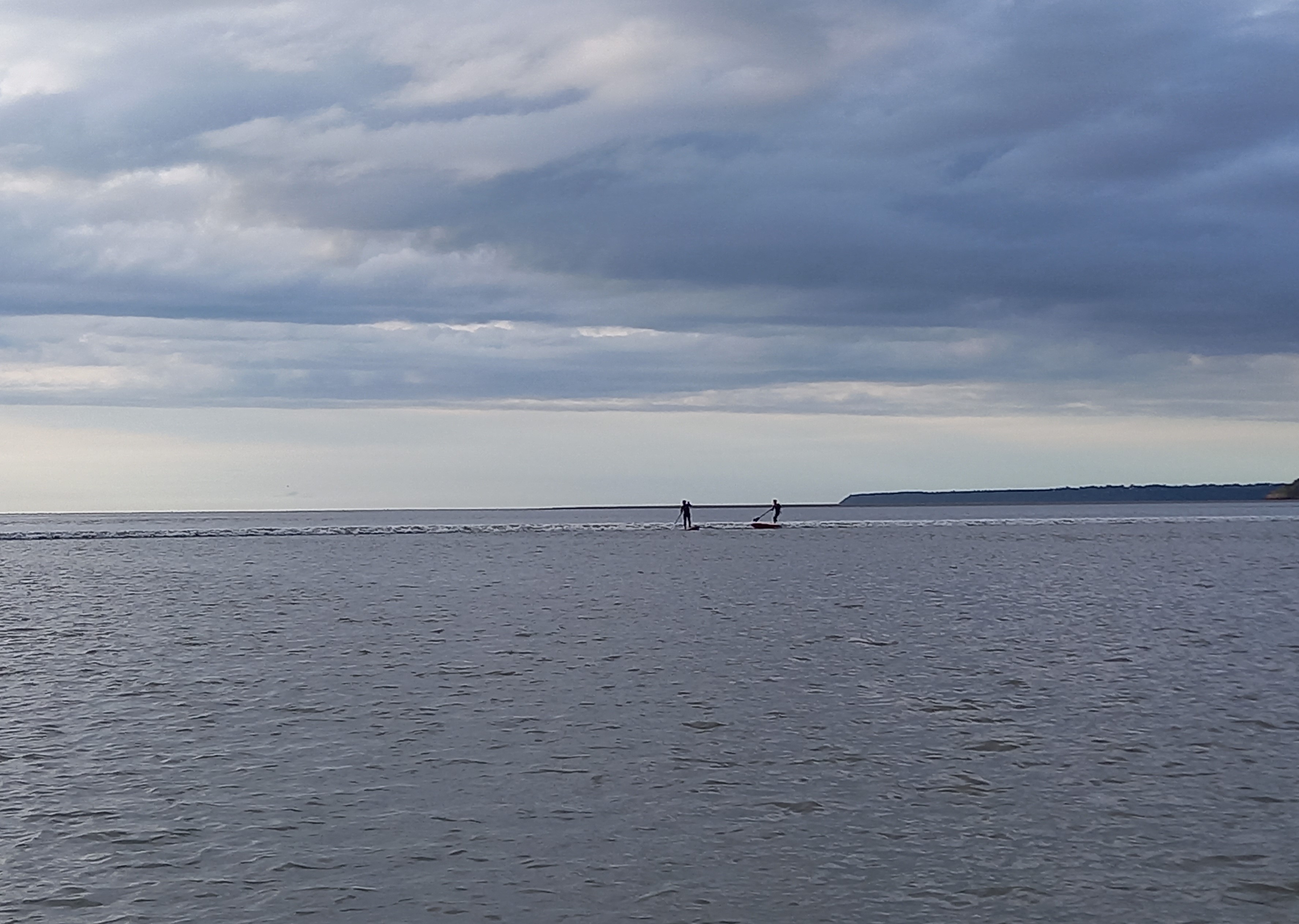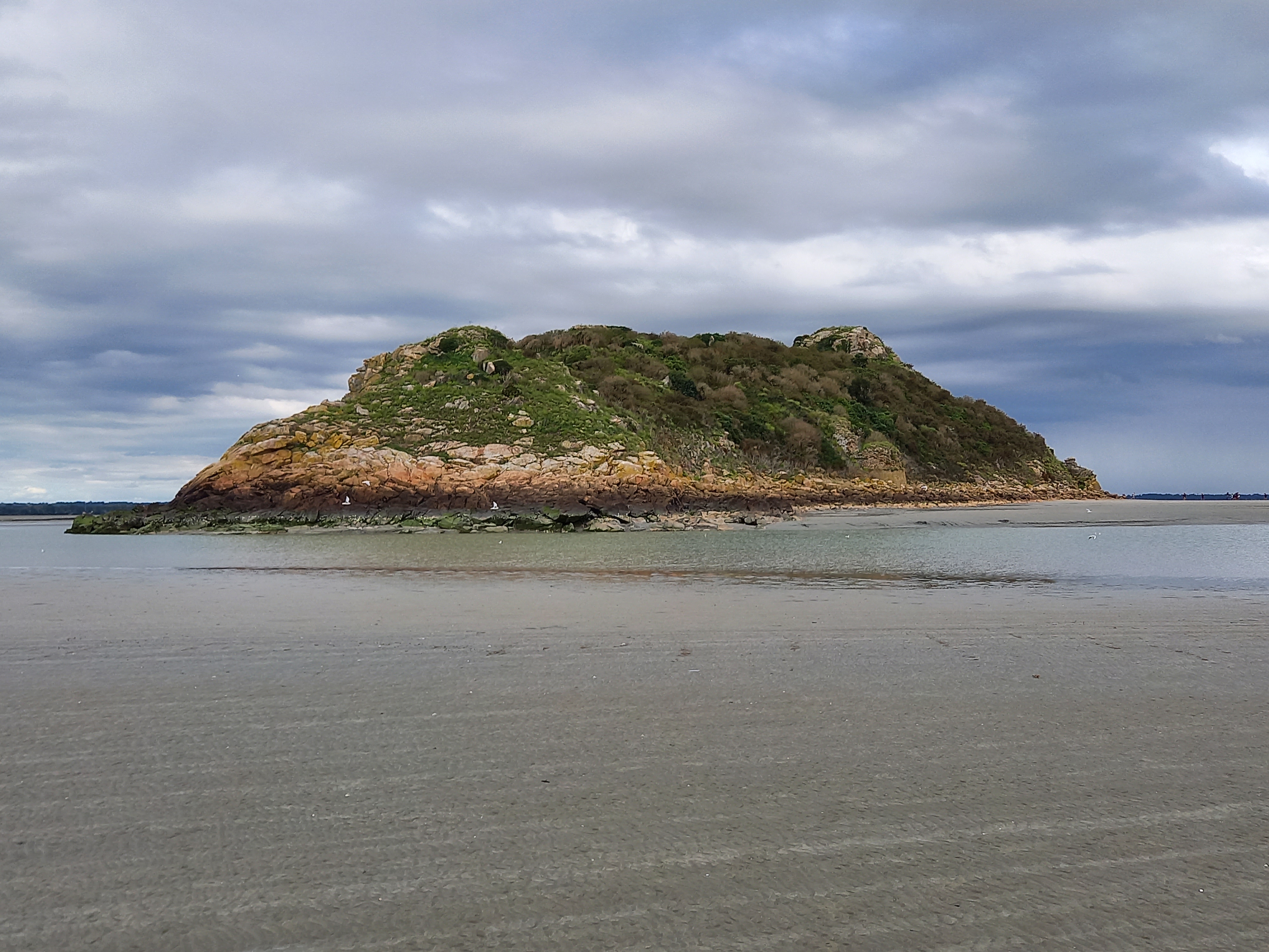 Noi però, anche per fuggire per quanto possibile dalla pazza folla, abbiamo in programma di visitare l’abbazia soltanto questa sera, dopo l’arrivo dell’alta marea: il livello massimo è previsto alle 21.18. Ora, nel pomeriggio, la marea è bassa e noi ne approfitteremo per camminare in quello che poi ritornerà dominio del mare fino all’isola di Tombelaine, che è più grande dello stesso Mont Saint-Michel dal quale dista circa 3,5 km. Percorreremo quindi dai 7 agli 8 km a piedi nudi nelle sabbie melmose della baia, cosa che non è consigliabile fare da soli per cui anche noi abbiamo la nostra guida: siamo inseriti in un nutrito gruppo con il bel Kevin, che nell’attesa degli ultimi ritardatari regala battute con aria da piacione. Kevin parla solo francese ma noi qualcosa capiamo e, per quello che non capiamo, c’è Viola pronta a tradurre. La quale Viola ci ha anche avvertito di mettere costume da bagno e/o pantaloni corti, massimo bermuda (per fortuna il tempo lo consente) e di portare un asciugamano e una borraccia.