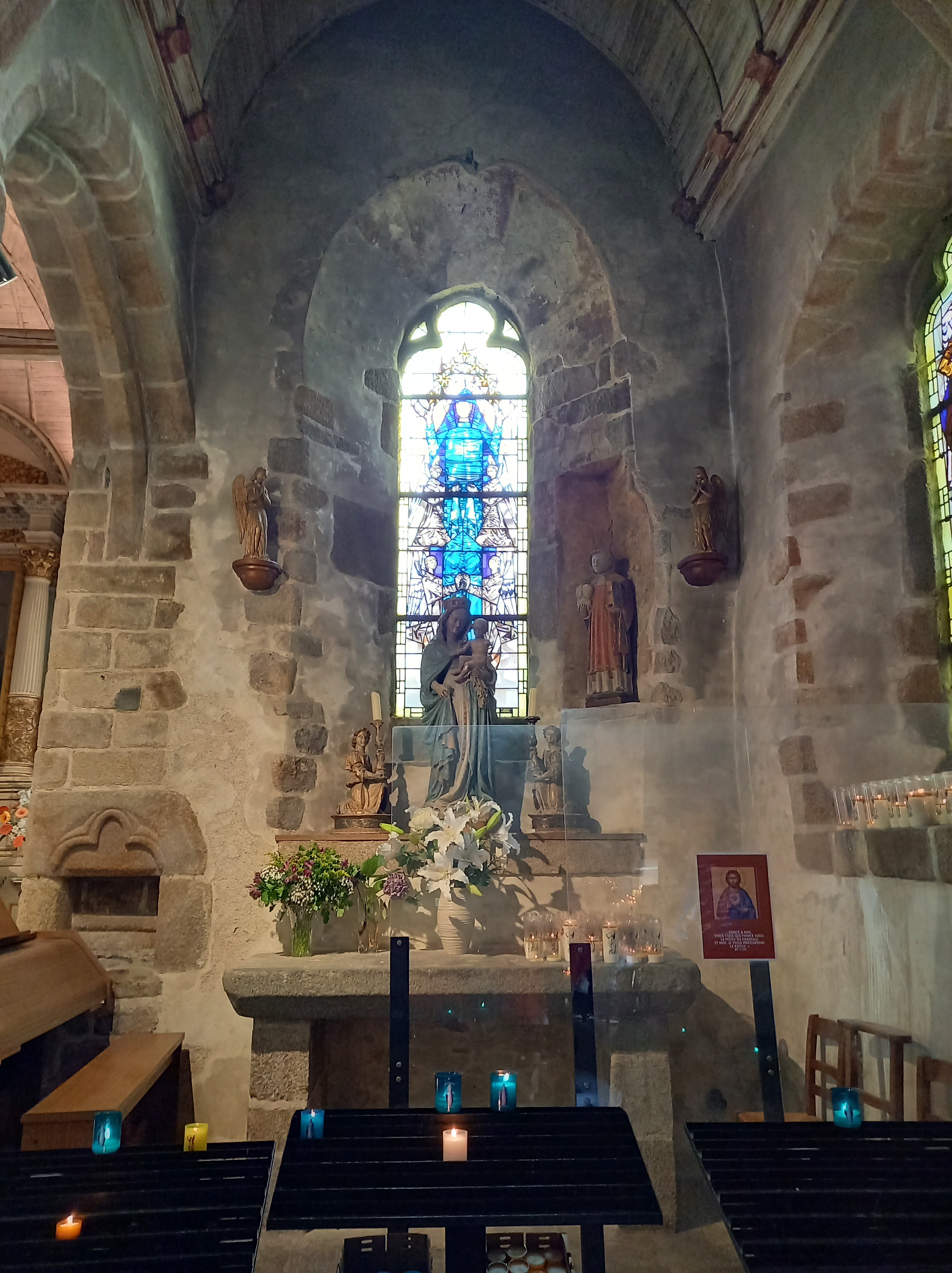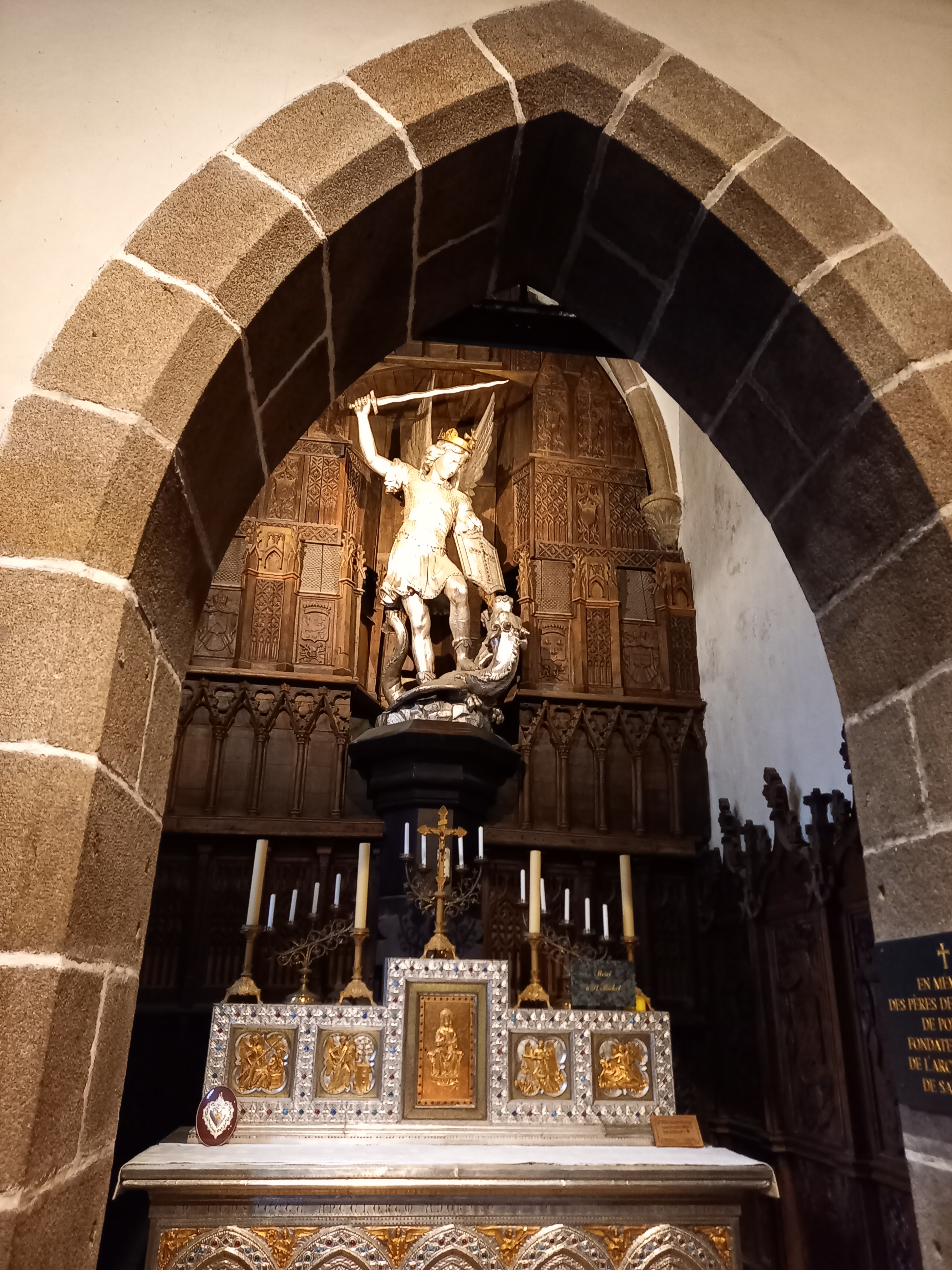 Le origini di questa chiesa in pietra risalgono al secolo XI, anche se la struttura interna è del XV-XVI secolo. C’è la navata centrale con l’altare principale, la navata di destra con la statua della Vergine e la cappella con la statua di San Michele Arcangelo, che è l’opera maggiore del santuario. Questa statua monumentale in foglie d’argento su anima lignea fu trasferita dalla chiesa abbaziale con l’altare d’argento nel 1895. L’arcangelo è rappresentato come un guerriero romano che uccide il drago, brandendo la spada nella mano destra e lo scudo nella mano sinistra. Papa Pio IX decise nel 1875 di concederle gli onori dell’incoronazione. La corona è stata realizzata con gioielli offerti dai fedeli ed è attribuita all’orafo parigino Mellerio detto Meller. La cerimonia di incoronazione, alla presenza di 25.000 pellegrini il 3 luglio 1877, fu un momento culminante della rinascita del pellegrinaggio alla fine del XIX secolo. La preziosa corona venne successivamente trafugata dalla sagrestia del santuario, la notte del 17 agosto 1906. L’attuale corona della statua è decorata con perle di vetro: ricorda l’onorificenza conferitale nel 1877. Un cartello posto a lato della piccola cappella suggerisce di accendere una candela e di recitare questa preghiera: