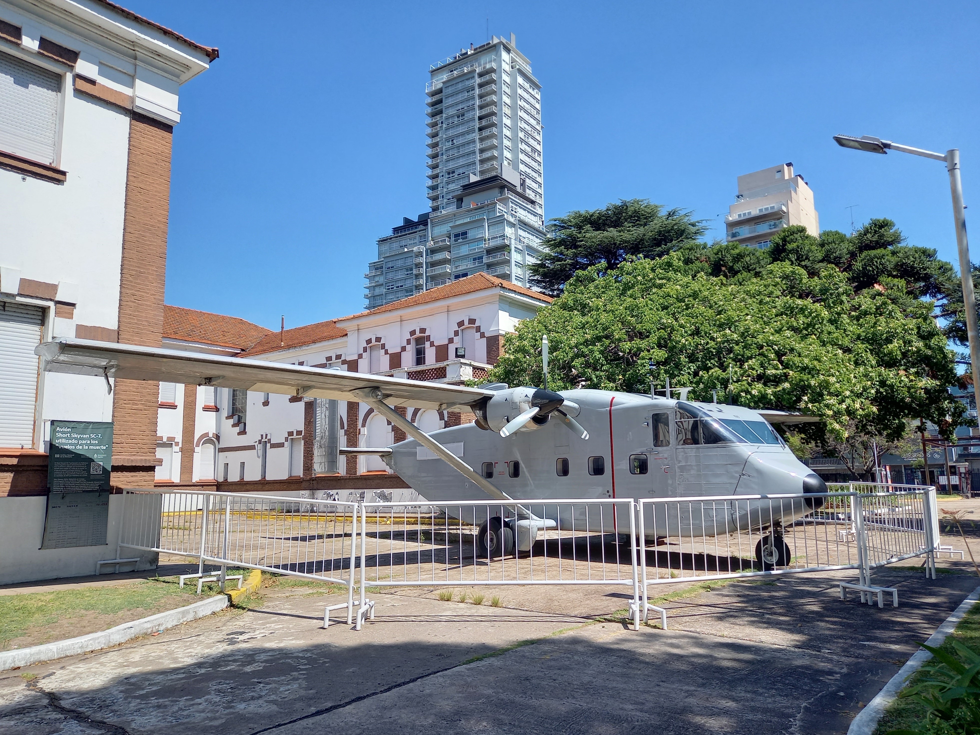 Quello che ora si trova parcheggiato qui nel cortile dell’ex ESMA è uno dei sei aerei che sono stati usati per i voli della morte, precisamente uno Short Skyvan SC-7. Era stato venduto negli USA, con i registri falsificati da cui risultava che era stato usato, nel periodo della dittatura, per voli di addestramento, ed è stato poi ritrovato nel 2009. Dopo la sentenza del 2017 di uno dei processi di quella che si chiama la “Megacausa ESMA”, i familiari delle vittime sono riusciti a ottenere dallo Stato argentino che si facesse carico delle pratiche per riportarlo in patria, e finalmente è stato riportato qui nel giugno del 2023.