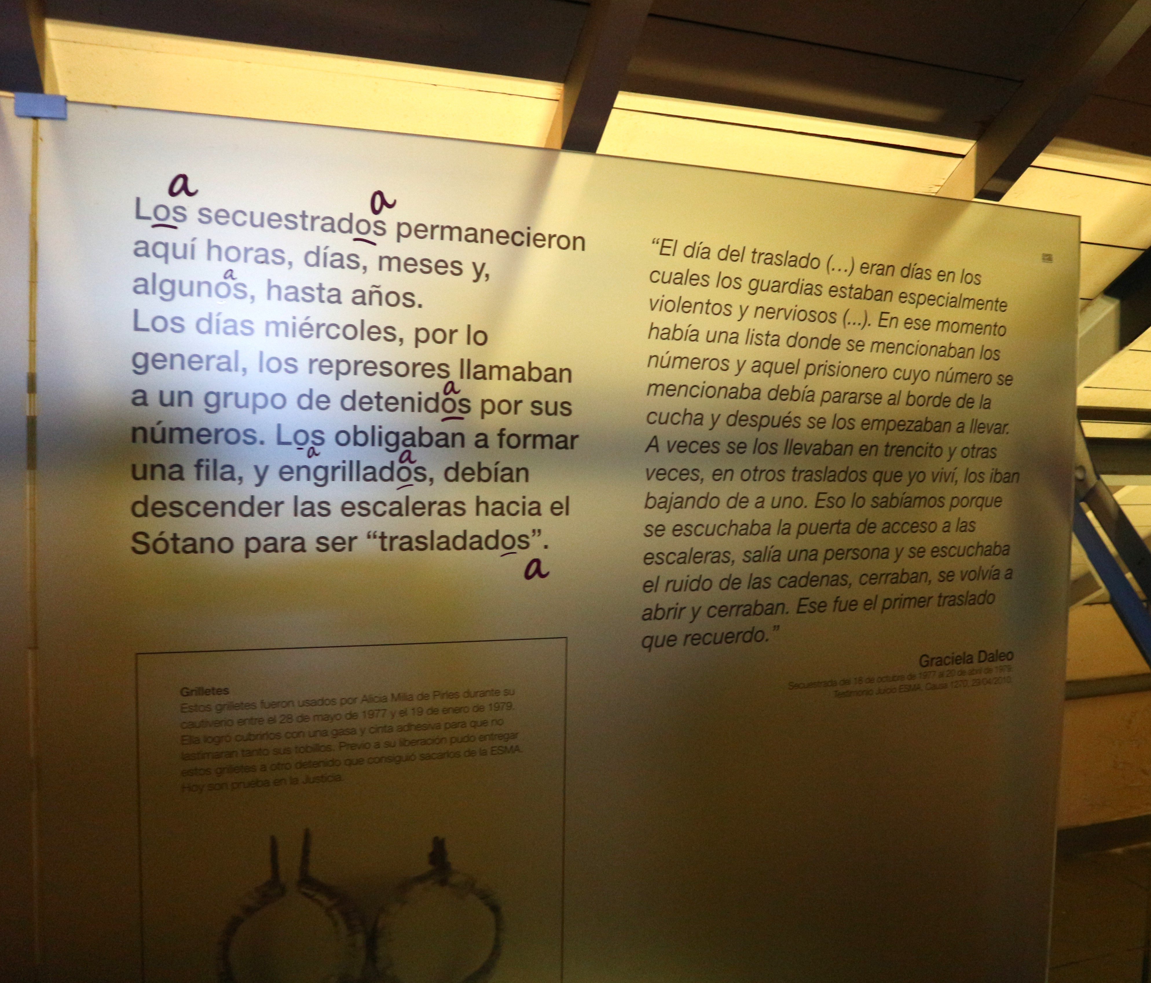 Il momento finale della visita è in un salone dove ci si siede e si possono guardare video che vengono proiettati sulle pareti, sia di testimonianze che riguardanti l’esito dei tanti processi ai repressori. Molti di loro sono stati condannati alla prigione perpetua, che però in Argentina significa che dopo 20 anni, portati nel 2004 a 35, si può chiedere la libertà condizionale. Inoltre, a causa delle leggi di Alfonsin degli anni ’80 (la Ley de punto final e la Ley de obediencia debida, che scagionava i militari “obbligati a obbedire agli ordini”) e dell’amnistia successivamente decretata da Menem e durata fino all’inizio degli anni 2000, le condanne sono arrivate molto tardi. E perciò, tanto per fare un esempio per tutti, Videla, condannato all’ergastolo nel 2007 e a 50 anni nel 2010, ha passato in carcere solo gli ultimi anni della sua vita, dal 2007 alla morte nel 2013.