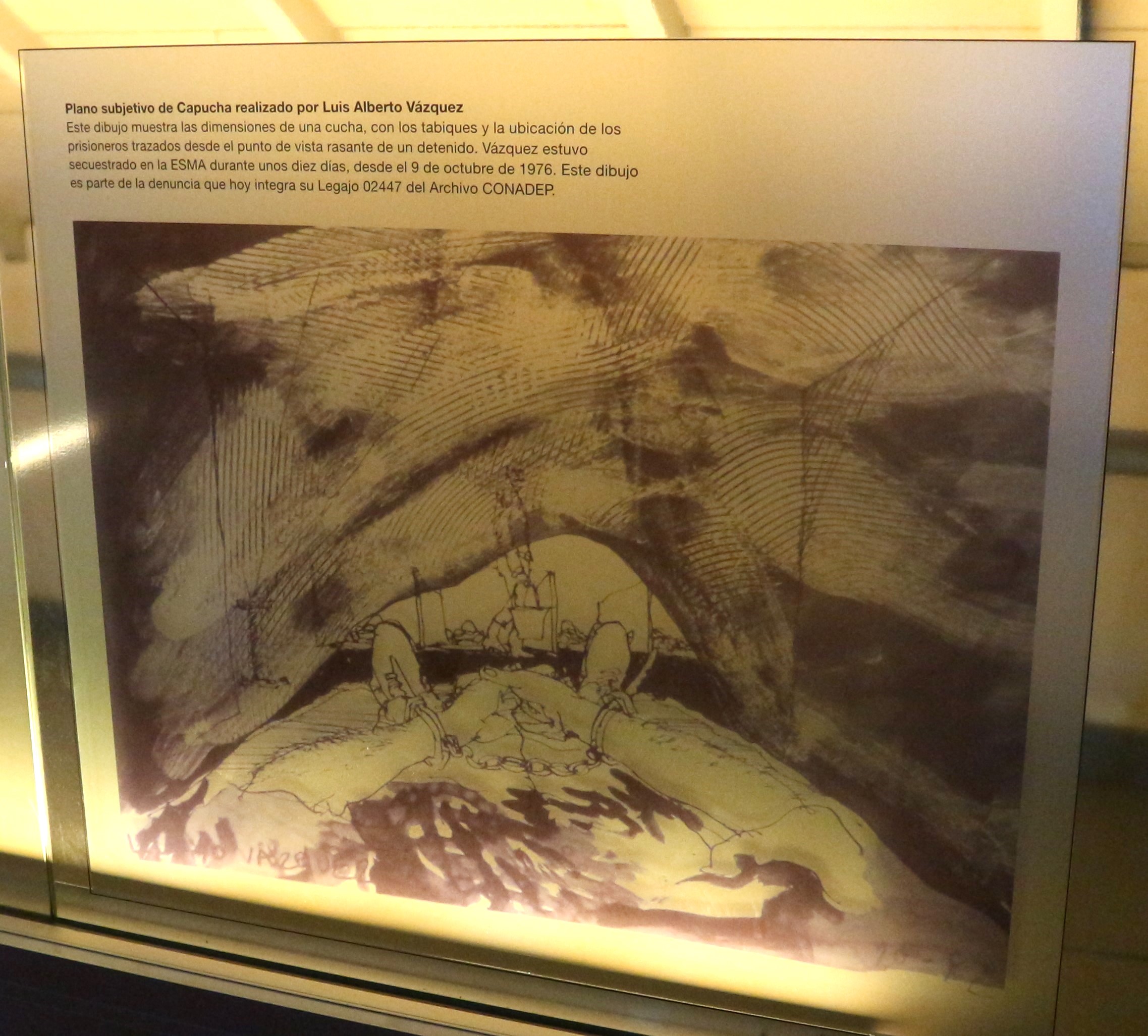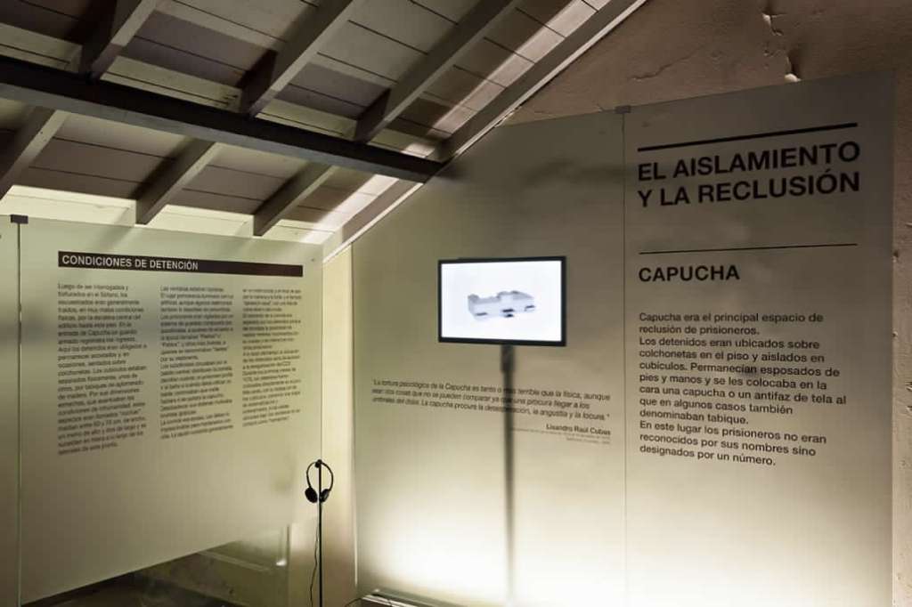 La capucha si chiama così perché i prigionieri rimanevano sempre incappucciati, buttati su un materasso con mani e piedi ammanettati. Mangiavano solo una volta al giorno, ma non si sa esattamente in quale momento della giornata perché le sole testimonianze disponibili sono i racconti dei sopravvissuti, che durante la prigionia perdevano la cognizione del tempo, non riuscendo più a distinguere il giorno dalla notte. Il pasto era il cosiddetto sandwichito naval, un semplice panino con una fettina di carne, accompagnato con mate cocido, un’infusione di yerba mate in bustina, simile al mate tradizionale ma più leggero. Nella capucha stavano generalmente da 60 a 65 persone. Sopra c’era un altro locale più piccolo chiamato capuchita, dove c’erano altre 15 persone circa. E poi c’era un altro locale ancora dove stavano quelli che venivano chiamati schiavi, cioè quelli forzosamente obbligati a lavorare per la dittatura. Ciascuno aveva un piccolo stanzino delimitato da pareti di legno. La condizione di schiavitù era basata sulla “utilità” che queste persone, per le loro capacità o competenze, potevano avere per il funzionamento della ESMA; oppure, nel caso delle donne, quasi sempre lo scopo era sottoporle a continue violenze sessuali. Molte di queste donne sono state obbligate a mantenere relazioni con gli ufficiali anche dopo essere state liberate, fino alla fine della dittatura.
