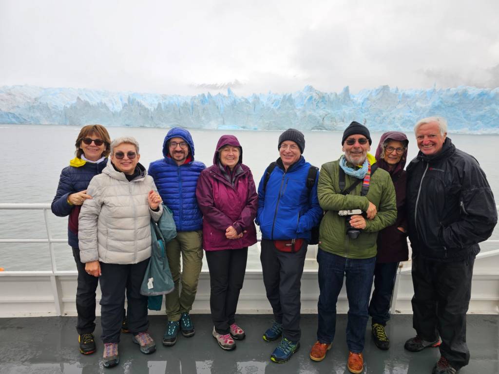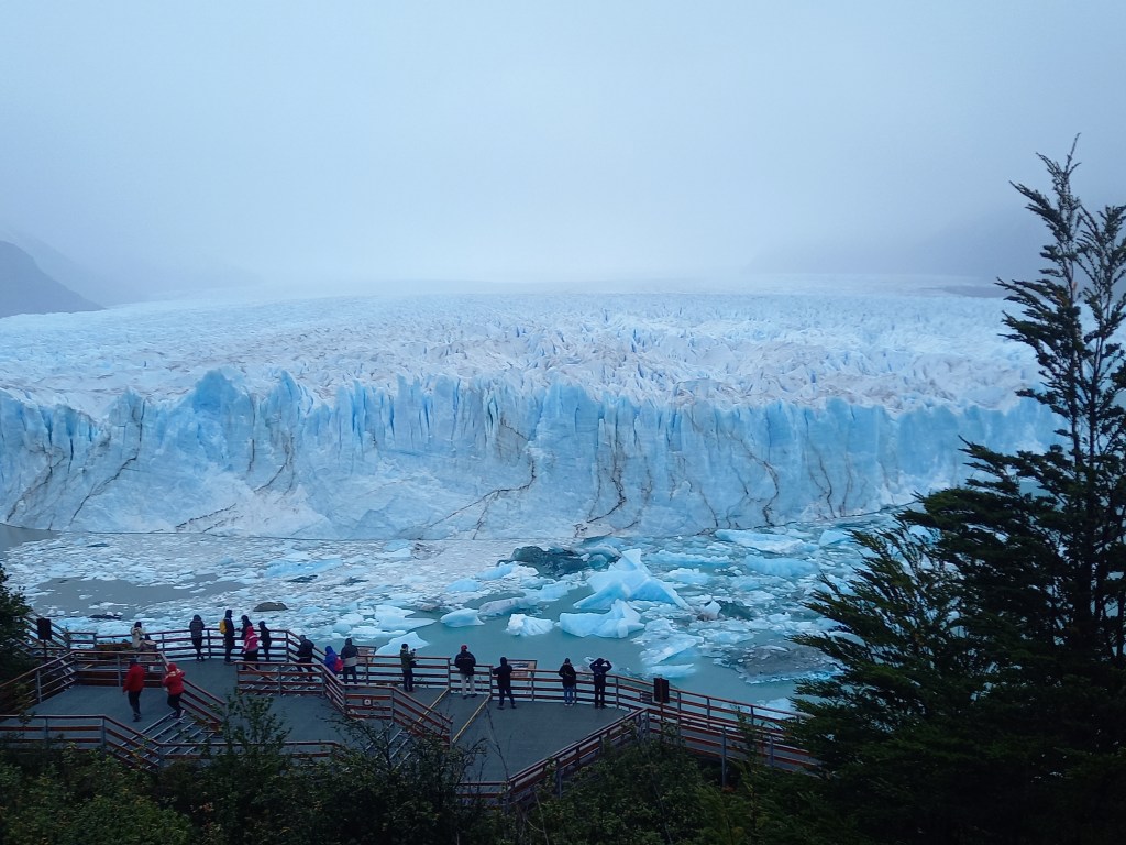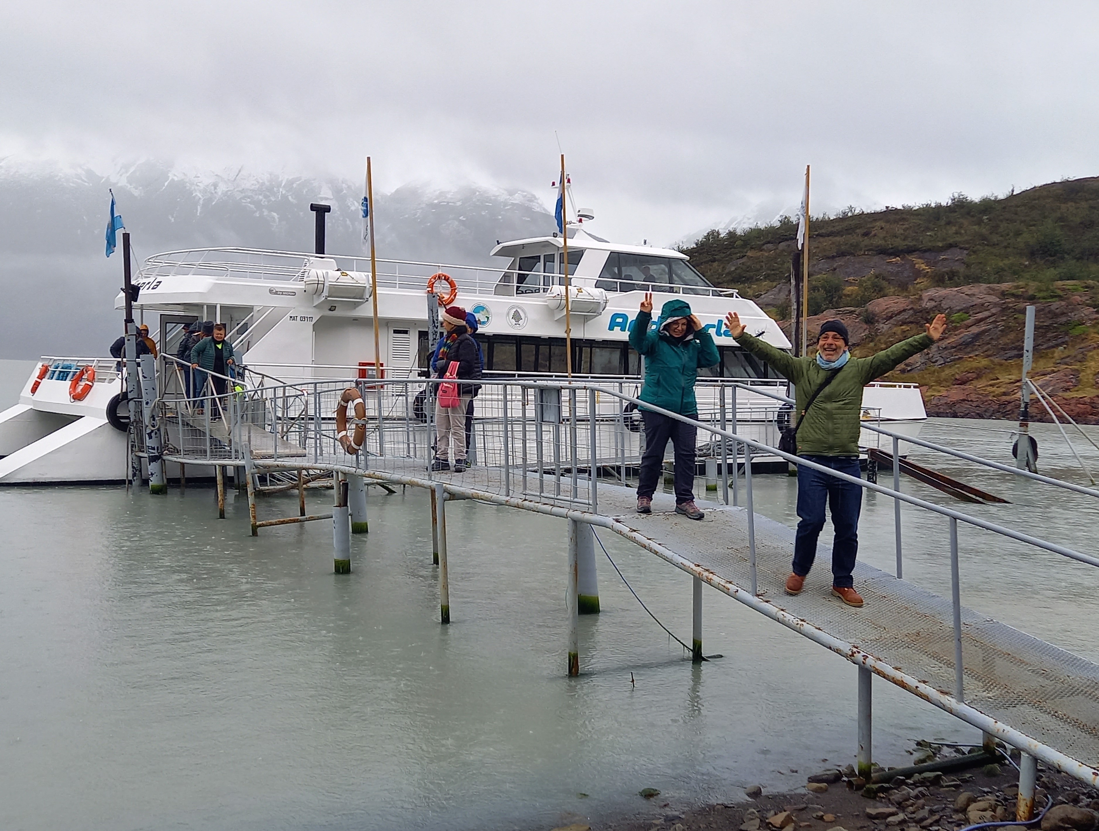 Giunti al ghiacciaio, comunque, la guida ci annuncia che ci aspetterà sul pullman. Avremo tutto il tempo necessario per vedere il ghiacciaio dalle passerelle e poi per la navigazione in barca, con la quale ci avvicineremo al fronte, ma dovremo fare tutto in autonomia. Il cielo è molto nuvoloso e fa freddo. Ci avviamo a piccoli gruppetti giù per i sentieri che portano alle varie passerelle, paradiso dei fotografi. C’è chi dice che la luce migliore per vedere e fotografare il ghiacciaio sia proprio questa, col cielo carico di nuvole, perché il sole tende ad “appiattire” verso il bianco tutte le infinite sfumature di azzurro dei ghiacci. Cerchiamo di consolarci con questo pensiero, mentre io cerco di ricordarmi se effettivamente 12 anni fa, quando sono venuto qui per la prima volta e sicuramente il tempo era migliore (anche se nemmeno allora era sole pieno), si vedessero più o meno colori. In ogni caso, è sempre uno spettacolo da togliere il fiato. Intanto scendono le prime gocce di pioggia, che si fanno man mano più decise, e allora gradualmente torniamo tutti verso il parcheggio per rintanarci nella caffetteria in attesa della partenza della barca. L’ultimo ad arrivare è Andrea, che si è dichiarato fin da Bariloche refrattario ad ogni tipo di “trekking” (lui quando lo dice sottolinea la parola con un certo sarcasmo) e che quindi ora ci sfotte dicendo che sono bastate poche gocce d’acqua a farci ripiegare, mentre lui coraggiosamente si è spinto fino alle passerelle più in basso nonostante il vento e la pioggia.