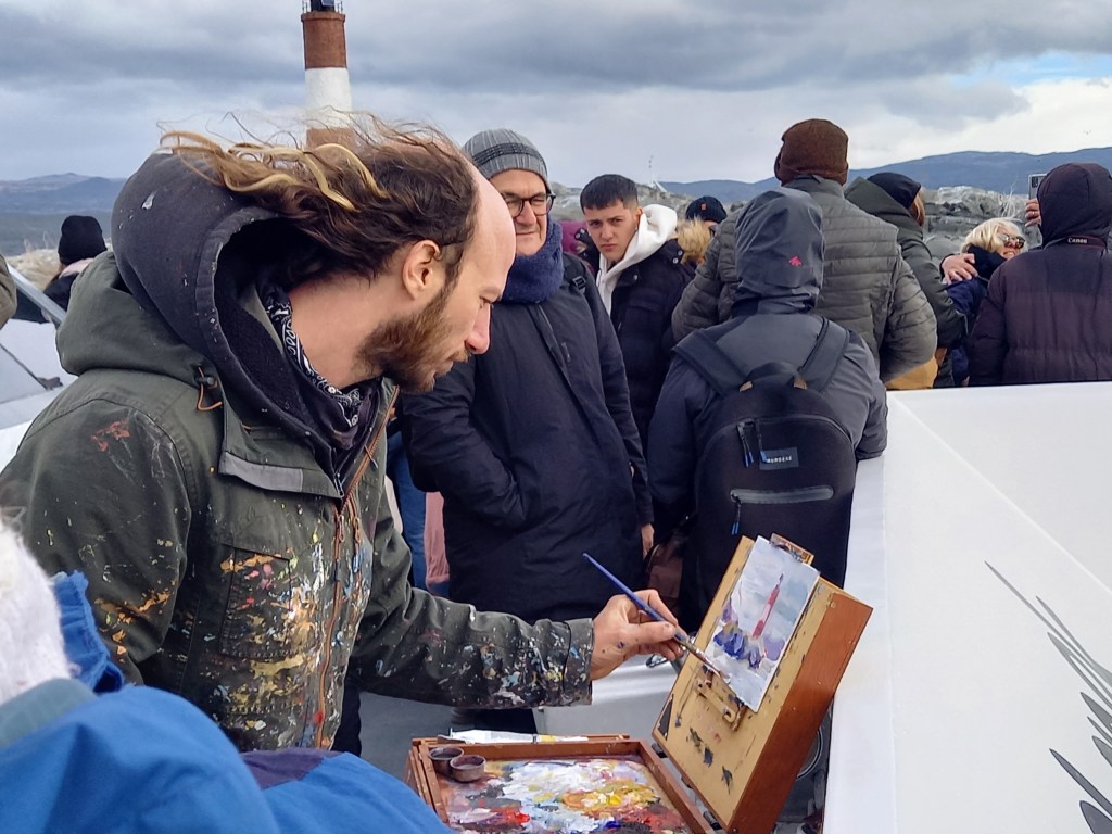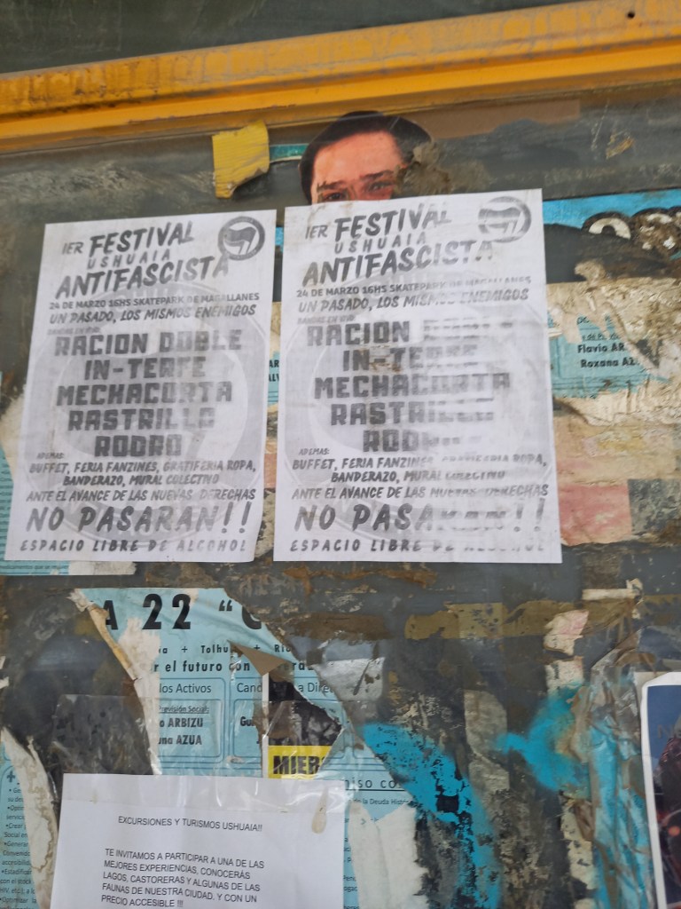 Noi arriviamo a Ushuaia in una fredda mattina di pioggia. Tra le prime cose che notiamo, facendo la prima passeggiata in città dopo esserci sistemati in albergo, ci sono tracce di una città che resiste, anche in tempi difficili come quelli del trionfo della destra di Milei che strizza l’occhio ai negazionisti dei crimini della dittatura militare. Manifesti di un festival antifascista che si svolgerà tra pochi giorni (ma purtroppo quando non saremo più qui), e una manifestazione di insegnanti contro i tagli di Milei alla pubblica istruzione.