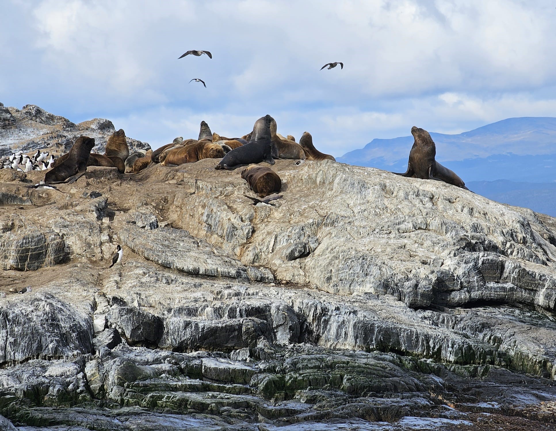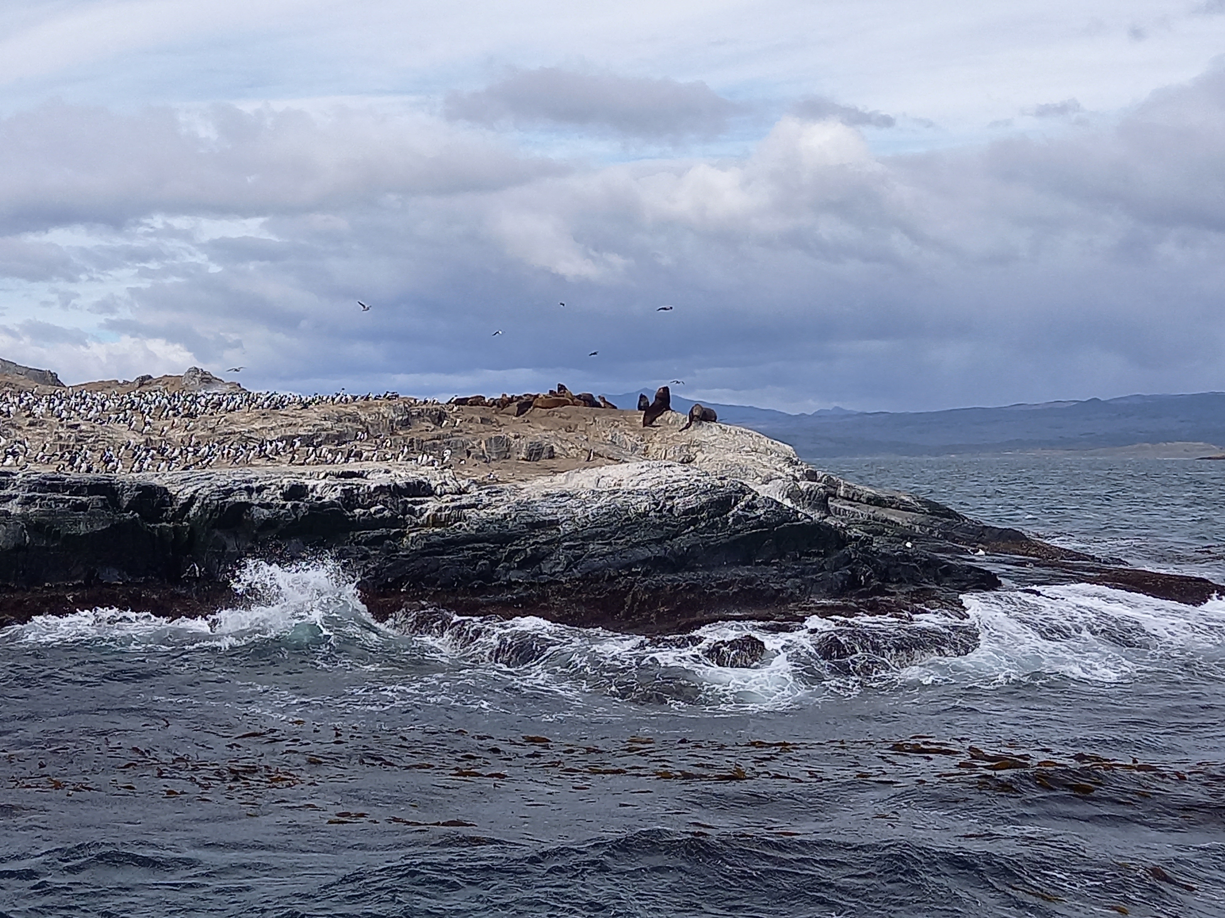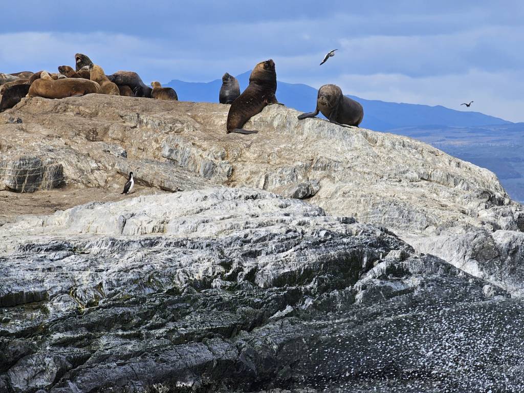 In queste tre ore riusciamo, prima di tutto, ad avvicinarci a un isolotto per vedere da pochi metri di distanza i leoni marini (meravigliosi i piccoli che giocano tra di loro) e i cormorani; i cormorani, con la loro livrea bianca e nera, quando si posano possono da lontano sembrare dei pinguini. Ma poi si alzano in volo e ti accorgi che non sono pinguini… la voglia di vedere i pinguini nel loro habitat naturale ci rimarrà, perché nei due giorni che passeremo qui non ci sarà il tempo. Sulle coste della Terra del Fuoco i pinguini ci sono, ma per vederli dovremmo fare una navigazione molto più lunga, oppure viaggiare via terra fino alla Estancia Harberton (circa 80 km) e poi da lì alla Isla Martillo, una riserva naturale abitata da pinguini delle due specie che si trovano qui (i pinguini di Magellano e i Papua). Questo è quello che ho fatto io 12 anni fa, e sono stato anche fortunato perché in quel momento c’era sull’isola anche una coppia di pinguini Imperatore, i più grandi, belli ed eleganti, giunti probabilmente dall’Antartide. Però è un’escursione che richiede tutta la giornata, e per il secondo giorno abbiamo già in programma un altro giro nel Parque Nacional Tierra del Fuego, che ne impegnerà più di mezza, e allora proprio non ce la facciamo. Ma comunque questa navigazione ci porta anche in giro per le isole del Canale, e fino al mitico faro di San Juan de Salvamento, o faro della Fine del Mondo, citato anche nell’omonimo romanzo di Jules Verne. Non ci possiamo lamentare.