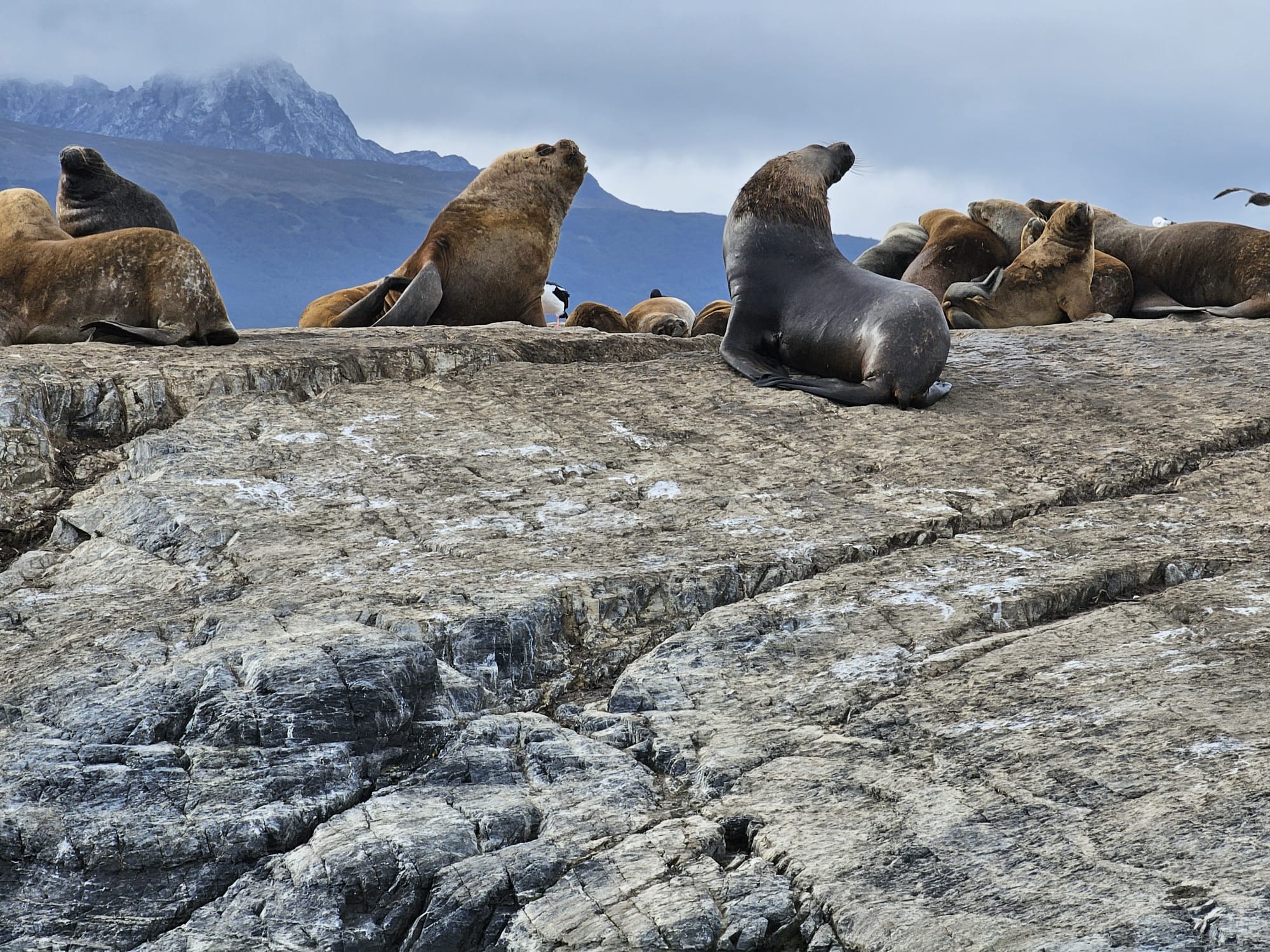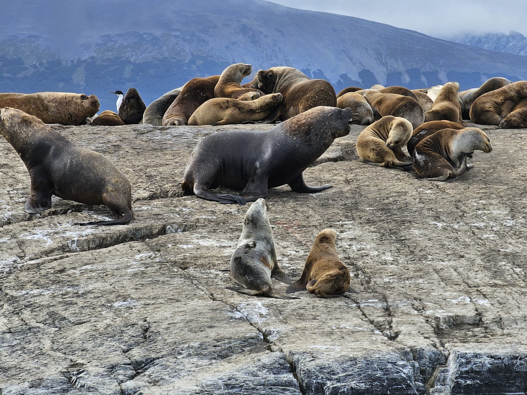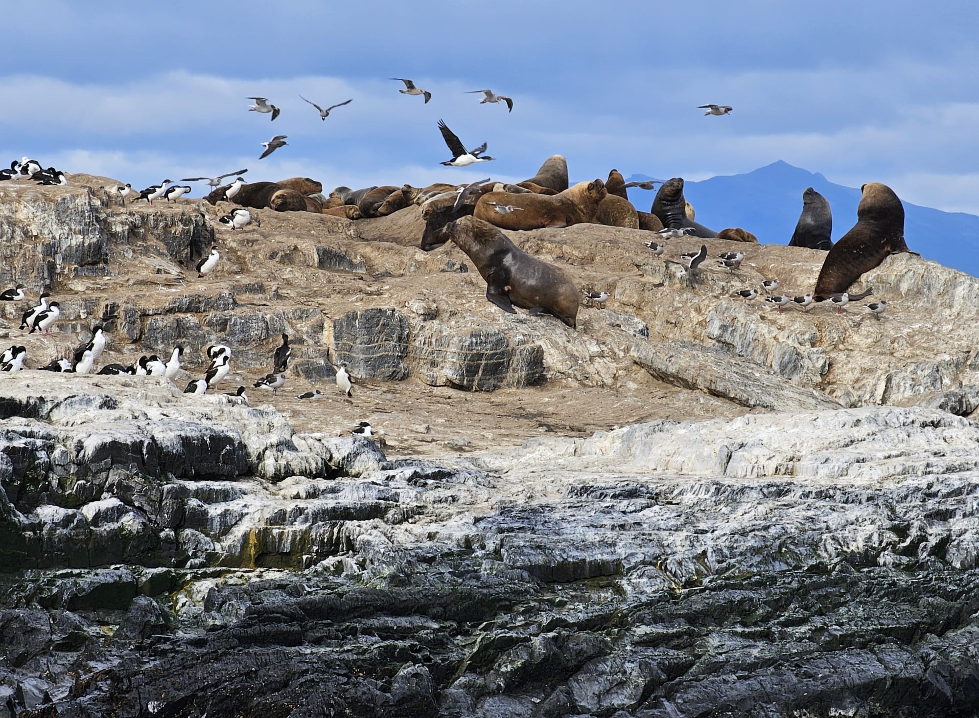 In queste tre ore riusciamo, prima di tutto, ad avvicinarci a un isolotto per vedere da pochi metri di distanza i leoni marini (meravigliosi i piccoli che giocano tra di loro) e i cormorani; i cormorani, con la loro livrea bianca e nera, quando si posano possono da lontano sembrare dei pinguini. Ma poi si alzano in volo e ti accorgi che non sono pinguini… la voglia di vedere i pinguini nel loro habitat naturale ci rimarrà, perché nei due giorni che passeremo qui non ci sarà il tempo. Sulle coste della Terra del Fuoco i pinguini ci sono, ma per vederli dovremmo fare una navigazione molto più lunga, oppure viaggiare via terra fino alla Estancia Harberton (circa 80 km) e poi da lì alla Isla Martillo, una riserva naturale abitata da pinguini delle due specie che si trovano qui (i pinguini di Magellano e i Papua). Questo è quello che ho fatto io 12 anni fa, e sono stato anche fortunato perché in quel momento c’era sull’isola anche una coppia di pinguini Imperatore, i più grandi, belli ed eleganti, giunti probabilmente dall’Antartide. Però è un’escursione che richiede tutta la giornata, e per il secondo giorno abbiamo già in programma un altro giro nel Parque Nacional Tierra del Fuego, che ne impegnerà più di mezza, e allora proprio non ce la facciamo. Ma comunque questa navigazione ci porta anche in giro per le isole del Canale, e fino al mitico faro di San Juan de Salvamento, o faro della Fine del Mondo, citato anche nell’omonimo romanzo di Jules Verne. Non ci possiamo lamentare.