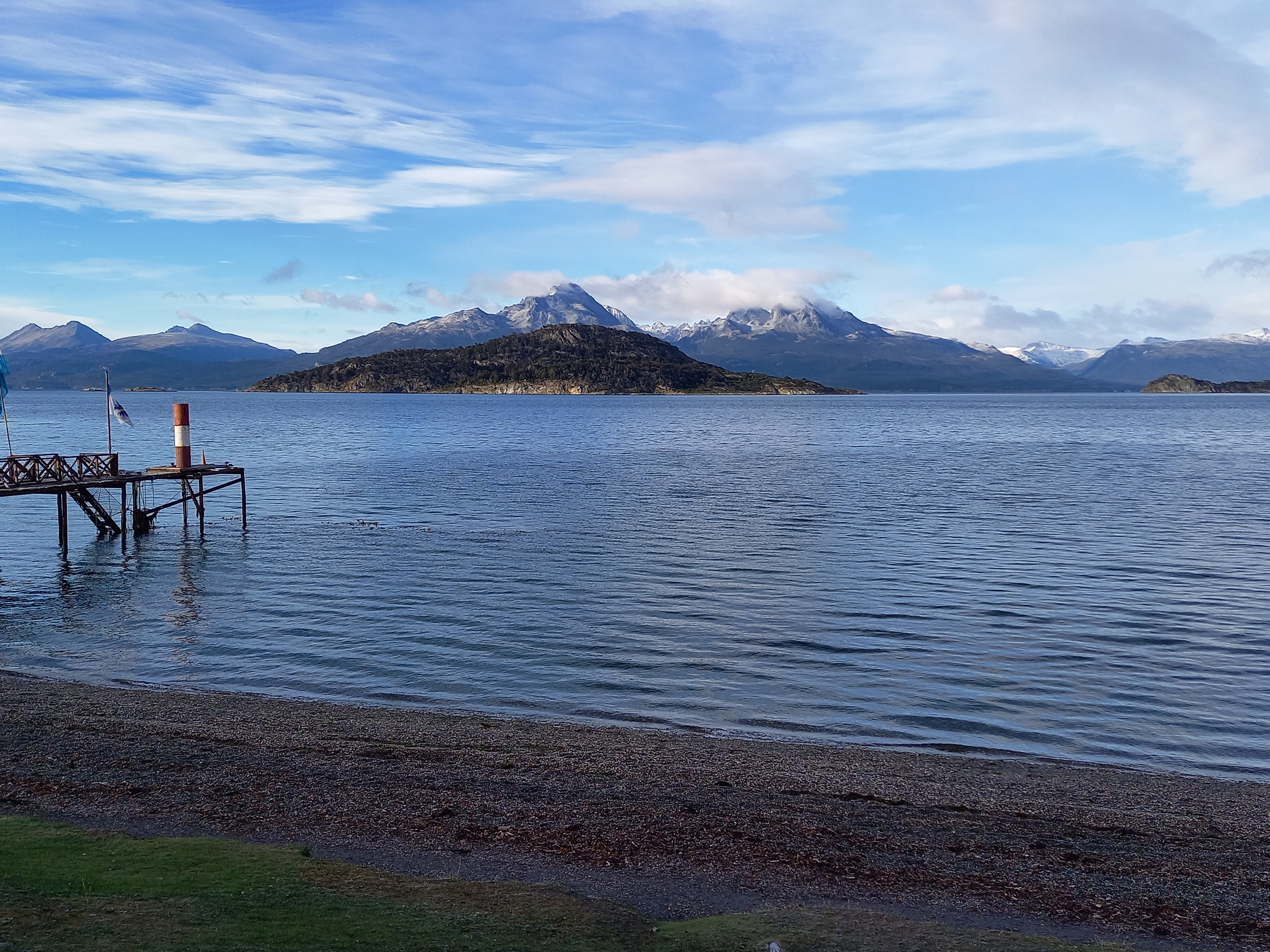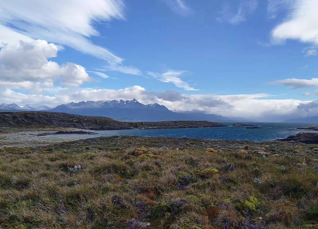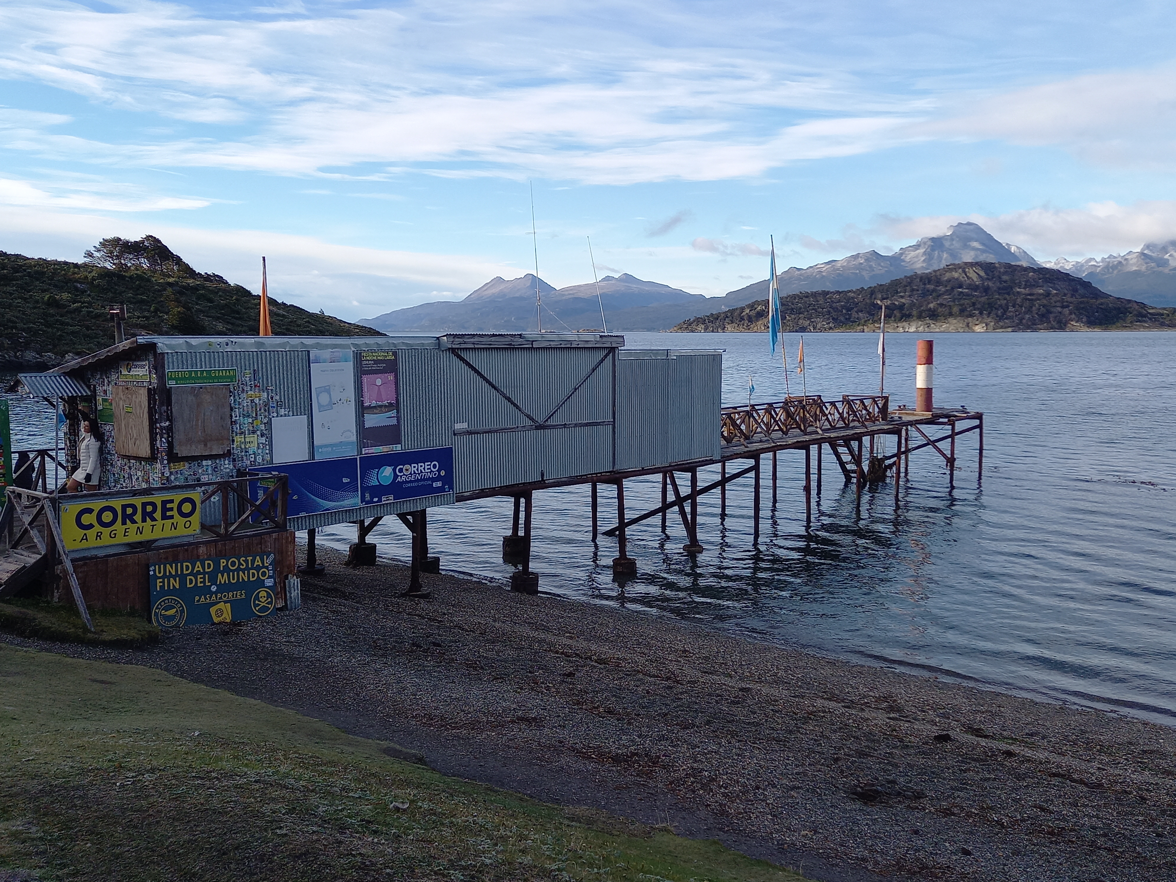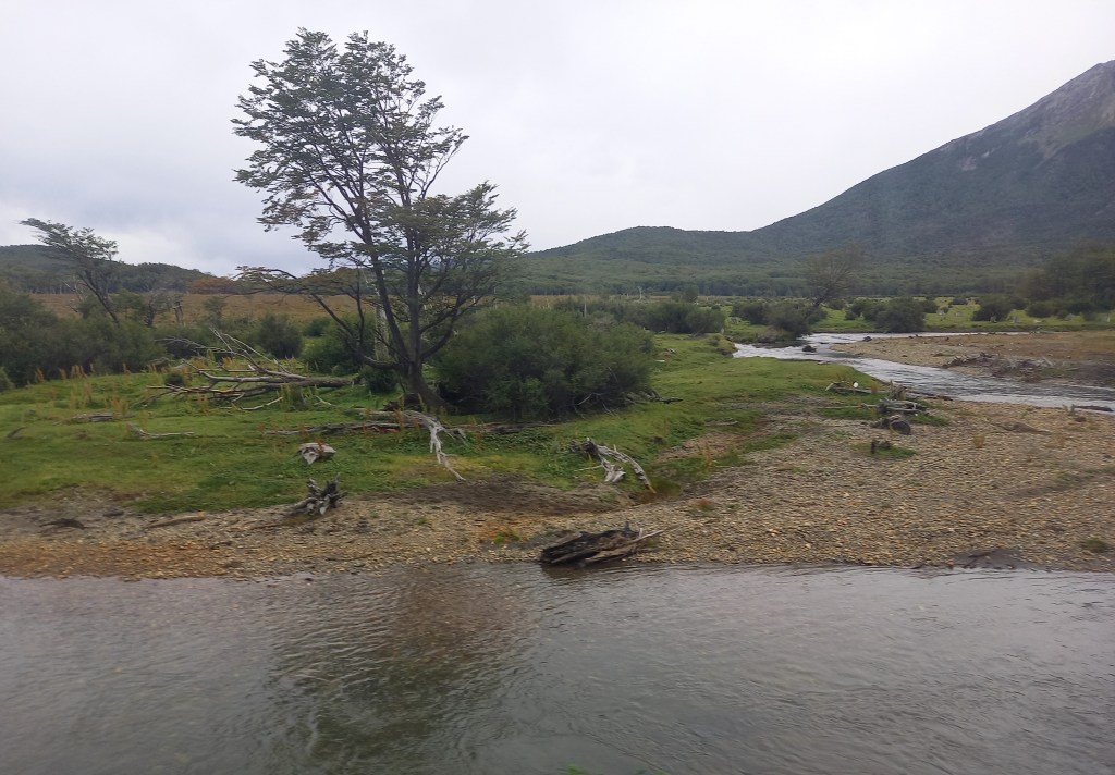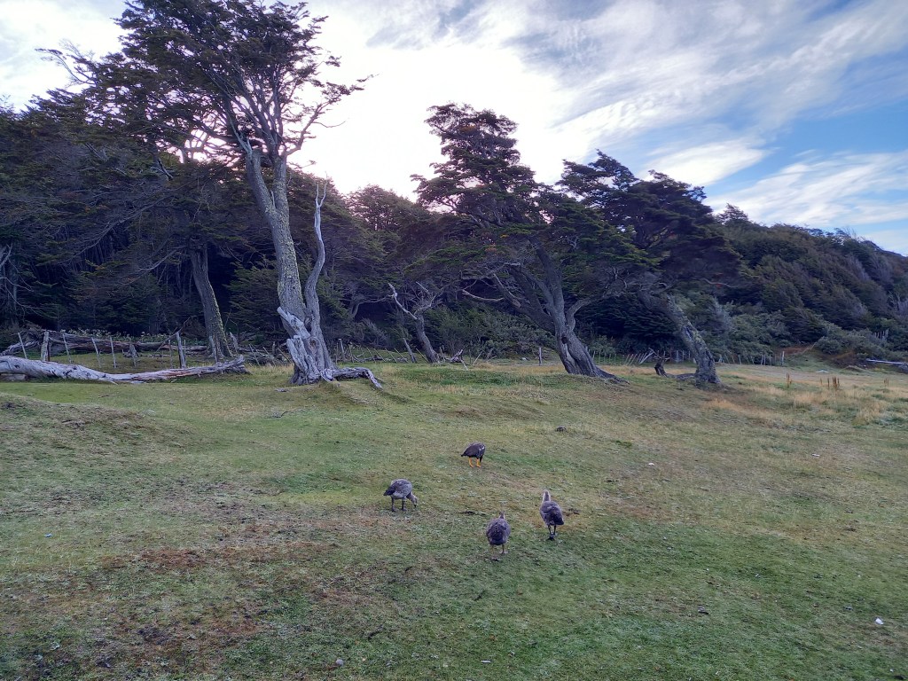 Il giorno dopo, si parte per il tour del Parque Nacional Tierra del Fuego. La prima tappa è all’Ensenada Zaratiegui, al margine settentrionale del Canale di Beagle, all’estremo sudovest del settore argentino dell’Isla Grande. Eh sì, qui siamo proprio a due passi dal confine col Cile, come del resto navigando nel Canale davanti all’Isola Navarino, che anch’essa è già Cile, come Capo Horn che si trova su un’altra isola qualche miglio più avanti. La Terra del Fuoco è divisa tra i due paesi con un taglio netto, due linee praticamente ad angolo retto tracciate con la squadra sulla mappa. Da qui si vedono la Isla Redonda, la Isla Heste (anche questa cilena), Punta Entrada e Punta Italam. E ci sono degli ottimi esempi di arboles bandera (alberi bandiera), tipici di queste latitudini, piegati dai fortissimi venti che spazzano la baia. Oggi fa indubbiamente fresco ma il vento non è particolarmente forte, tutto sommato ci va bene, se teniamo conto che in estate il vento può soffiare a 100 km/h con raffiche a 130. Come temperature, la media estiva è di 10°C, mentre d’inverno è 1°C (data la latitudine, potrebbe andare peggio). Qui c’è anche l’ufficio postale alla fine del mondo, che è ovviamente ottimo per i selfie, molto instagrammabile.