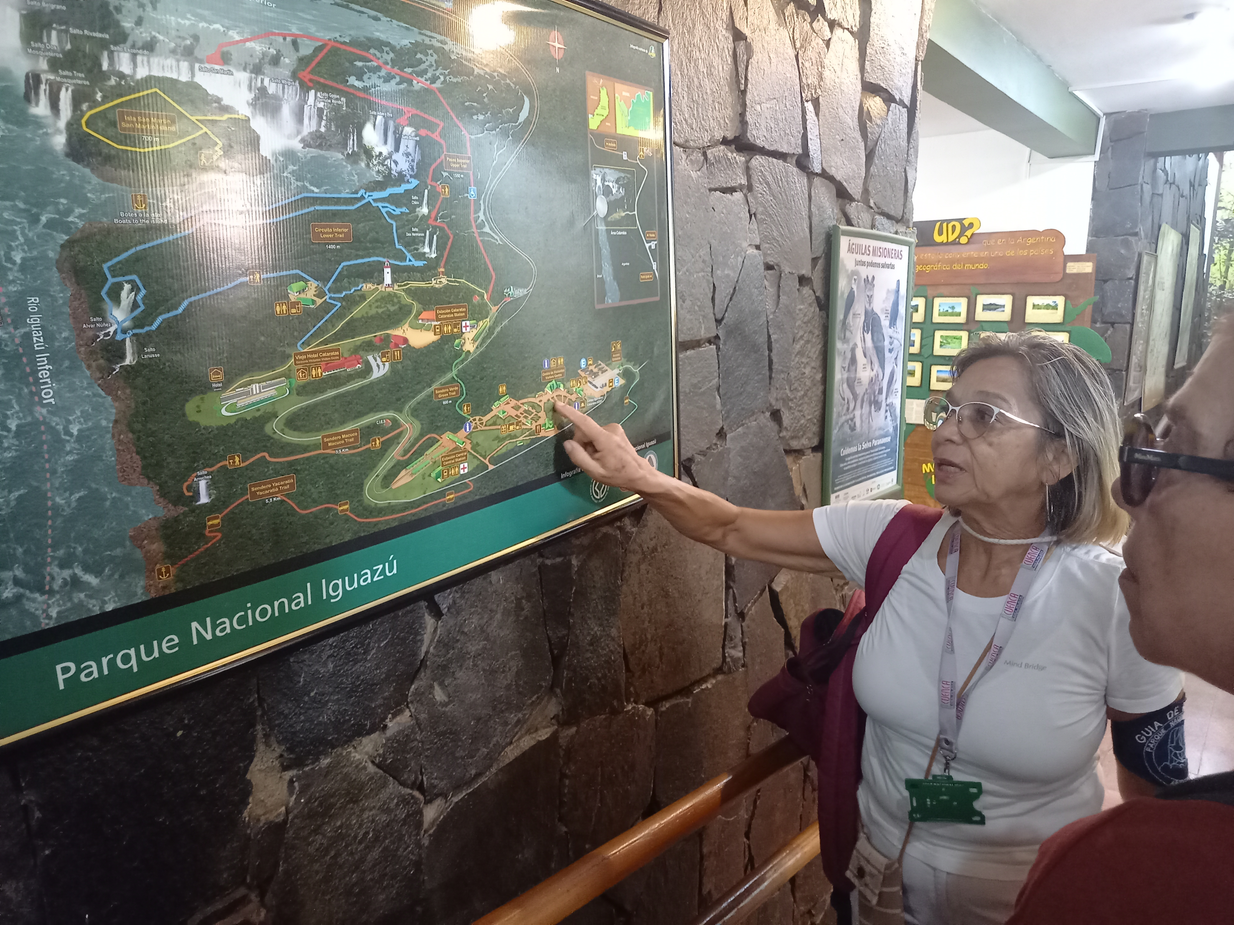 Dopo colazione Carolina torna a prenderci e si parte per la nostra escursione alle cascate. Si inizia, come preparazione, dalla visita al Centro Visitatori del Parque Nacional Iguazù, dove possiamo avere una prima idea di quali e quante diverse specie di piante e animali lo abitano: l’habitat è molto eterogeneo, la foresta pluviale subtropicale ospita oltre 2000 varietà di piante, innumerevoli insetti, 450 specie di uccelli (di cui 350 nidificano qui nella foresta), numerosi mammiferi e rettili. C’è perfino una farfalla che si mimetizza come gufo per spaventare i suoi potenziali predatori. Certo, non tutti sono facili da vedere, perché molti hanno abitudini notturne e altri evitano l’uomo: è il caso anche dei grandi felini come il puma e il re del parco, il giaguaro.