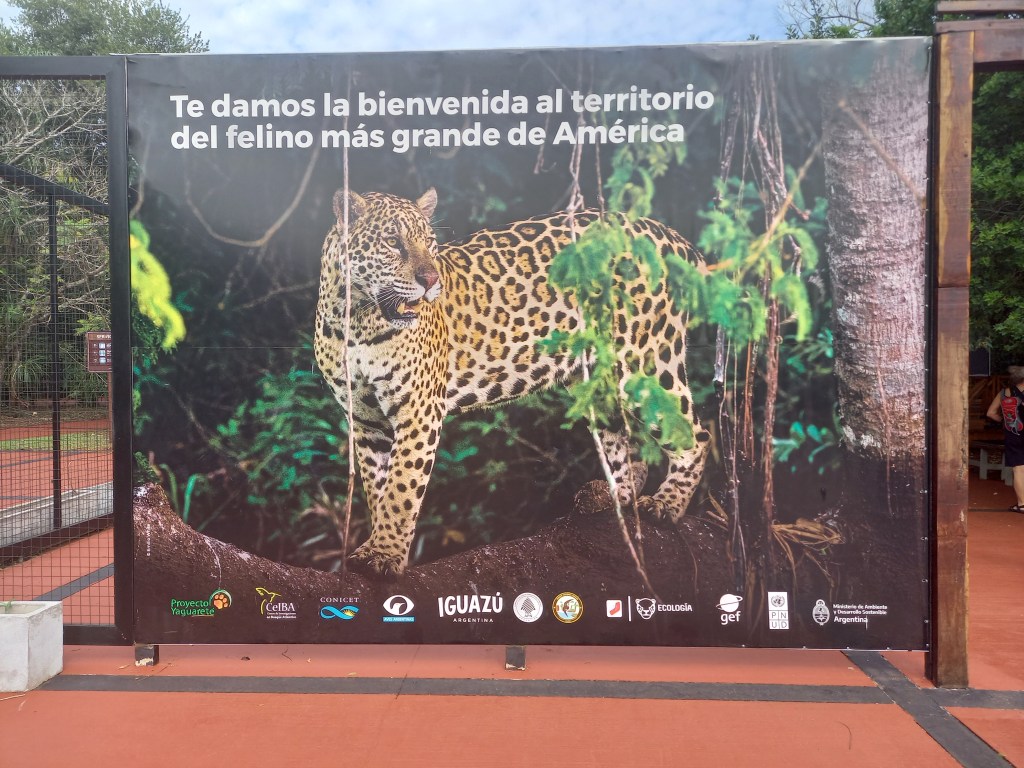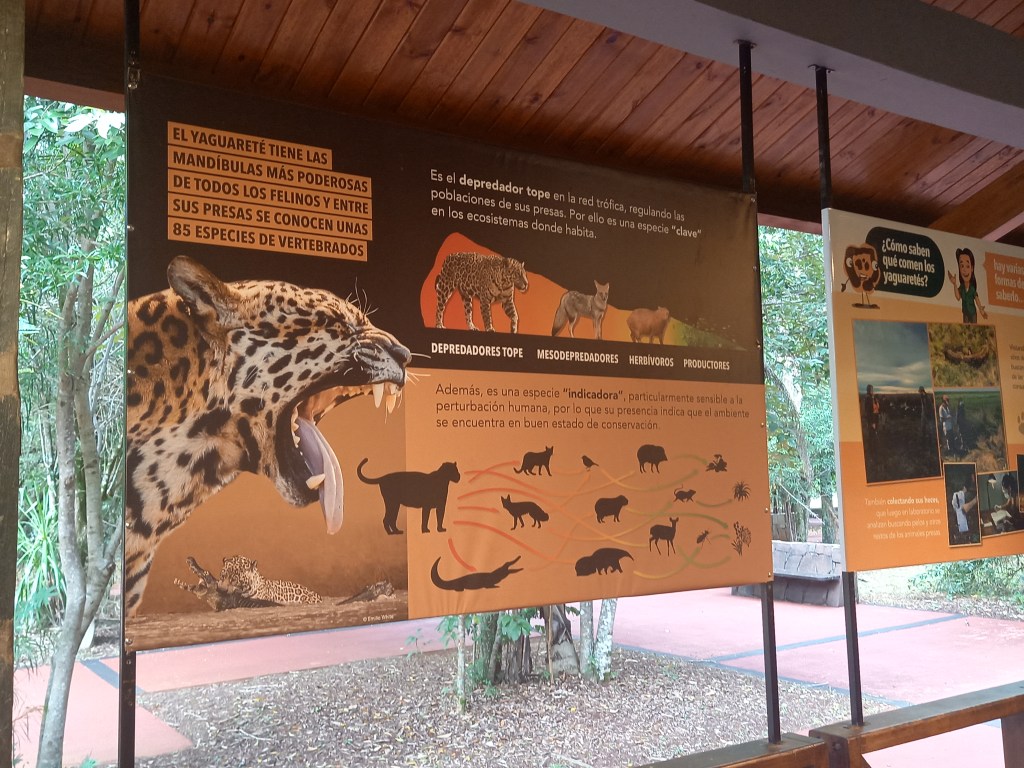Il giaguaro è il terzo felino più grande del mondo dopo la tigre e il leone, e nel continente americano (dal sud degli Stati Uniti fino a circa metà dell’Argentina) aveva la sua area di distribuzione storica. Oggi, però, in Argentina vive solo in tre ecoregioni; il numero di esemplari nel paese è tra i 200 e i 300, di cui 100 qui nella provincia di Misiones. La guida del parco ci racconta che sono molto studiati, si fa tutto il possibile per monitorarne la presenza: c’è un progetto che si chiama Proyecto Jaguarete e viene portato avanti dal 2002-2003. Si studia la biologia del giaguaro, ad esempio quello che mangia: è un predatore al top della catena alimentare, perciò ha un ruolo fondamentale nel suo ecosistema come regolatore della popolazione delle sue prede; sono state registrate 85 specie diverse di vertebrati di cui può cibarsi con le sue possenti mandibole, che sono le più forti tra tutti i felini. I suoi soli “nemici” siamo noi umani: la caccia innanzitutto, ma succede anche che un giaguaro venga investito accidentalmente da un veicolo.