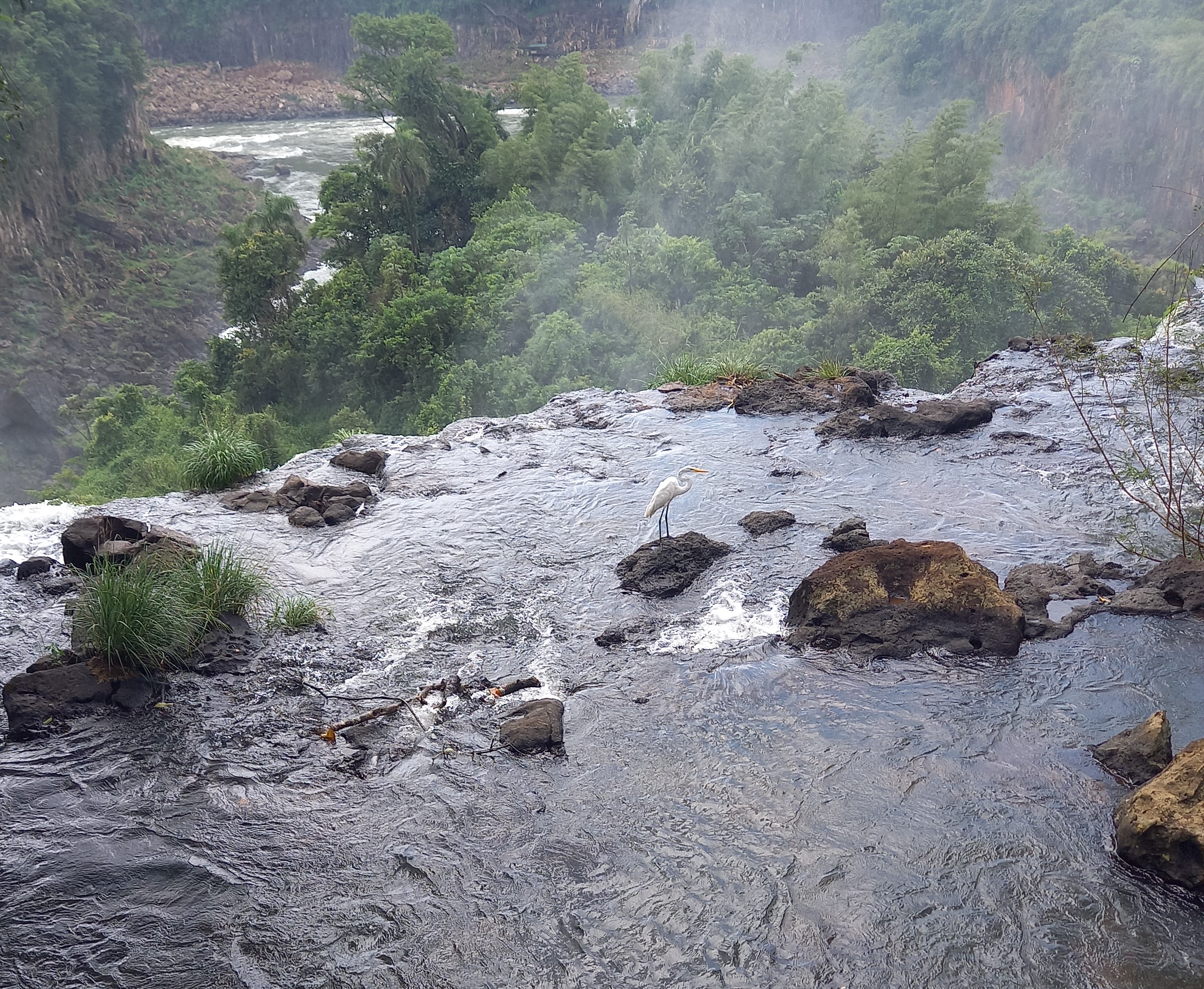 E così, dopo una giornata trascorsa interamente tra voli e attese negli aeroporti (Ushuaia – Buenos Aires Aeroparque e da lì a Iguazù), sbarchiamo nel caldo di una serata subtropicale. Andrea ha annunciato da giorni che, essendo un clima per lui insopportabile, come strategia di sopravvivenza si sarebbe messo in ciabatte appena sceso dall’aereo e così sarebbe rimasto fino al momento di ripartire… lui è un uomo di parola, perciò detto fatto. Molti di noi invece sono ancora vestiti pesanti perché stamattina siamo partiti da Ushuaia sotto una nevicata. In realtà, a quanto sembra, poteva andare peggio: ieri c’erano 45°C reali e 49°C percepiti. Oggi invece il caldo è stato più “normale”, considerato che siamo a fine estate. A raccontarcelo è Carolina, che sarà la nostra guida qui e che ci accoglie sorridente già all’uscita dell’aeroporto per portarci in pullman all’hotel. Il suo castigliano ha un che di cantilena, con un’inflessione che ricorda da vicino quella brasiliana. E del resto il Brasile è davvero a due passi: Puerto Iguazù si trova alla confluenza del Rio Paranà, che scorre in direzione nord-sud, con il Rio Iguazù, che arriva da est e prima di buttarsi nel Paranà forma queste spettacolari cascate. Il Rio Paranà segna il confine tra il Paraguay, a ovest, e il Brasile, a est, ma a sud del Rio Iguazù, che anch’esso segna un confine, c’è l’Argentina, nello specifico la provincia di Misiones. Ci troviamo quindi tra tre paesi. Noi vedremo le cascate dal lato argentino, dal quale ci si può avvicinare di più, ma la visione dal lato brasiliano è più panoramica, nel senso che consente di abbracciarne interamente gli oltre 2 km di larghezza.