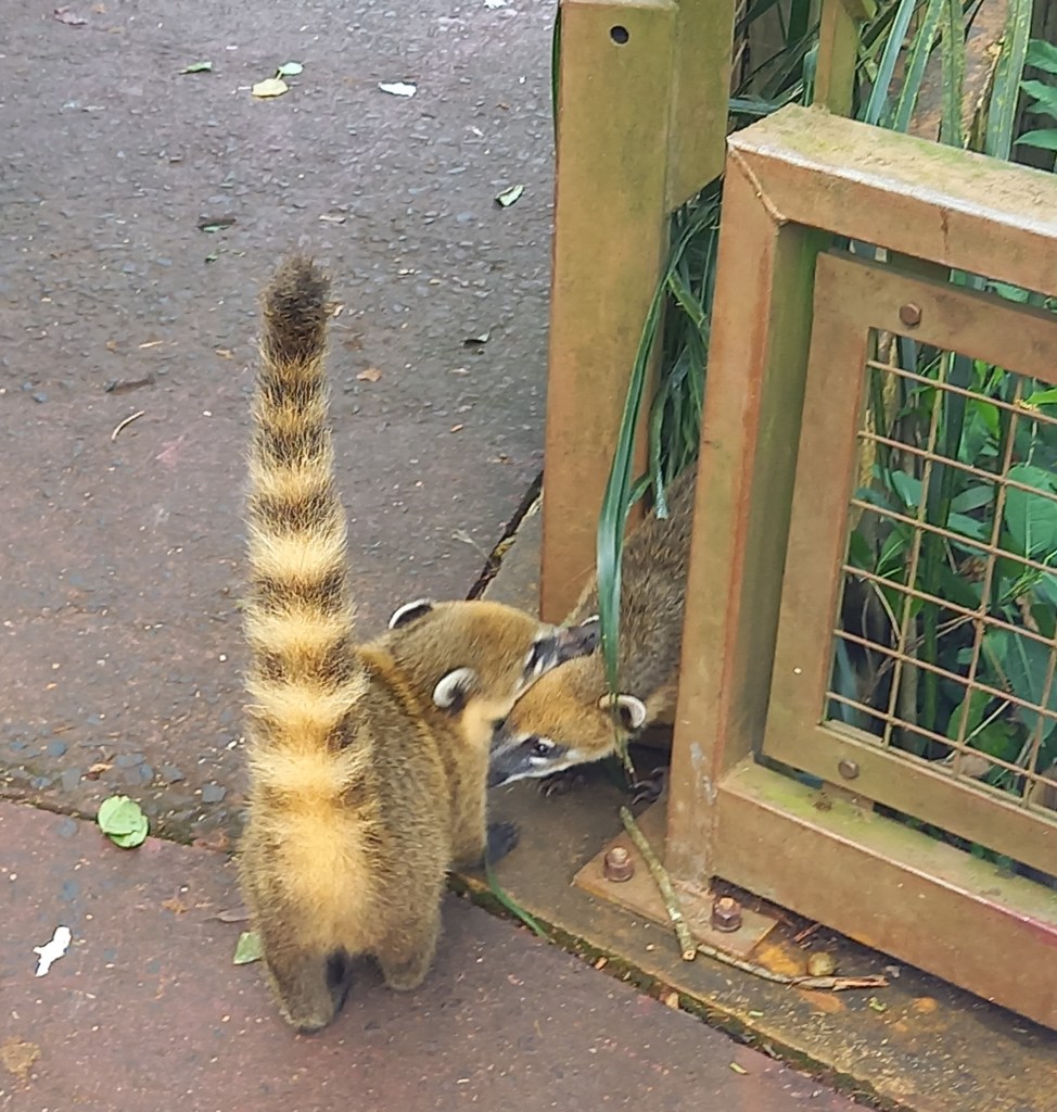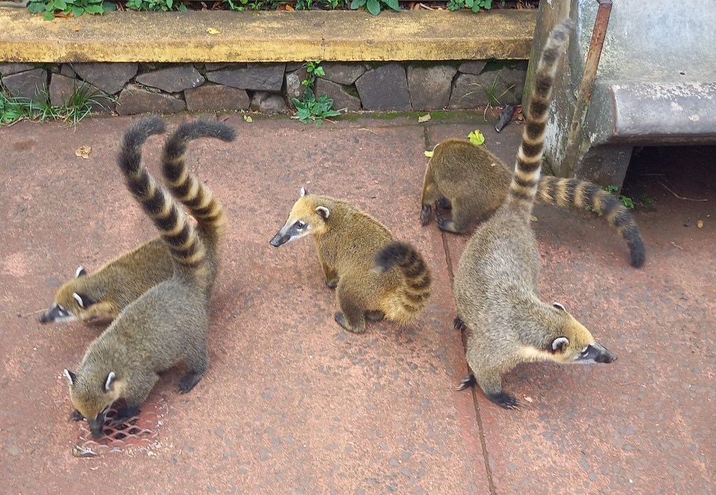 Gli altri che ti vengono a cercare loro, o meglio vengono a cercare cibo, perché da queste parti sono assolutamente abituati alla presenza dell’uomo, sono i coatì, dei buffi procionidi con il muso allungato simile a una proboscide e una lunga coda bicolore a strisce alternate più chiare e più scure. Sono diffusi in tutto il continente americano, dal sud degli USA all’Argentina. I cartelli del parco avvertono che se si dà loro da mangiare possono diventare aggressivi e mordere o graffiare per averne ancora, e quindi è decisamente meglio non dargliene, anche perché sanno benissimo cercarsi il cibo da soli e nella foresta ne hanno in abbondanza.