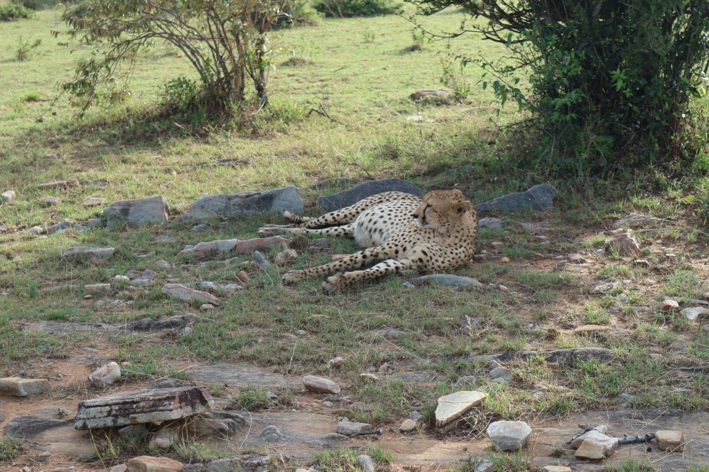 Ma alla fine riusciamo ad entrare e dopo poco c’è la prima sorpresa. Ormai abbiamo capito il meccanismo delle segnalazioni che gli autisti si trasmettono e quindi quando John ascolta la radio e poi prende una certa strada sappiamo che c’è qualcosa di interessante in vista. In questo caso, sono diversi ghepardi che sono molto vicino alla strada e che si possono vedere benissimo, cosa che a quanto sembra è piuttosto rara. John dice che forse stanno dando la caccia a una mangusta; fatto sta che non sembrano per niente intimiditi dalla presenza umana, anzi: se ne stanno lì come placidi gattoni e uno addirittura sale con le zampe anteriori sulla gomma di una jeep. Si sa che il ghepardo è il mammifero più veloce del mondo: secondo alcuni studi potrebbe superare i 100 km/h, ma ancora più stupefacente è la sua accelerazione, dato che può passare da 0 a 100 km/h in 3 secondi. Noi non l’abbiamo visto correre, ma siamo stati comunque davvero fortunati, anche se ancora più difficile da vedere è il leopardo. A differenza del ghepardo, il leopardo ha dei vistosi baffi che il ghepardo non ha e tende a vivere più sugli alberi che a terra, perciò è difficile vederlo in spazi aperti, senza contare che ha abitudini molto più notturne, soprattutto preferisce cacciare la notte. Infatti alla fine il leopardo, che pure è presente qui nel Masai Mara, è rimasto l’unico dei “Big Five” che non siamo riusciti a vedere. I Big Five, che non per niente sono raffigurati anche sulla fiancata della nostra jeep, sono gli animali più simbolici della savana africana: Elefante, rinoceronte, bufalo, leone e appunto il leopardo.