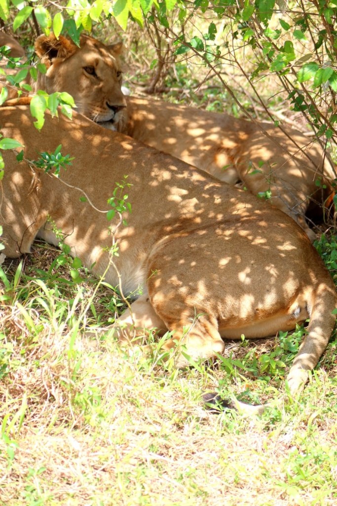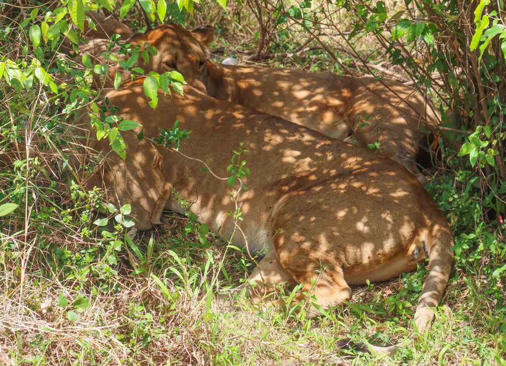 Più verso la tarda mattinata, si presenta poi l’occasione di vedere ancora dei leoni. Questa volta lo si capisce dal fatto che ci sono diversi avvoltoi appollaiati sui rami di un albero, e nelle vicinanze una carcassa. Se stanno lì e non si azzardano ad avventarsi sui resti, è un segnale abbastanza inequivocabile che il predatore è ancora da quelle parti. E infatti, al riparo di un cespuglio stanno dormendo due leonesse e tre leoncini. È difficile poterli vedere bene tra i rami senza poter scendere dalle macchine, ma con binocoli e teleobiettivi si vedono. Il fatto è che, dato che come ormai sappiamo la voce si sparge rapidamente, in pochi minuti sono sul posto 7 jeep (le ho contate), che in continuazione si spostano sgasando intorno al cespuglio, avanti e indietro, per cercare un varco tra i rami su cui puntare gli obiettivi. Devo dire che questa scena un po’ mi ha colpito e non positivamente, mi sembrava una pressione eccessiva su questi animali e un po’ quasi mi dispiaceva esserne parte. C’è da dire, peraltro, che le leonesse si sono svegliate ma non hanno battuto ciglio; non sembravano innervosite, a riprova che gli animali del parco sono ormai abituati alla presenza umana.