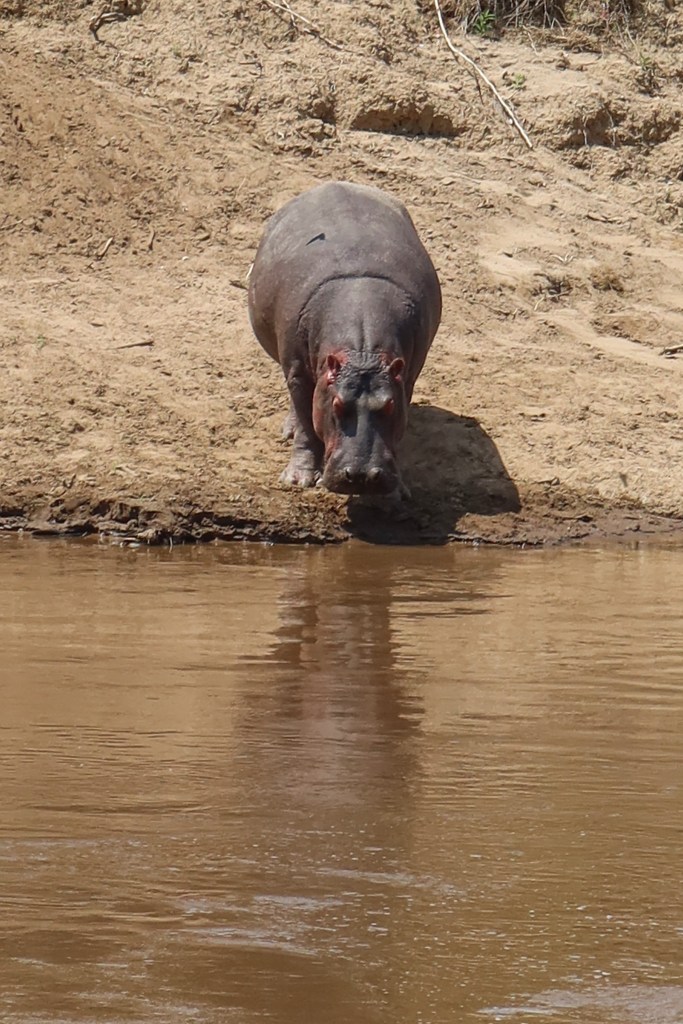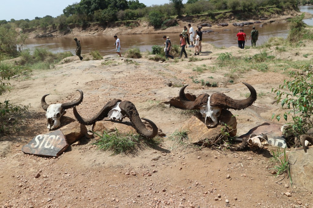 Mangiato il nostro pranzo al sacco e fatte le foto di gruppo intorno al cippo che segna il confine con la Tanzania, John ci offre la possibilità di fare una breve passeggiata a piedi lungo il fiume Mara, accompagnati da due ranger del parco, per vedere gli ippopotami e i coccodrilli. Basta una piccola mancia di 1000 scellini per ciascuno dei due ranger (devono essere due perché siamo in 11 e ci devono scortare e tenere insieme) e quindi perché no? L’idea ci piace. Tra l’altro sul fiume si può vedere anche il punto esatto dove avviene l’attraversamento durante la grande migrazione degli gnu, anche se ora ovviamente possiamo solo immaginarci la scena. Però coccodrilli ce ne sono, e ippopotami tanti, sia in acqua che sulla riva.