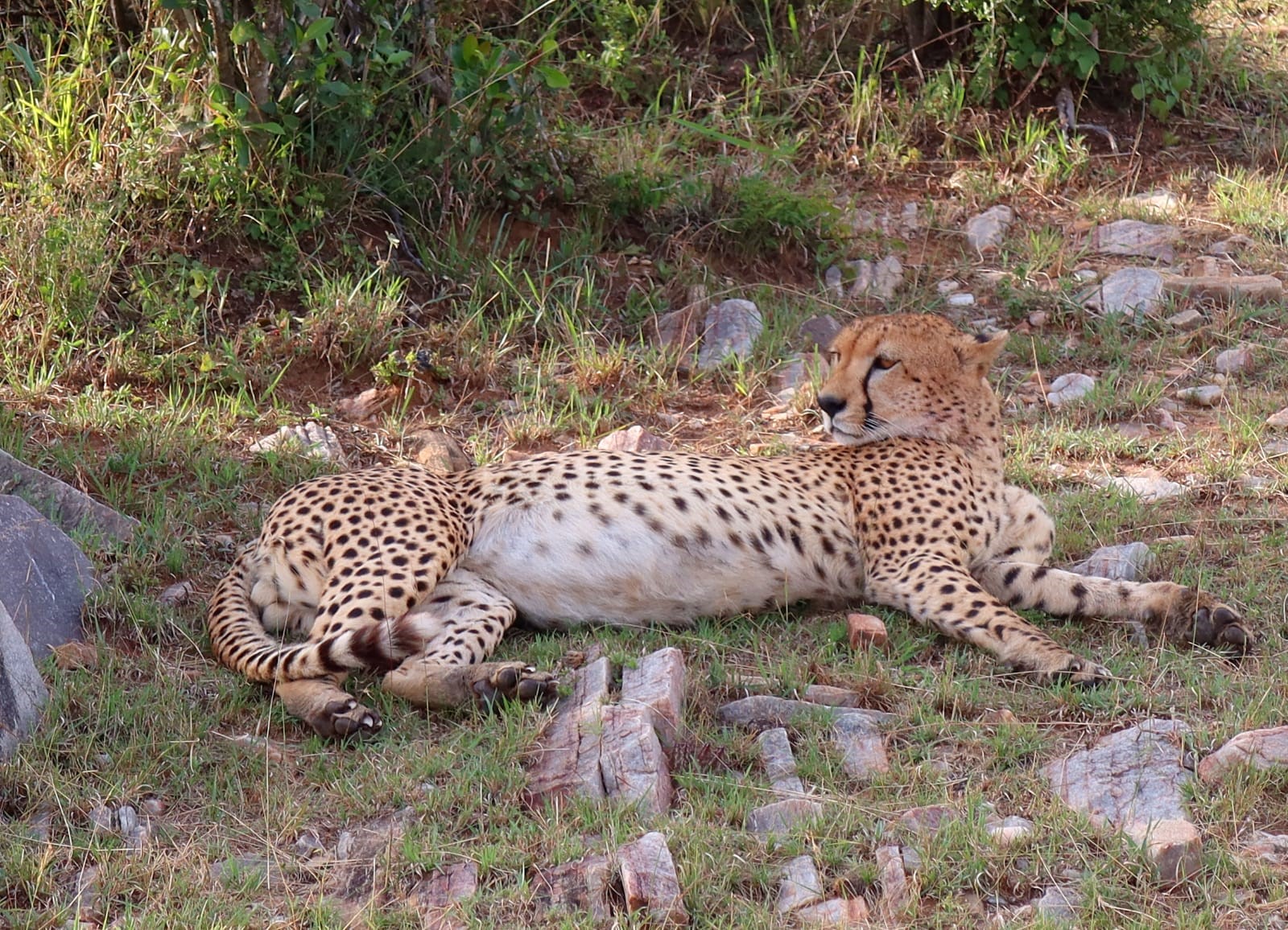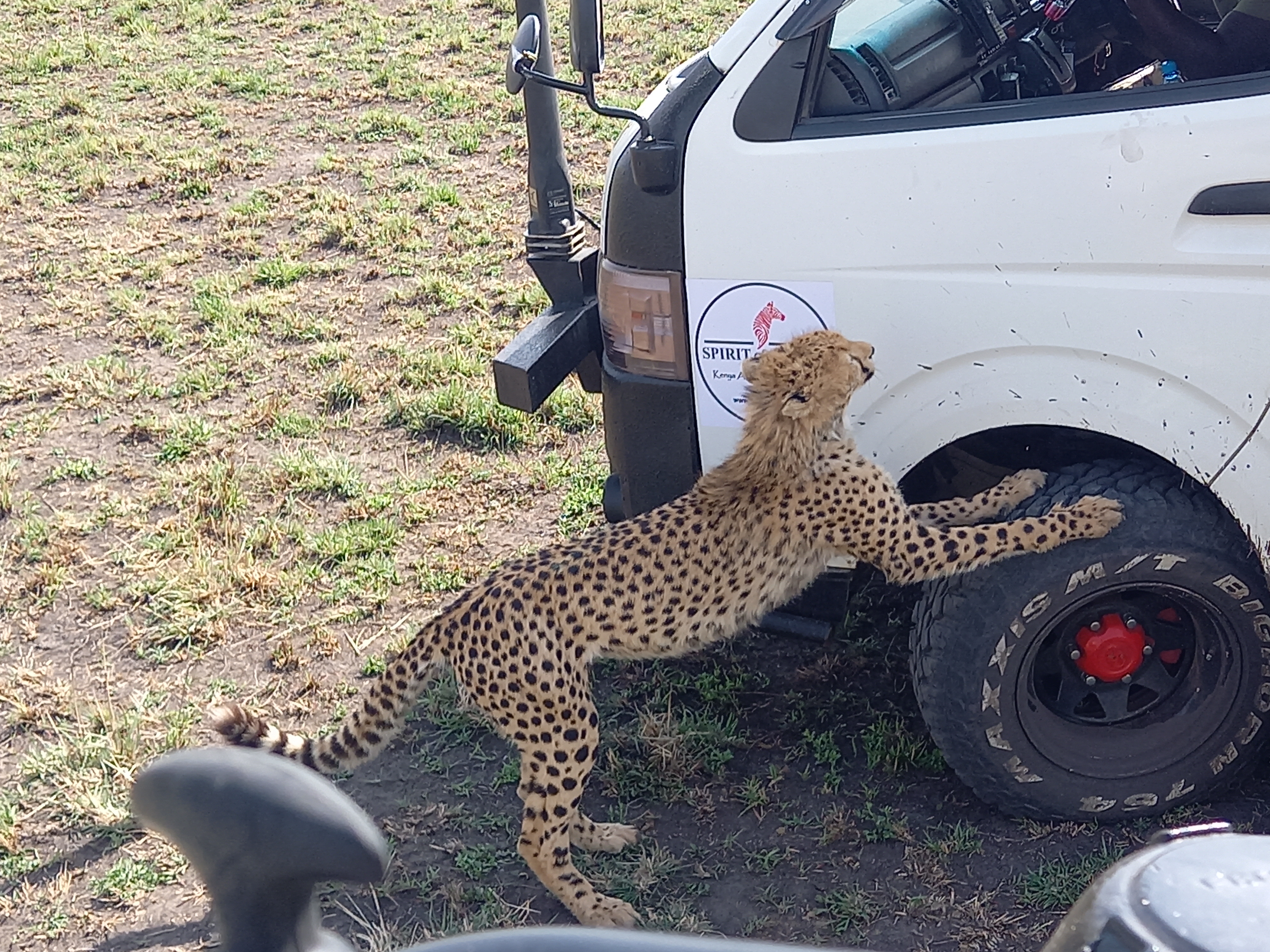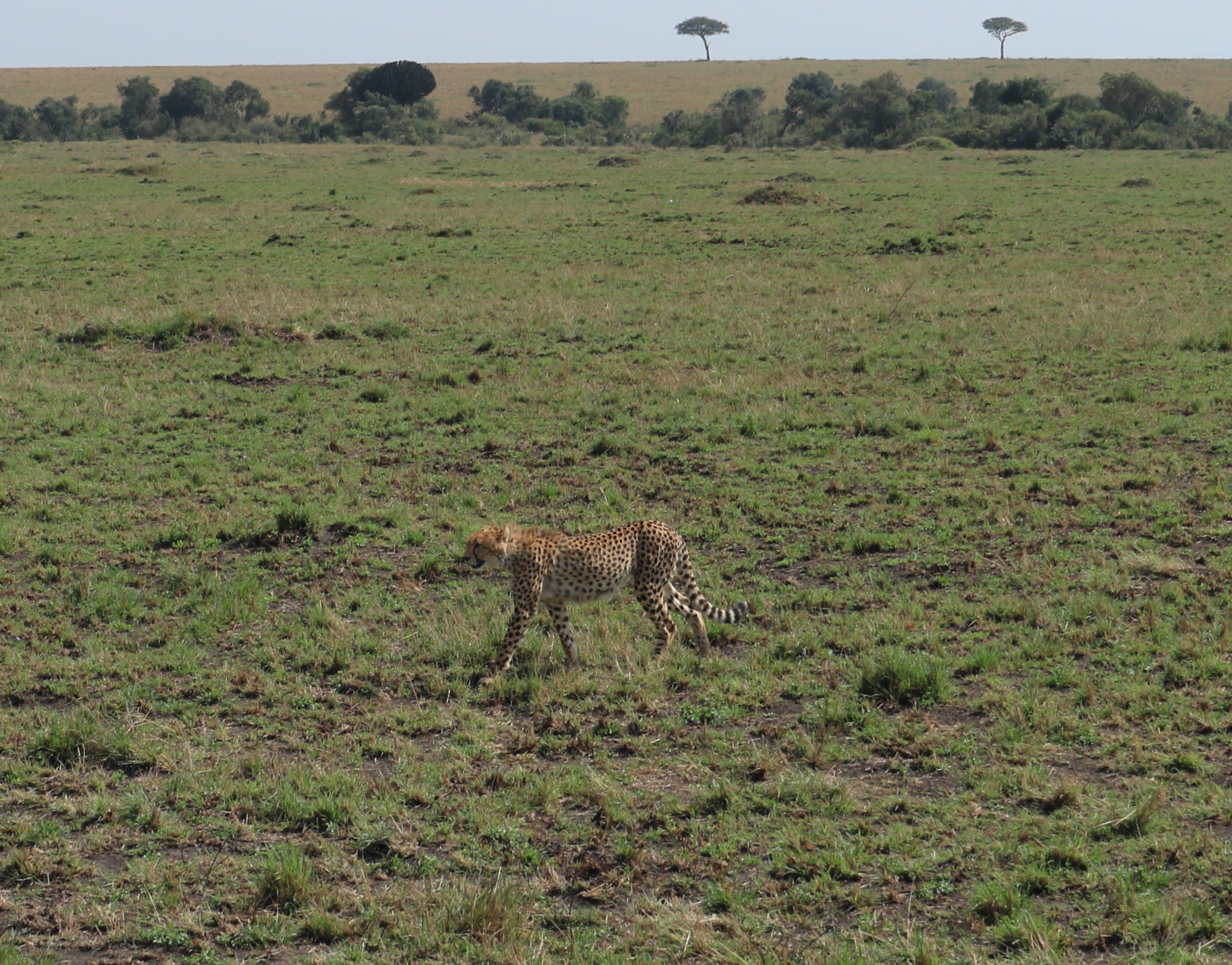 Ma alla fine riusciamo ad entrare e dopo poco c’è la prima sorpresa. Ormai abbiamo capito il meccanismo delle segnalazioni che gli autisti si trasmettono e quindi quando John ascolta la radio e poi prende una certa strada sappiamo che c’è qualcosa di interessante in vista. In questo caso, sono diversi ghepardi che sono molto vicino alla strada e che si possono vedere benissimo, cosa che a quanto sembra è piuttosto rara. John dice che forse stanno dando la caccia a una mangusta; fatto sta che non sembrano per niente intimiditi dalla presenza umana, anzi: se ne stanno lì come placidi gattoni e uno addirittura sale con le zampe anteriori sulla gomma di una jeep. Si sa che il ghepardo è il mammifero più veloce del mondo: secondo alcuni studi potrebbe superare i 100 km/h, ma ancora più stupefacente è la sua accelerazione, dato che può passare da 0 a 100 km/h in 3 secondi. Noi non l’abbiamo visto correre, ma siamo stati comunque davvero fortunati, anche se ancora più difficile da vedere è il leopardo. A differenza del ghepardo, il leopardo ha dei vistosi baffi che il ghepardo non ha e tende a vivere più sugli alberi che a terra, perciò è difficile vederlo in spazi aperti, senza contare che ha abitudini molto più notturne, soprattutto preferisce cacciare la notte. Infatti alla fine il leopardo, che pure è presente qui nel Masai Mara, è rimasto l’unico dei “Big Five” che non siamo riusciti a vedere. I Big Five, che non per niente sono raffigurati anche sulla fiancata della nostra jeep, sono gli animali più simbolici della savana africana: Elefante, rinoceronte, bufalo, leone e appunto il leopardo.