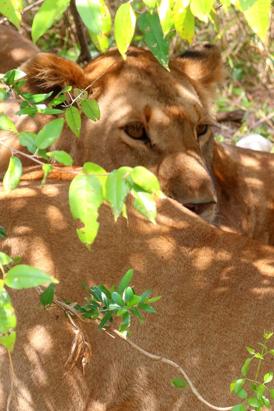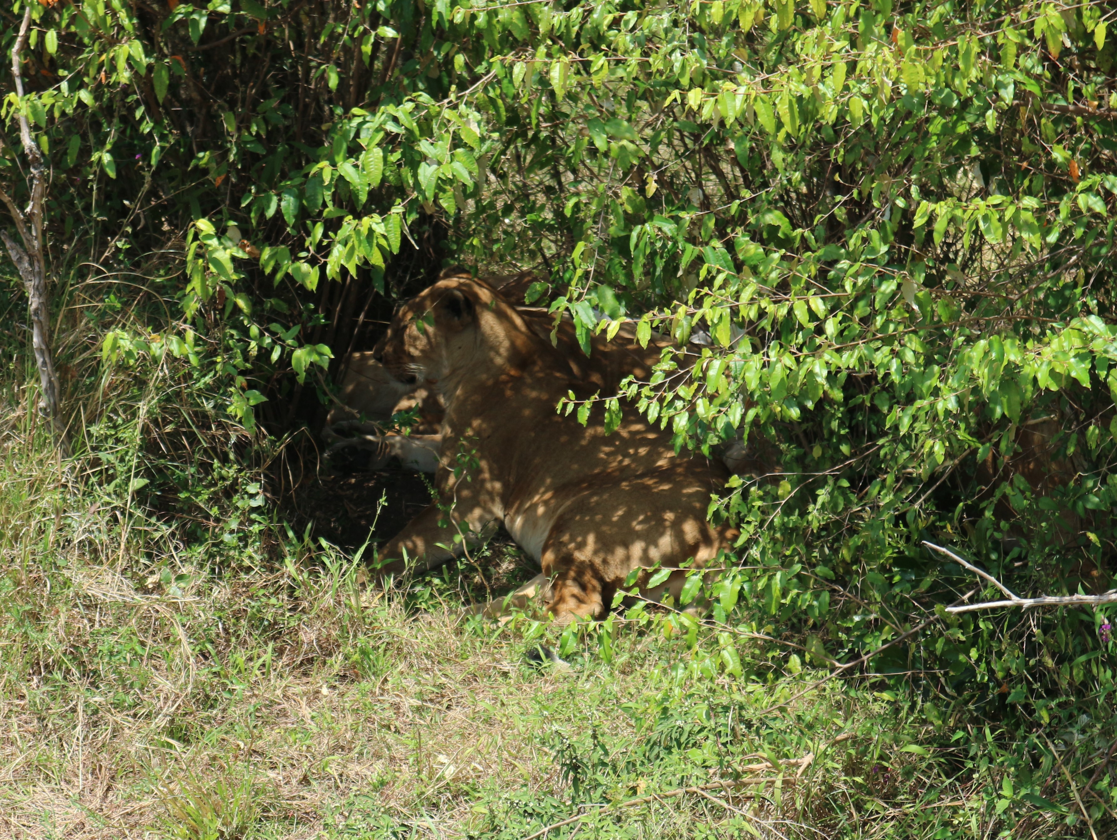 Più verso la tarda mattinata, si presenta poi l’occasione di vedere ancora dei leoni. Questa volta lo si capisce dal fatto che ci sono diversi avvoltoi appollaiati sui rami di un albero, e nelle vicinanze una carcassa. Se stanno lì e non si azzardano ad avventarsi sui resti, è un segnale abbastanza inequivocabile che il predatore è ancora da quelle parti. E infatti, al riparo di un cespuglio stanno dormendo due leonesse e tre leoncini. È difficile poterli vedere bene tra i rami senza poter scendere dalle macchine, ma con binocoli e teleobiettivi si vedono. Il fatto è che, dato che come ormai sappiamo la voce si sparge rapidamente, in pochi minuti sono sul posto 7 jeep (le ho contate), che in continuazione si spostano sgasando intorno al cespuglio, avanti e indietro, per cercare un varco tra i rami su cui puntare gli obiettivi. Devo dire che questa scena un po’ mi ha colpito e non positivamente, mi sembrava una pressione eccessiva su questi animali e un po’ quasi mi dispiaceva esserne parte. C’è da dire, peraltro, che le leonesse si sono svegliate ma non hanno battuto ciglio; non sembravano innervosite, a riprova che gli animali del parco sono ormai abituati alla presenza umana.