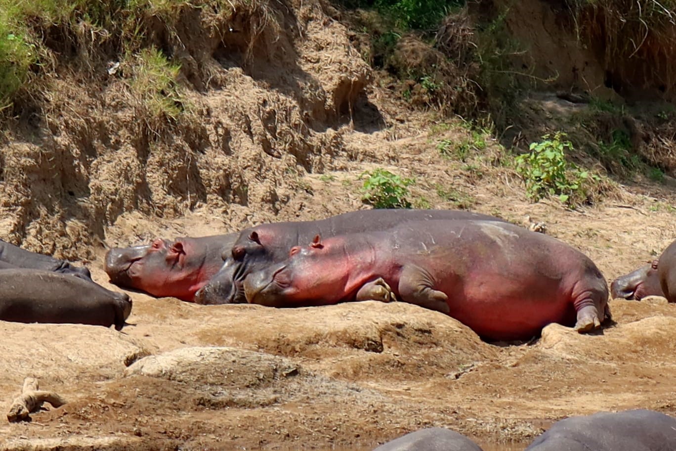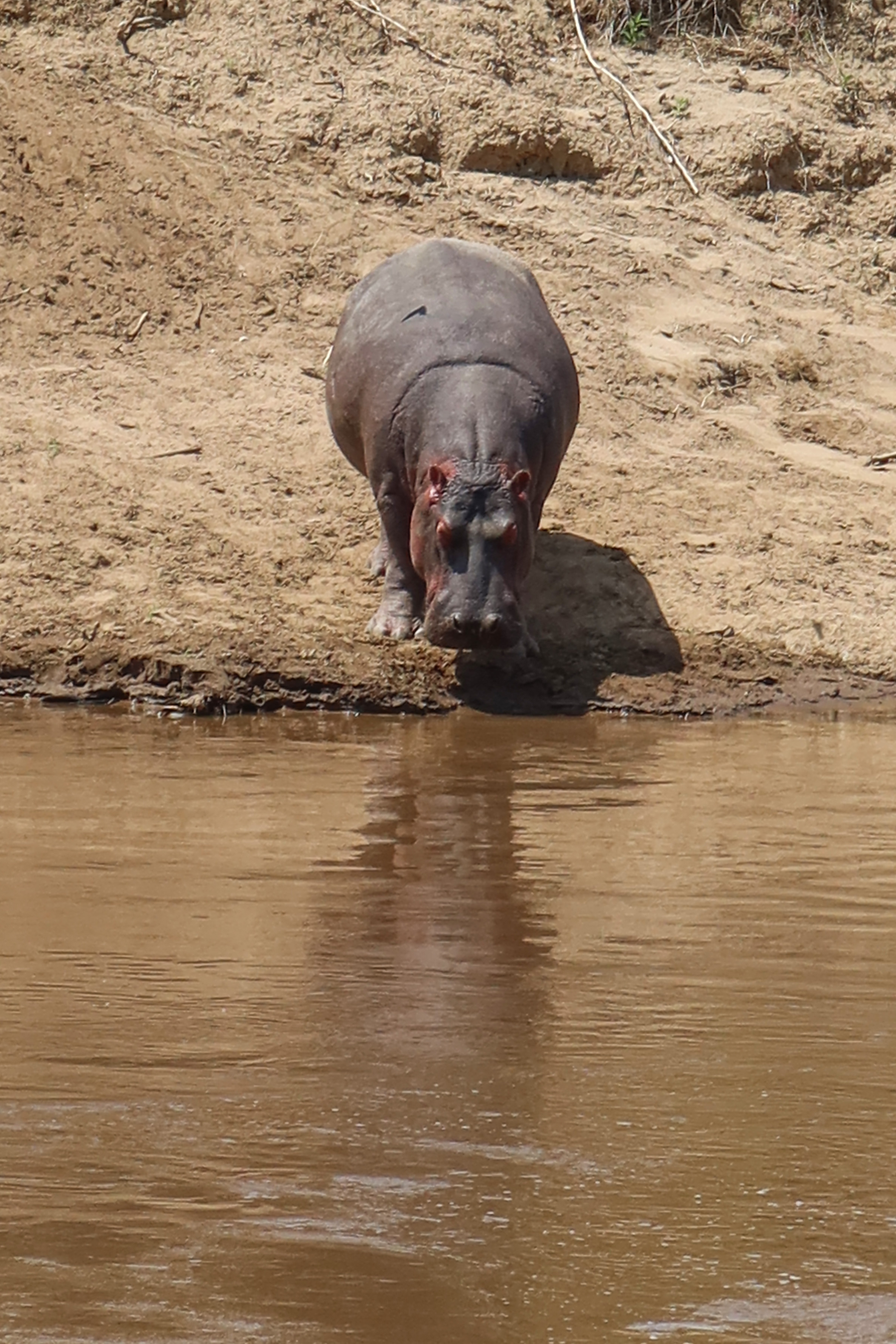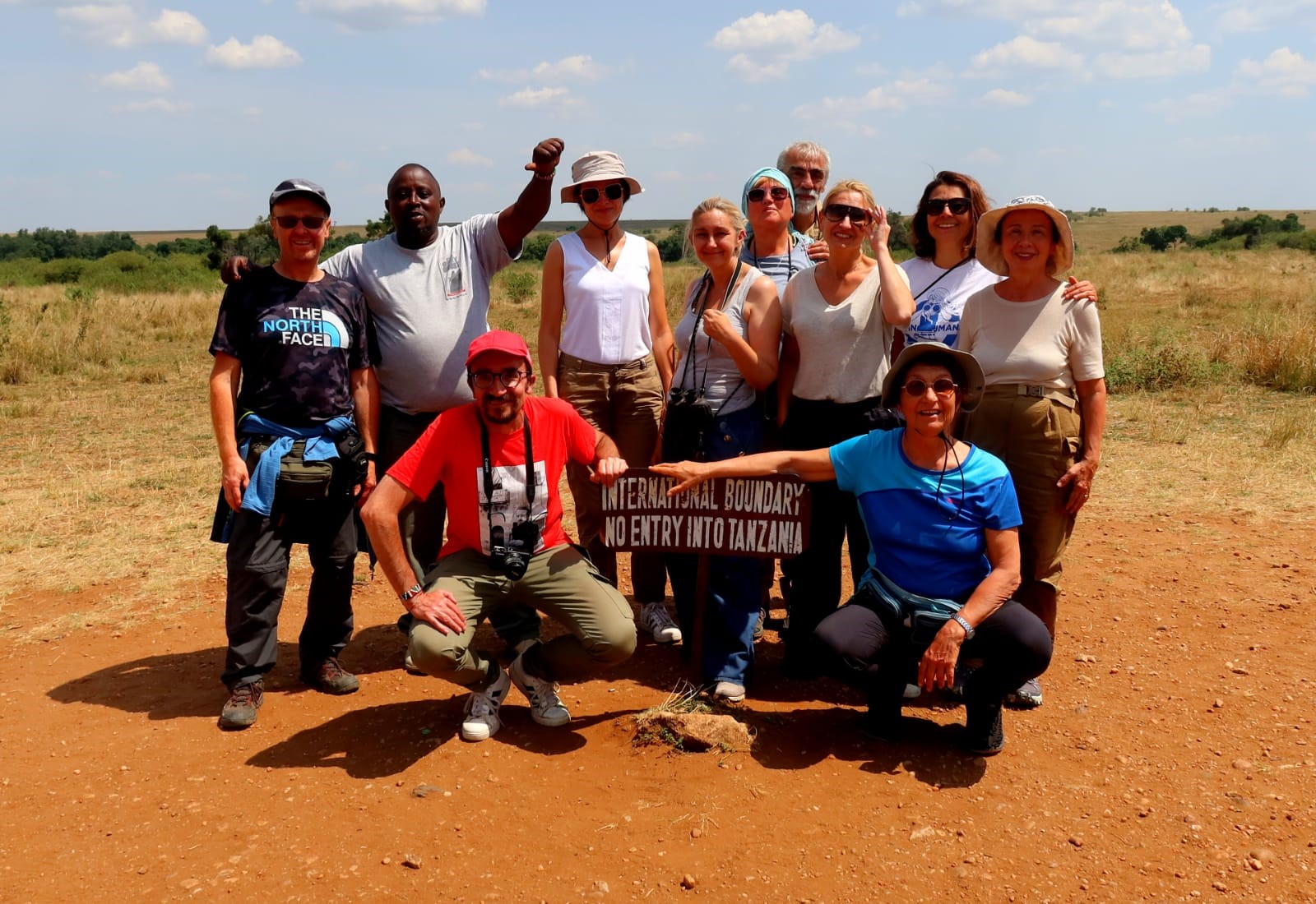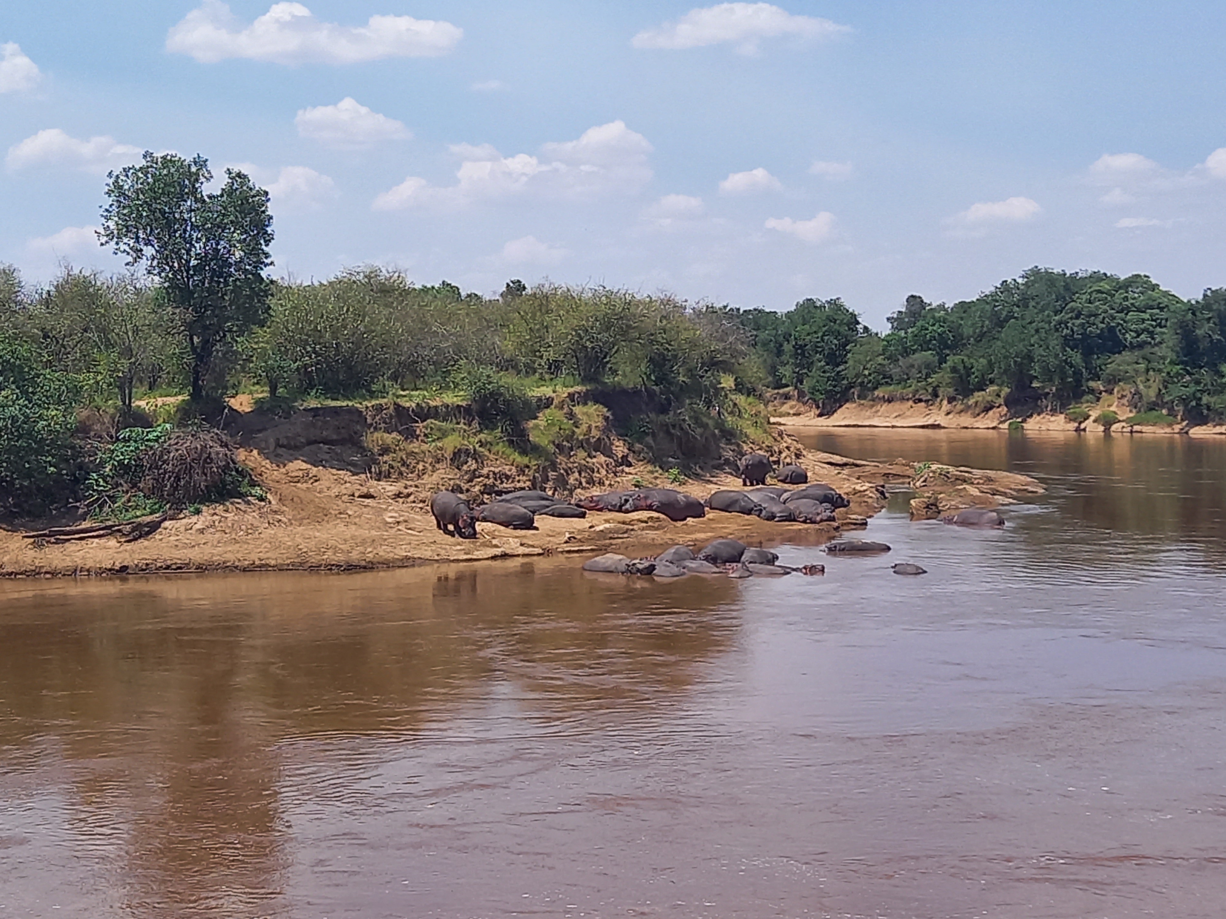 Mangiato il nostro pranzo al sacco e fatte le foto di gruppo intorno al cippo che segna il confine con la Tanzania, John ci offre la possibilità di fare una breve passeggiata a piedi lungo il fiume Mara, accompagnati da due ranger del parco, per vedere gli ippopotami e i coccodrilli. Basta una piccola mancia di 1000 scellini per ciascuno dei due ranger (devono essere due perché siamo in 11 e ci devono scortare e tenere insieme) e quindi perché no? L’idea ci piace. Tra l’altro sul fiume si può vedere anche il punto esatto dove avviene l’attraversamento durante la grande migrazione degli gnu, anche se ora ovviamente possiamo solo immaginarci la scena. Però coccodrilli ce ne sono, e ippopotami tanti, sia in acqua che sulla riva.