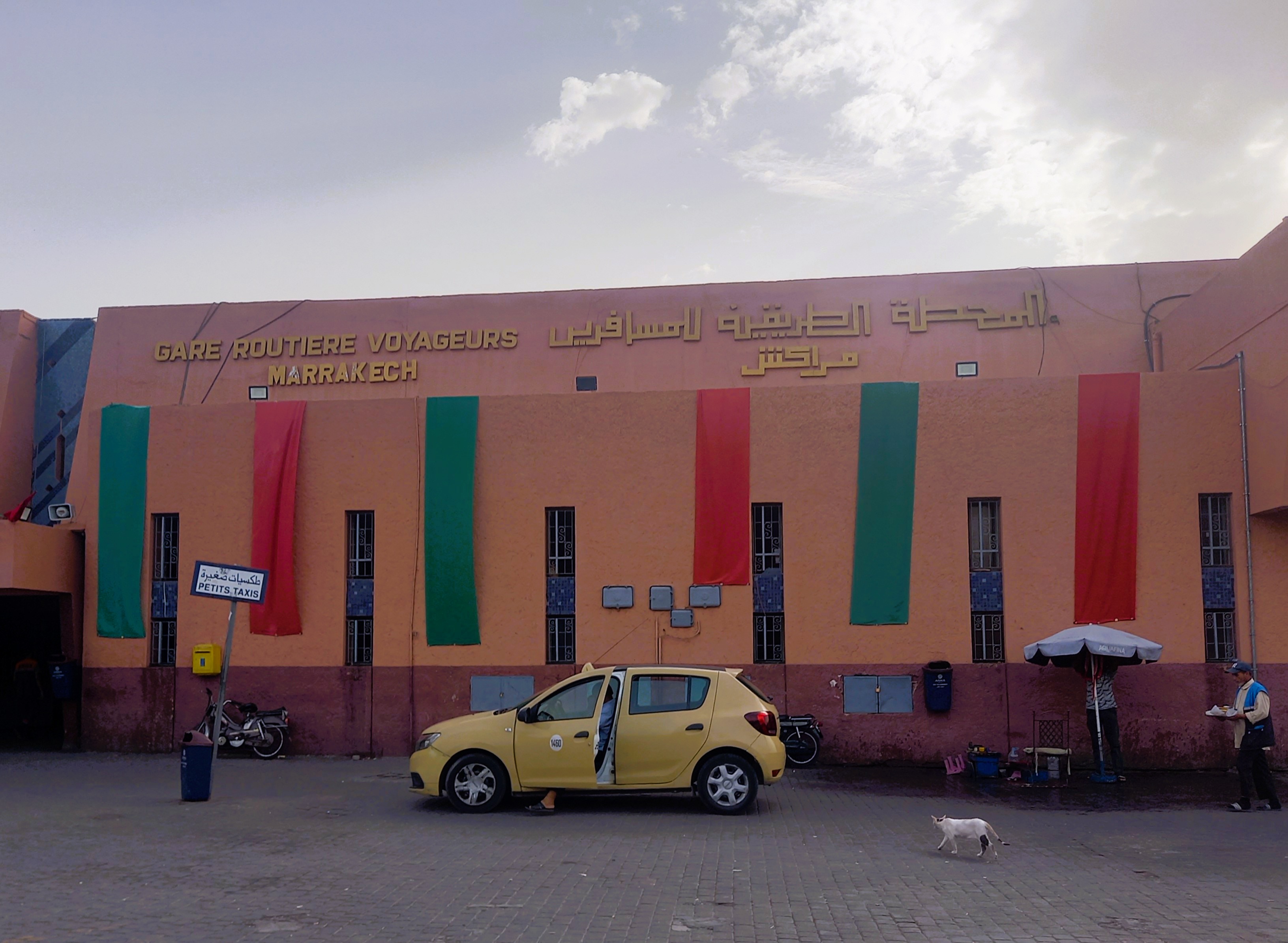 Il caldo di Marrakech in agosto è sempre impressionante, a maggior ragione ora che vengo da una Milano insolitamente fresca, per il periodo, e quindi lo stacco si sente ancora più forte. Una rapida corsa su un petit taxi (così in Marocco si chiamano i taxi cittadini) color sabbia come tutti quelli di Marrakech e siamo alla Grande Gare Routiere, la grande stazione degli autobus. Sono passato di qui così tante volte che ho deciso di mettere una foto di questo posto sulla home page del mio blog, quindi me la ricordo bene, anche se ora erano otto anni che non ci mettevo piede.