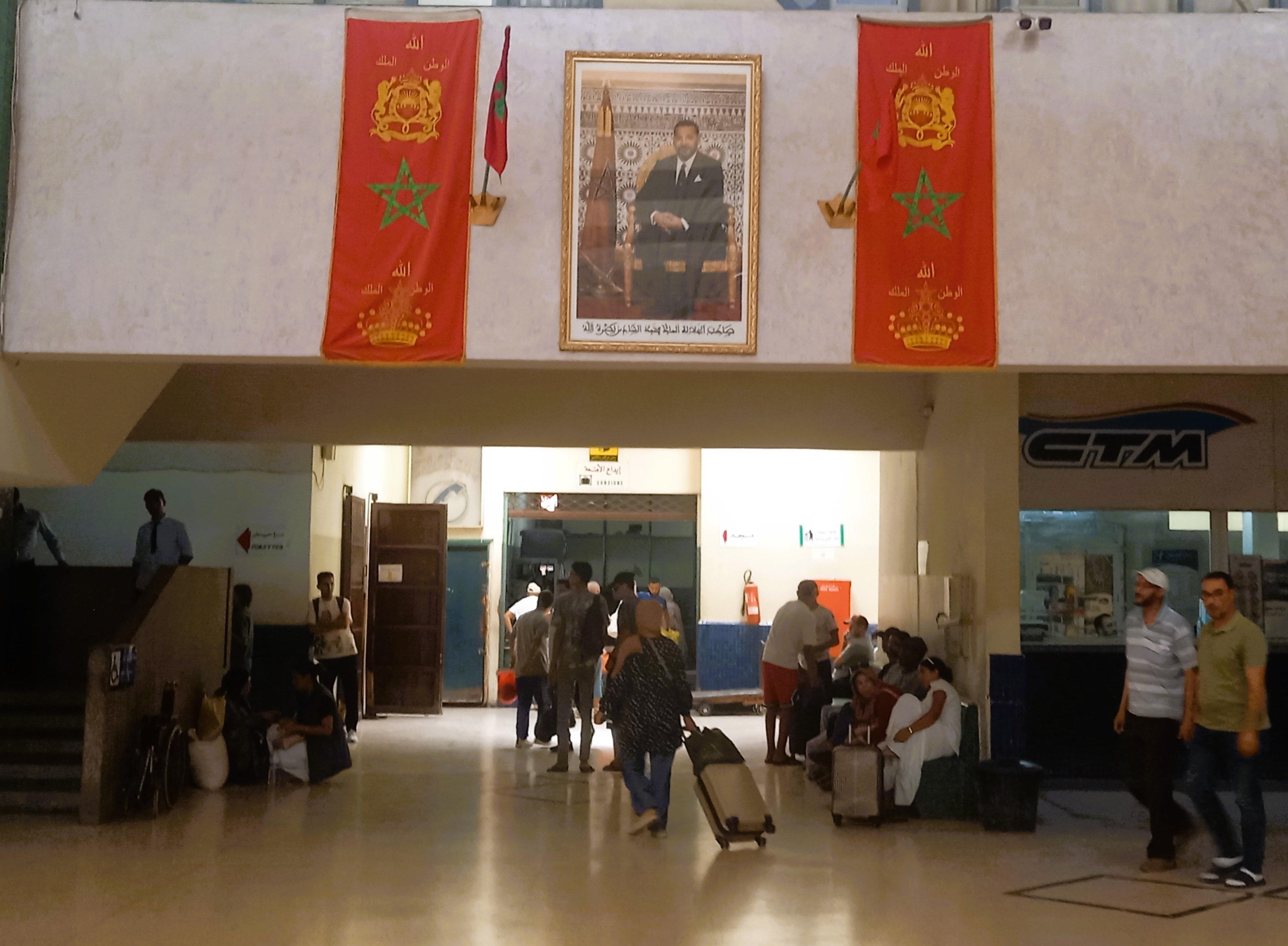Questa volta mi sono informato prima e so anche come si chiama l’unica compagnia che fa il tragitto che mi interessa, verso Azilal: Itrane. Sì, peccato che non sia molto utile saperlo se i nomi sulle insegne degli sportelli sono solo in arabo, però per fortuna ci sono, scritte in alfabeto latino, almeno le destinazioni, quindi ci metto poco a individuare lo sportello giusto. Vado per comprare il biglietto, ma allo sportello 18 non c’è nessuno; chiedo a fianco, al 19, e mi mandano alla banchina, nel piazzale esterno dove partono i bus. Pare che si possa comprare il biglietto lì. Lì però mi dicono di andare in biglietteria. Ok, ho tempo prima della partenza, che non dovrebbe essere prima delle 12. Facilmente sarà dopo, perché questi autobus aspettano sempre un po’ prima di partire, se non sono pieni. Aspetto un po’, torno allo sportello 18 e li trovo che giocano a carte. “È aperto?” – domando. “Sì” – è la risposta. “Bene, vorrei un biglietto per Azilal”. “Devi andare all’altro sportello” (di nuovo al 19). Torno al 19, e lì mi rimandano fuori. Riprovo fuori, e il tipo alla banchina mi rimanda alla biglietteria. Comincio a capire che non è giornata; evidentemente oggi bisogna rivolgersi a un “mediatore” che si prende qualche dirham (un dirham marocchino vale circa 0,10 euro) per il servizio, anche se un cartello ben in evidenza raccomanda di non dar retta a questi personaggi, che da sempre fanno parte della fauna della Grande Gare Routiere. Infatti poco dopo mi avvicina un tizio che mi dice che per il biglietto devo chiedere a lui, e mi fa sedere in attesa insieme a una famiglia di francesi. Anche loro sono un po’ perplessi, ma spiego loro che qui funziona così. Riusciamo finalmente ad avere i nostri biglietti, compreso quello per il bagaglio (per il bagaglio si paga sempre un sovrapprezzo) e ci mettiamo tranquilli in attesa.
