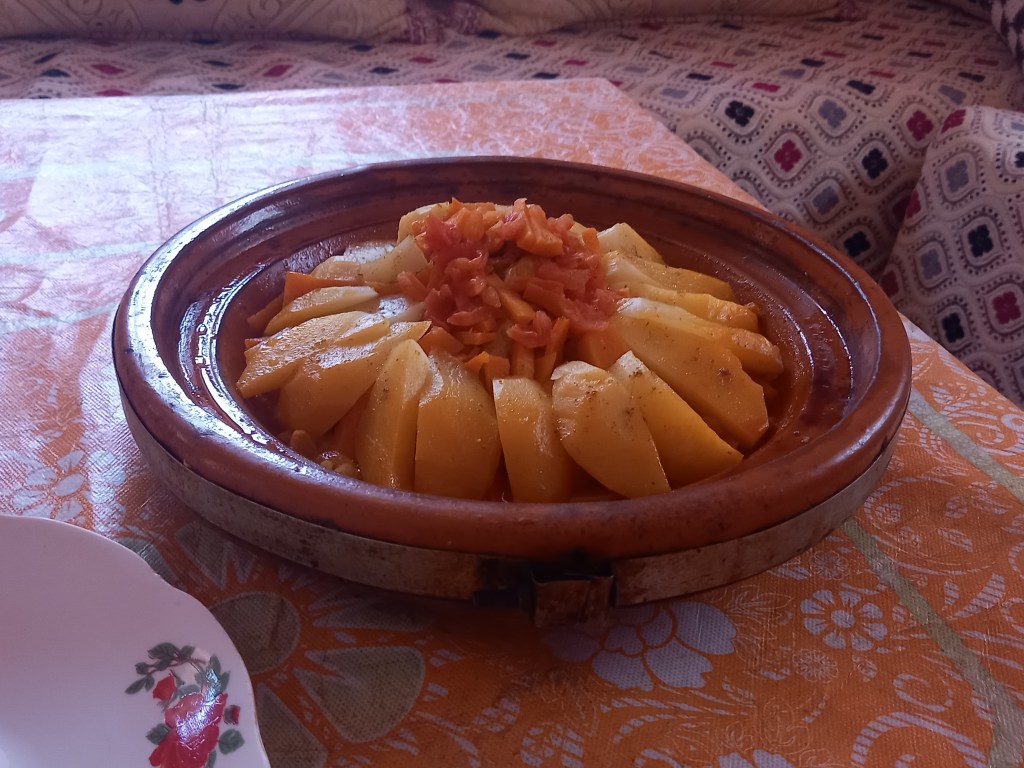 Essendo il resto della famiglia già ad Ait Bouguemez, qui con lui ci sono solo sua madre e sua sorella, che non è sposata. Sono più delle tre, ma ovviamente mi stavano aspettando e hanno preparato per me e per Salah quello che sarà il primo tajine di questo nuovo viaggio marocchino, di pollo con patate e carote. A seguire, succose fette di anguria e melone bianco.