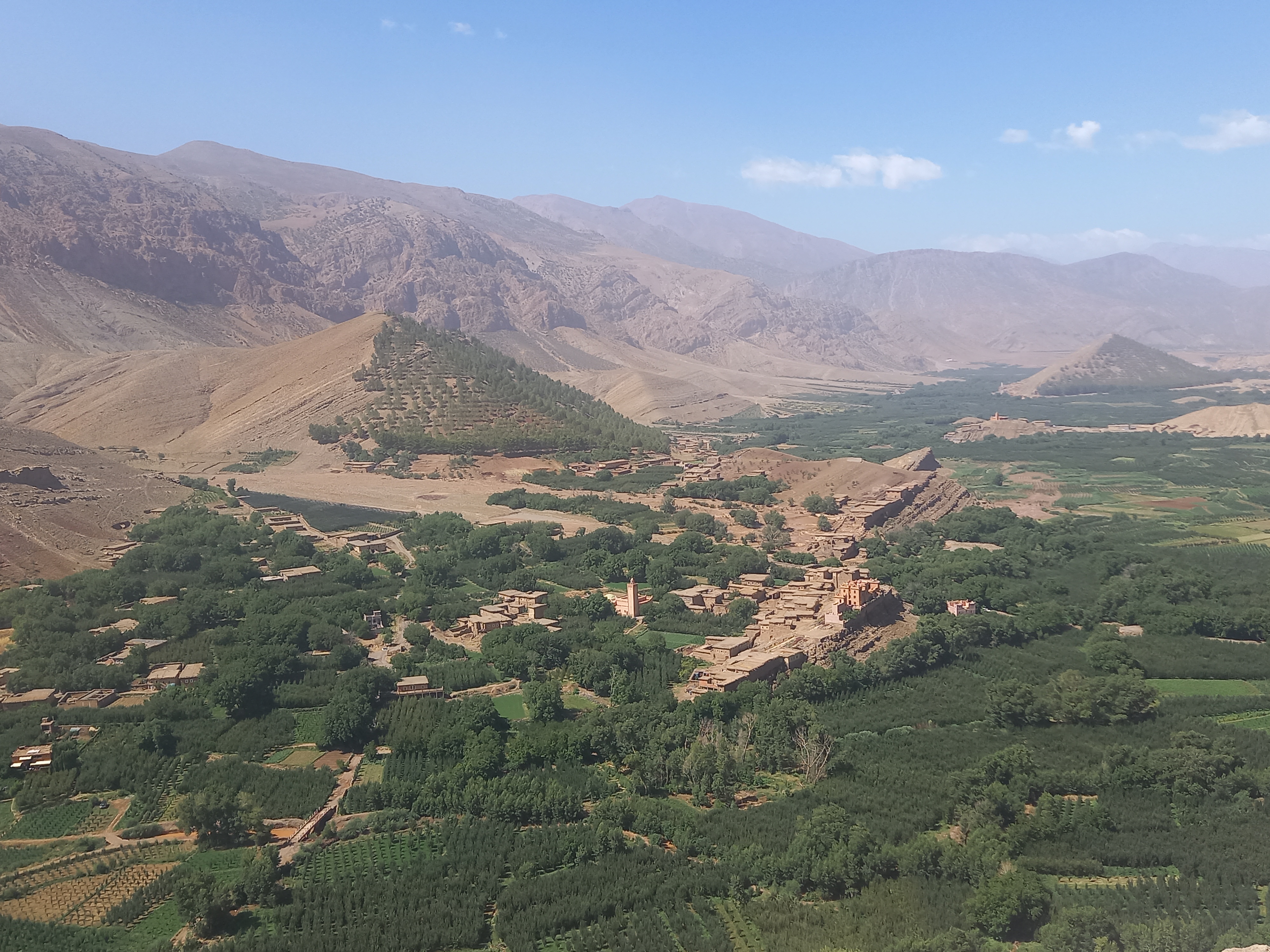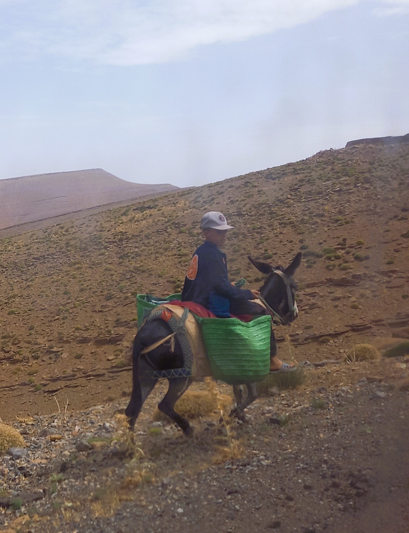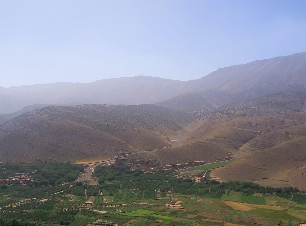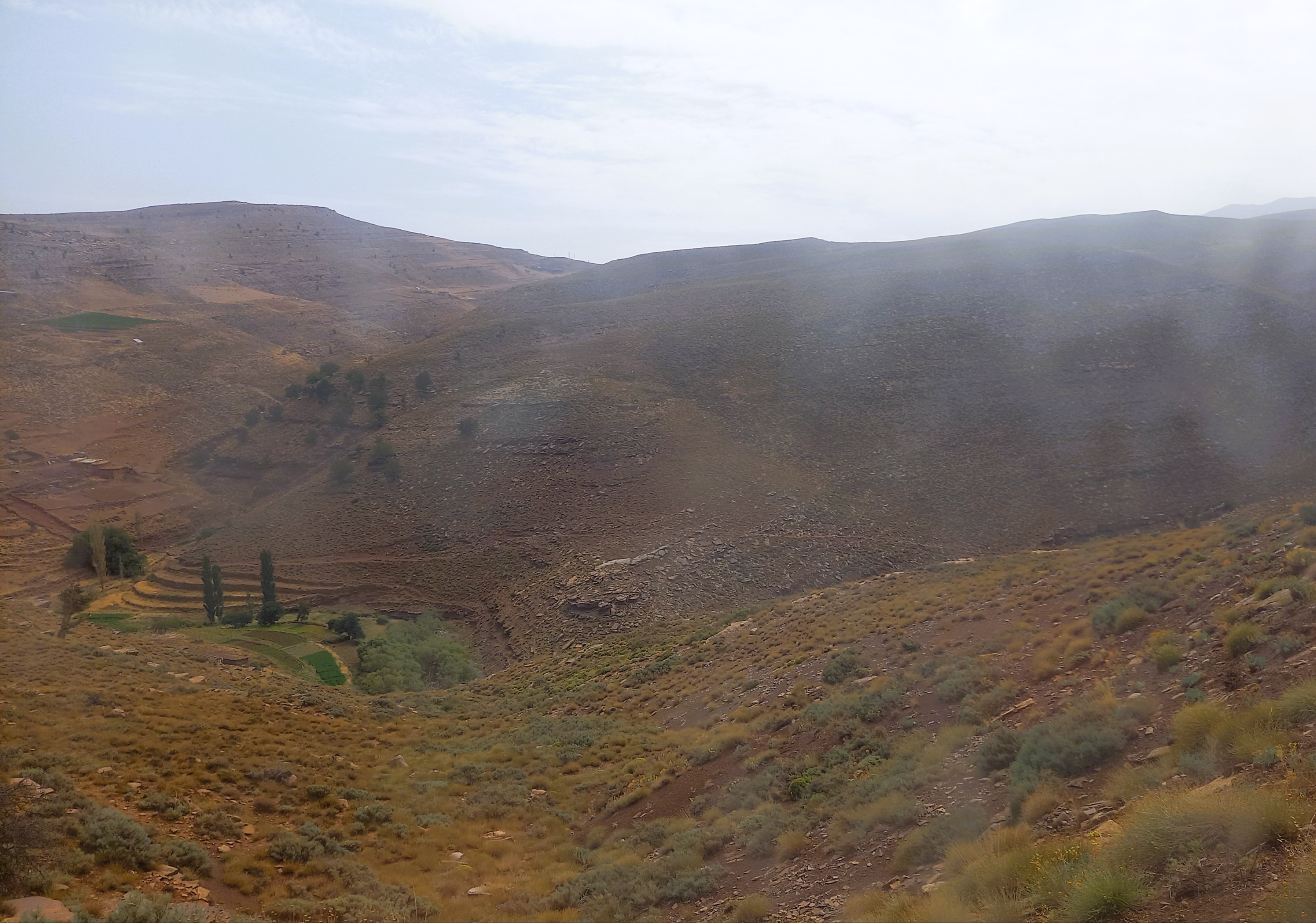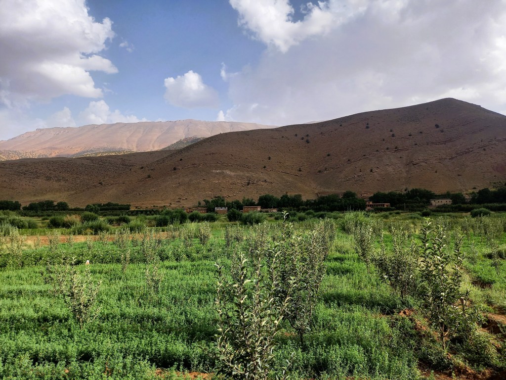 Anche i ripidi fianchi dei monti sono utilizzati nelle coltivazioni terrazzate, per cui si vedono piccoli fazzoletti coltivati a orzo o a granturco, su gradoni riparati, ad altitudini dove generalmente questo tipo di coltivazione è impensabile. Qui si raccolgono piante montane selvatiche per produrre rimedi di erboristeria, altro fatto per cui la valle va famosa. I villaggi si fondono quasi mimeticamente con i loro spettacolari scenari. Uno di questi villaggi è Aguerd N’Ouzrou, dove vivono i parenti di Maryam, la moglie di Salah. Siamo nei dintorni di Tabant, a 1850 m di quota.