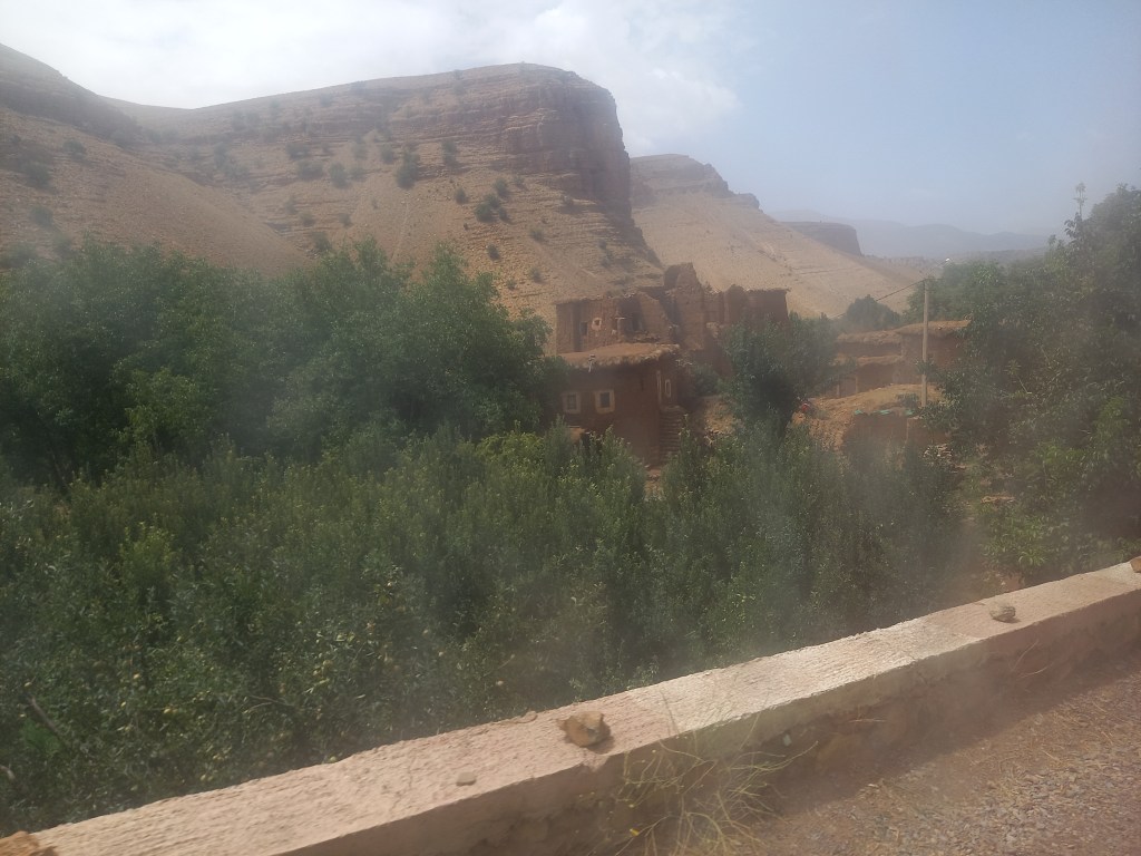 Da Azilal a Tabant ci sono circa 80 km, ma è una strada di montagna non delle più agevoli, per cui il viaggio richiede almeno un paio d’ore. Per fortuna questa volta siamo seduti comodi sul sedile posteriore con il re al finestrino, e quindi, caldo a parte, ci va piuttosto bene. Su questo tipo di pullmini non è infrequente che si carichino più persone della teorica capienza, infatti ci sono sempre degli sgabelli di plastica da piazzare nel corridoio e in tutti gli angoli possibili per aumentare i posti disponibili. La strada non è agevole ma è davvero spettacolare, sia per il paesaggio lunare creato dalle montagne sia per i villaggi fatti tutti di casette costruite in pisé, ovvero in terra cruda mischiata con fango e paglia. Qui il colore della terra, diversamente da altre zone del Marocco, non tende al rosso ma più a qualcosa tra il beige e il giallo ocra. Le case hanno lo stesso colore della terra e creano quindi un insieme armonioso, dove il paesaggio naturale e quello costruito diventano come una cosa sola. Caratteristica della valle è anche l’abitudine di aggiungere una bordatura di pietra bianca alle finestre.