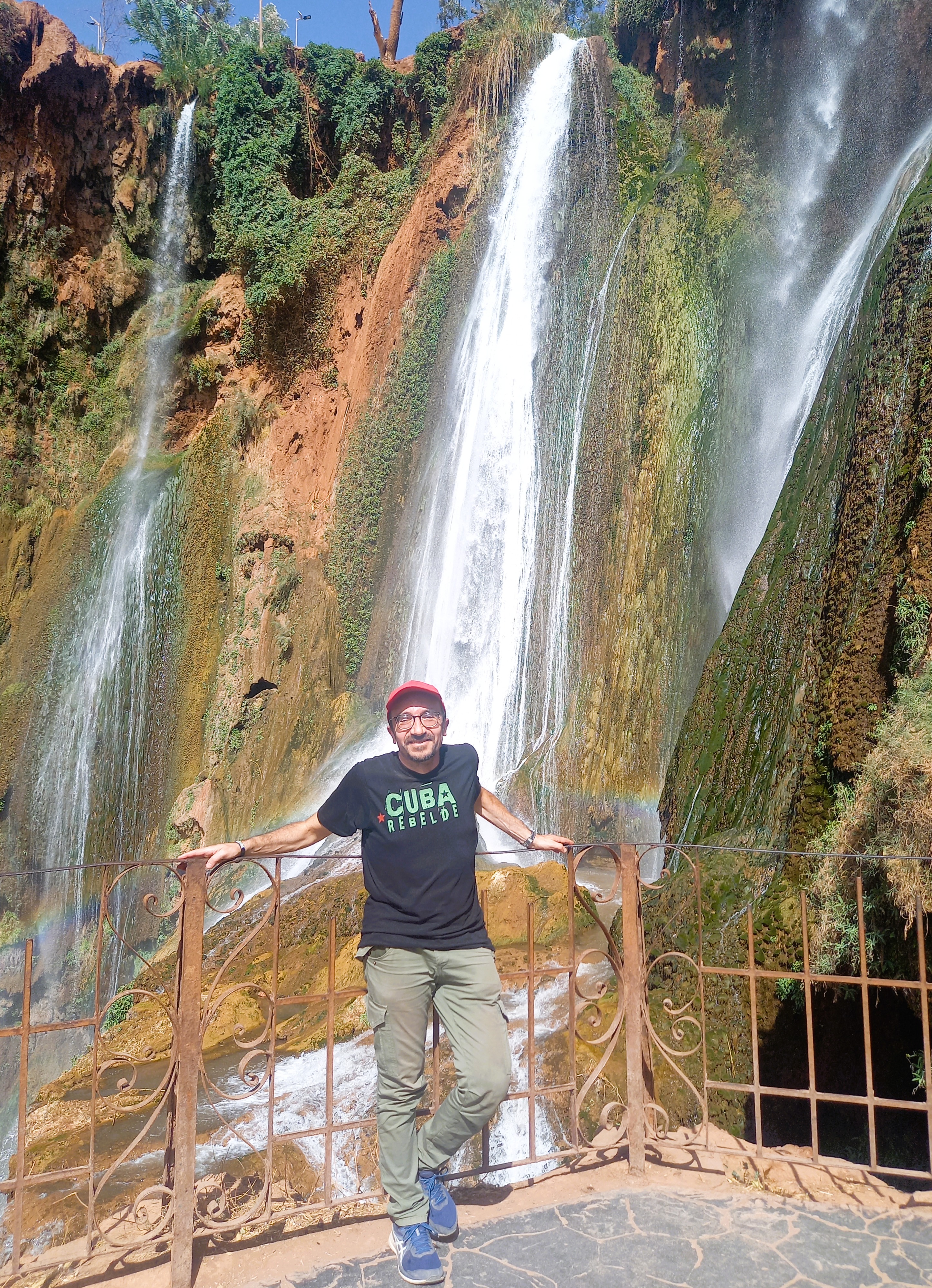 Mi riposo un po’ ma poi chiedo a Salah un ultimo favore: vorrei andare con lui ancora una volta alle cascate, visto che un po’ di tempo ci avanza. È la quinta volta che ci vado, e lui mi ha già raccontato che in questi otto anni sono diventate un’attrazione turistica ancora più popolare, con tutto ciò che ne consegue, ma voglio vedere coi miei occhi. Come sempre mi accontenta e partiamo in taxi. Arrivandoci faccio perfino fatica a riconoscere il posto. Al posto del souk di quattro bancarelle ora c’è un megaparcheggio. Il sentiero che scendeva alla base delle cascate che avevamo percorso la prima volta è diventato una scalinata, ma per la verità era già così otto anni fa. Lo step in più è che ai lati della scalinata sono spuntati come funghi decine di bar, ristoranti e negozi di souvenir: ormai è una successione ininterrotta. Una folla scende verso le cascate mentre uno dei bar spara musica reggaeton a tutto volume. I turisti, come sempre, sono un mix di stranieri e marocchini, ma tanti, probabilmente anche perché è venerdì.