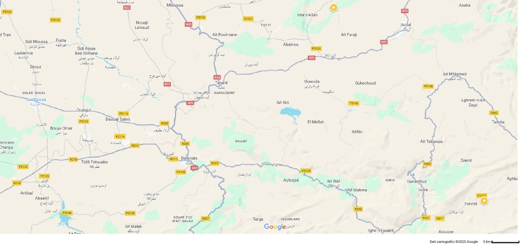 Ok, fine del riassunto delle puntate precedenti. Il programma di quest’anno è ancora lo stesso: andrò da lui a casa sua ad Ait Taguella, 17 km dalle cascate di Ouzoud, dormirò una notte lì e il giorno dopo partiremo insieme per raggiungere la sua famiglia, che si trova già dal fratello della moglie, in un villaggio alle porte di Tabant, valle di Ait Bouguemez. I più attenti, se hanno letto il diario del 2017, avranno notato che questa volta, rispetto a otto anni fa, ho deciso di cambiare grafia per scrivere il nome della valle. Come tutti i nomi arabi, anche questo può essere traslitterato in vari modi. Mi pare che questa grafia, rispetto ad “Ait Bougomez”, sia più diffusa e più adatta a tradurre in lettere dell’alfabeto latino come lo sento pronunciare. Staremo lì due giorni, poi torneremo a casa sua e, dopo un’altra notte lì, partirò verso Fes per unirmi a un tour organizzato da Viaggiemiraggi. Ho scelto un tour del nord che è la parte del Marocco che conosco meno. Andremo da Fes a Tangeri passando per Chefchaouen, Tetouan e i monti del Rif. Ma questo dopo, per ora si parte verso Ait Taguella, tra Tanant e Azilal, 150 km a nordest di Marrakech.