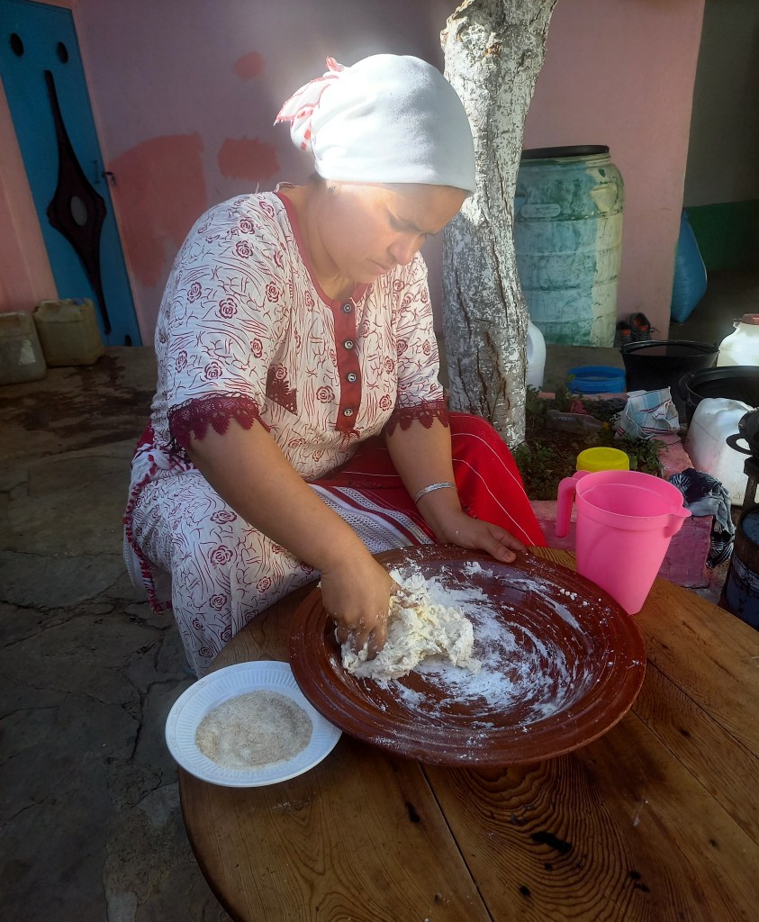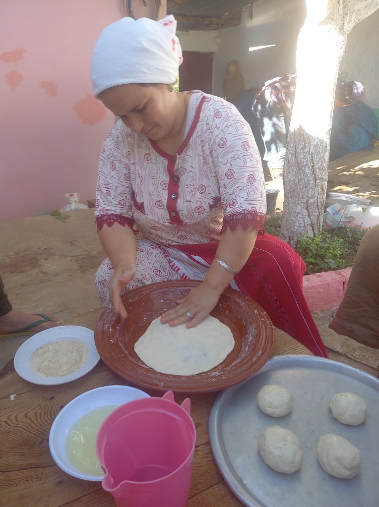 Colazione, e poi arriva il momento della… lezione di msemmen. Si parte dall’impasto, che come abbiamo detto è un impasto molto semplice, ma poi la sfida è riuscire a stenderlo come si deve, aggiungere un po’ d’olio quando serve e ripiegarlo con cura.