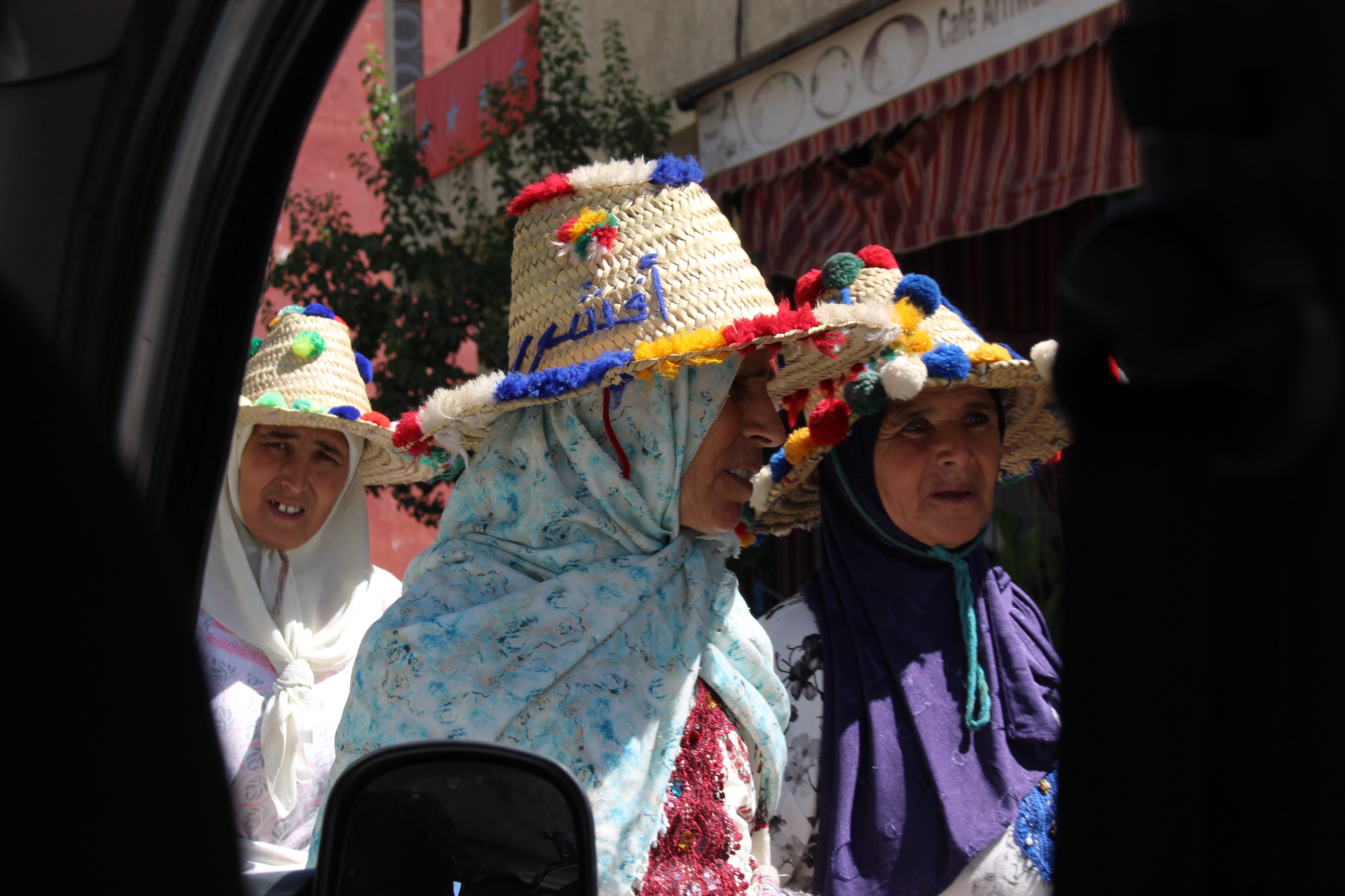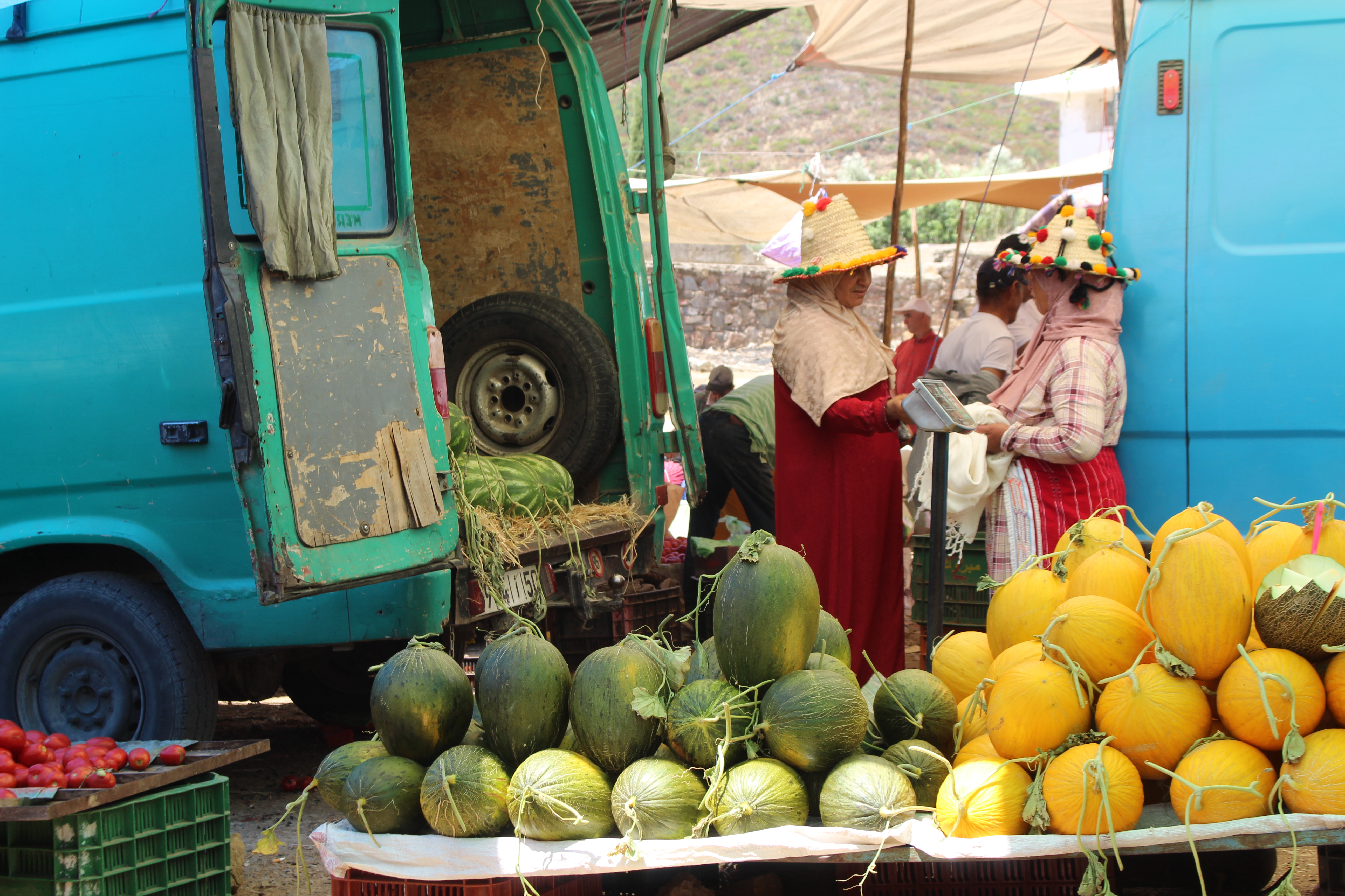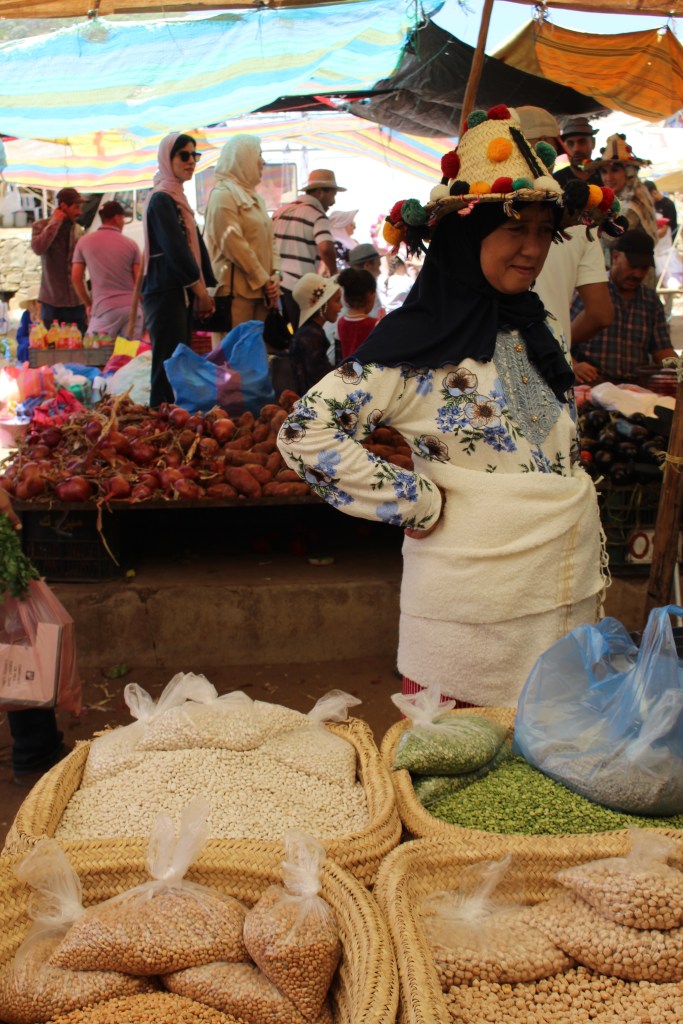 Ci beviamo qualcosa di fresco e poi abbiamo l’occasione di tuffarci in un vero ruspante souk di montagna; nulla a che vedere con quelli, pur belli, che si possono vedere nella medina di Fes. Anche quelli sono veri, non sarebbe giusto dire che siano “solo” turistici però, soprattutto nelle vie più “trafficate”, c’è un po’ quella componente, ed è inevitabile che sia così. Non è per forza peggio, né per forza meglio, è semplicemente qualcosa di diverso. Qui i soli stranieri siamo noi, tant’è vero che alcuni ci salutano e molti ci guardano con curiosità. Una ragazza ci ha anche chiesto, in un ottimo inglese (è una studentessa), da dove veniamo, come mai siamo da queste parti e che giro abbiamo fatto in Marocco. Evidentemente non è cosa di tutti i giorni vedere viaggiatori stranieri che si aggirano tra queste bancarelle. Molte donne sono agghindate con i tradizionali cappelli di paglia berberi di queste parti, decorati con pompon colorati. Per loro il giorno di mercato è anche giorno di festa. Secondo la tradizione, le donne “single” dovrebbero portare cappelli molto decorati e colorati, mentre i cappelli di quelle sposate dovrebbero essere adornati solo da cordini e pompon neri, ma può succedere anche di vedere nero e colori insieme.