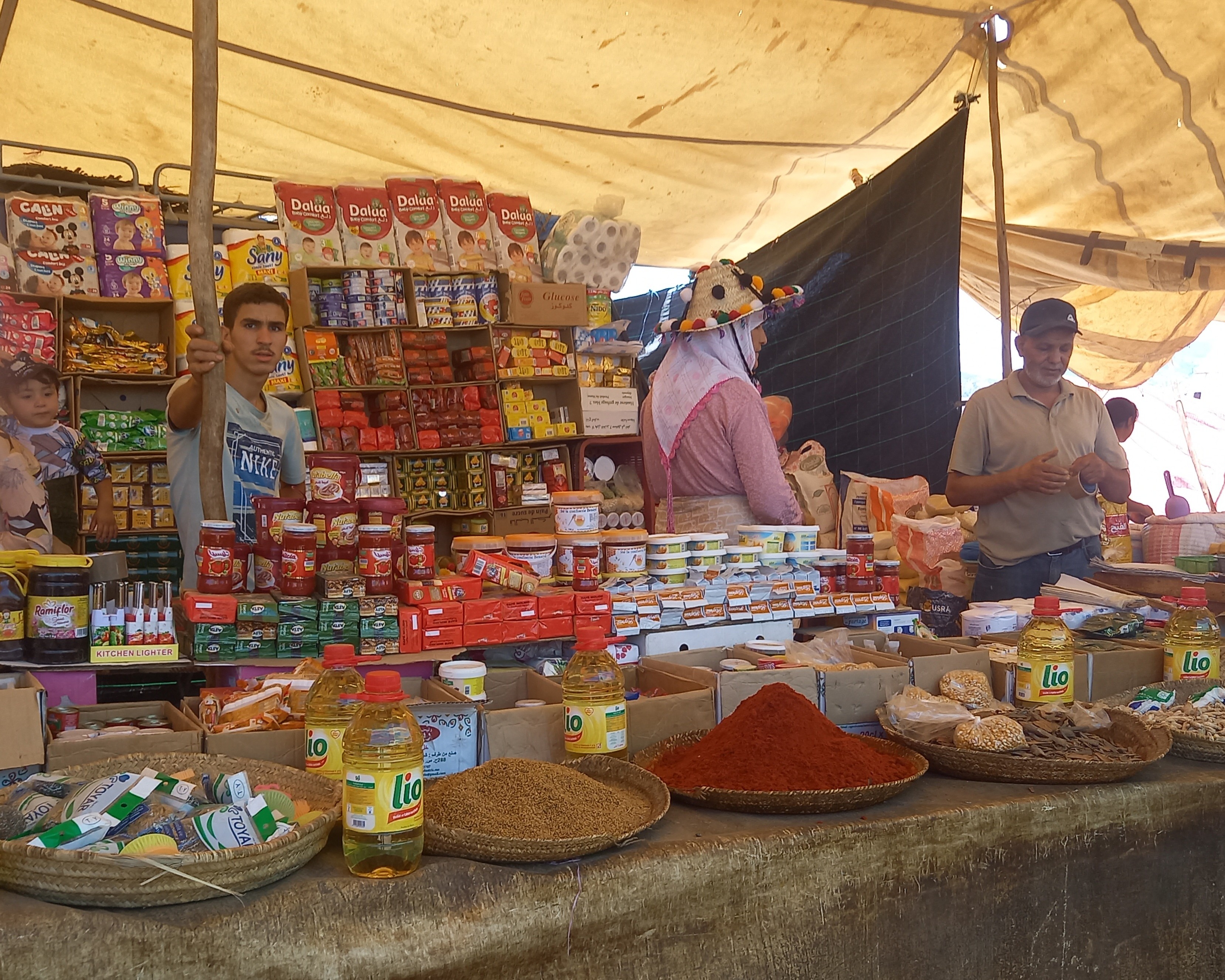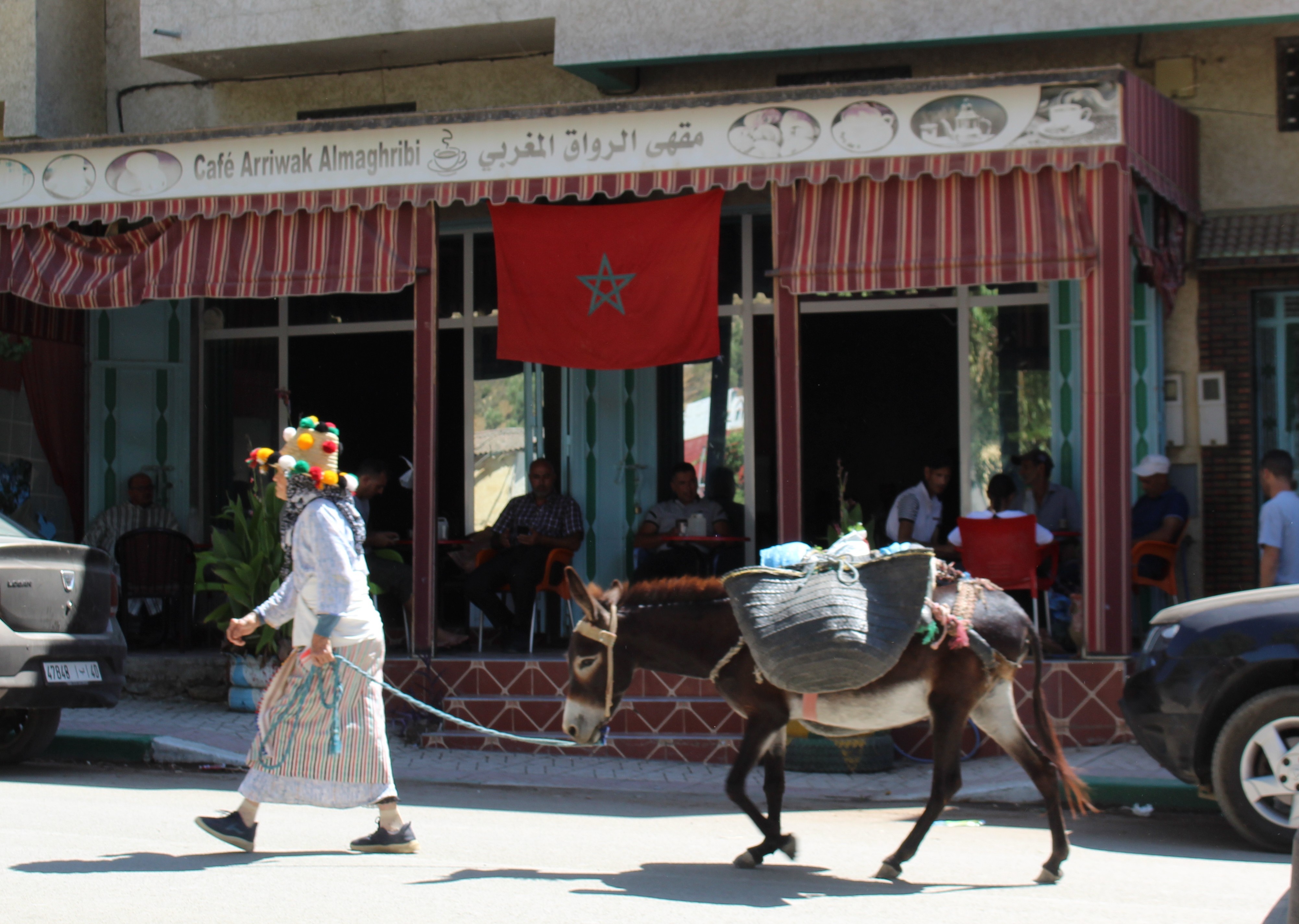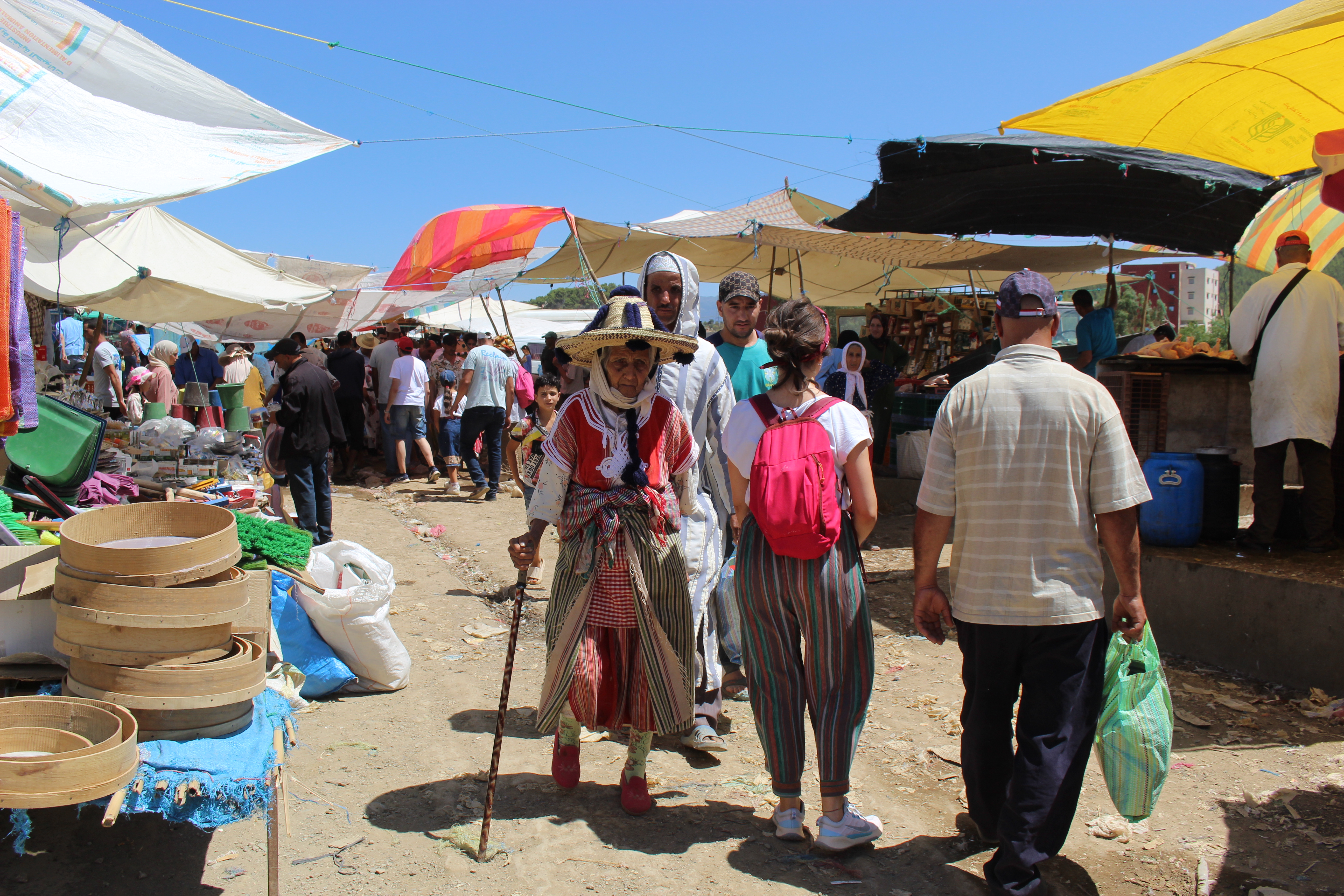 Ci beviamo qualcosa di fresco e poi abbiamo l’occasione di tuffarci in un vero ruspante souk di montagna; nulla a che vedere con quelli, pur belli, che si possono vedere nella medina di Fes. Anche quelli sono veri, non sarebbe giusto dire che siano “solo” turistici però, soprattutto nelle vie più “trafficate”, c’è un po’ quella componente, ed è inevitabile che sia così. Non è per forza peggio, né per forza meglio, è semplicemente qualcosa di diverso. Qui i soli stranieri siamo noi, tant’è vero che alcuni ci salutano e molti ci guardano con curiosità. Una ragazza ci ha anche chiesto, in un ottimo inglese (è una studentessa), da dove veniamo, come mai siamo da queste parti e che giro abbiamo fatto in Marocco. Evidentemente non è cosa di tutti i giorni vedere viaggiatori stranieri che si aggirano tra queste bancarelle. Molte donne sono agghindate con i tradizionali cappelli di paglia berberi di queste parti, decorati con pompon colorati. Per loro il giorno di mercato è anche giorno di festa. Secondo la tradizione, le donne “single” dovrebbero portare cappelli molto decorati e colorati, mentre i cappelli di quelle sposate dovrebbero essere adornati solo da cordini e pompon neri, ma può succedere anche di vedere nero e colori insieme.